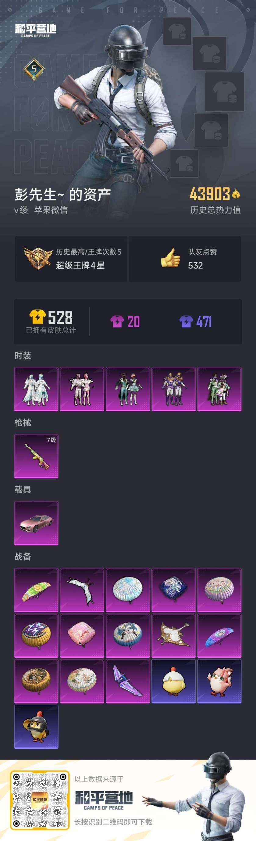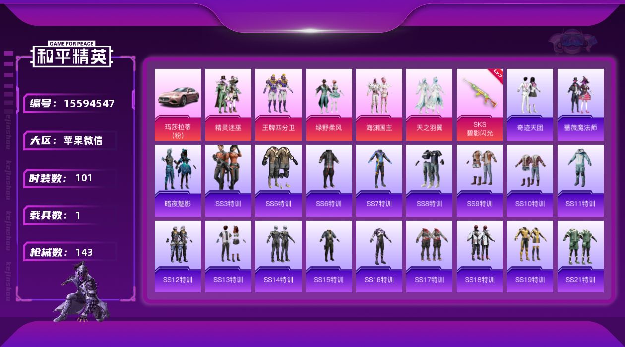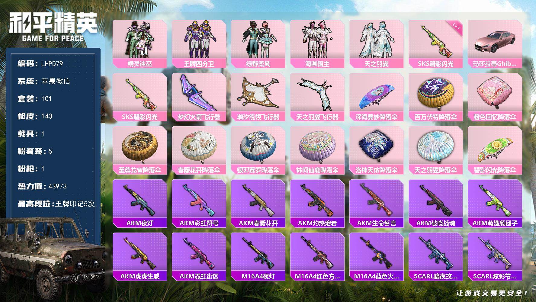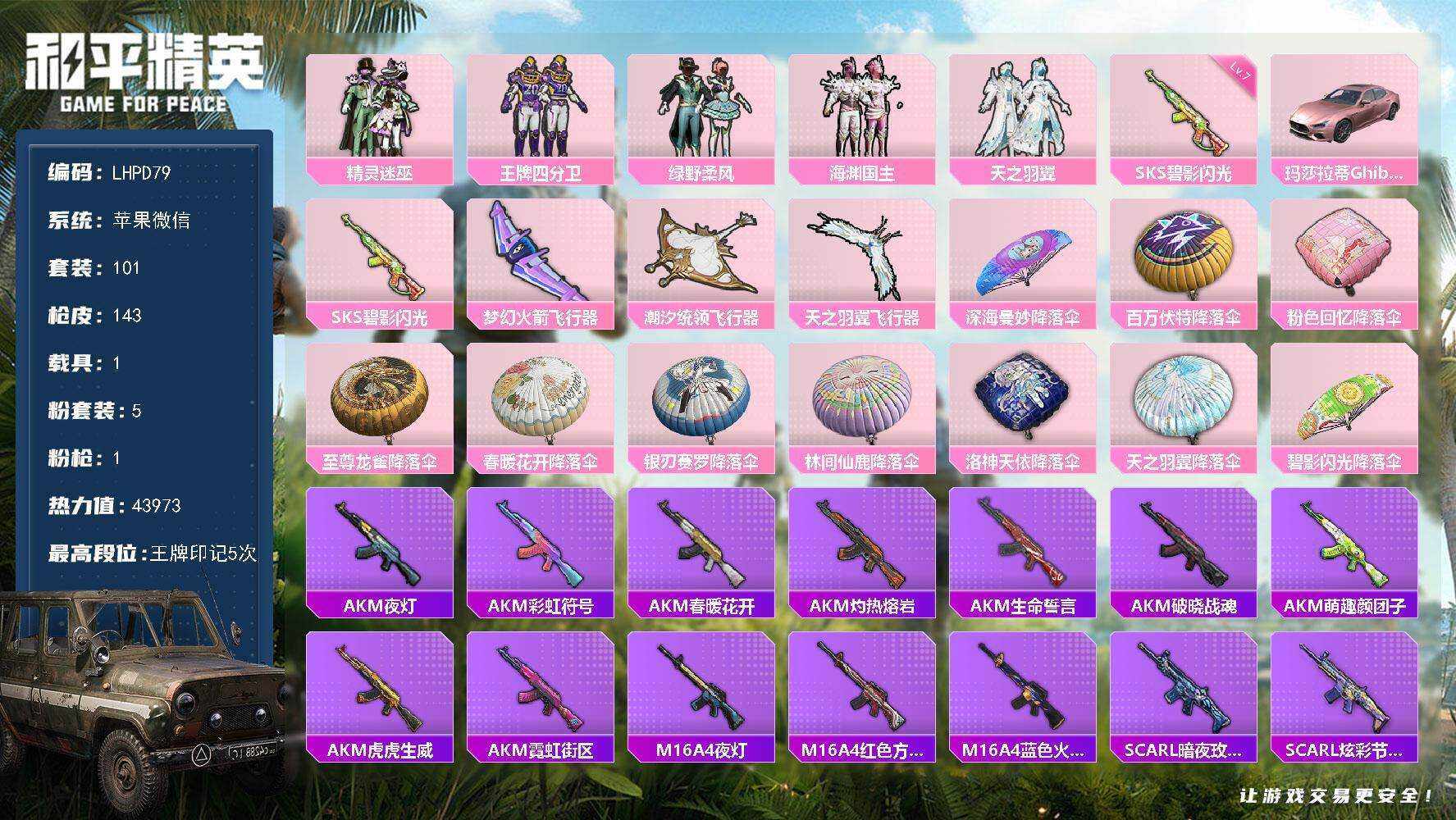 [15594547]【特价出售/店主推荐】苹果 微信-5粉装-1特效枪-1载具-3粉色飞行器-43973热力值-5王牌印记-101套装-143枪皮【粉色套装】:粉装-精灵迷巫,粉装-王牌四分卫,粉装-绿野柔风,粉装-海渊国主,粉装-天之羽翼【粉色枪皮等级】:SKS-碧影闪光(七级)【粉色载具】:玛莎拉蒂Ghibli(粉)【粉色枪皮】:SKS-碧影闪光【粉色飞行器】:梦幻火箭飞行器,潮汐统领飞行器,天之羽翼飞行器