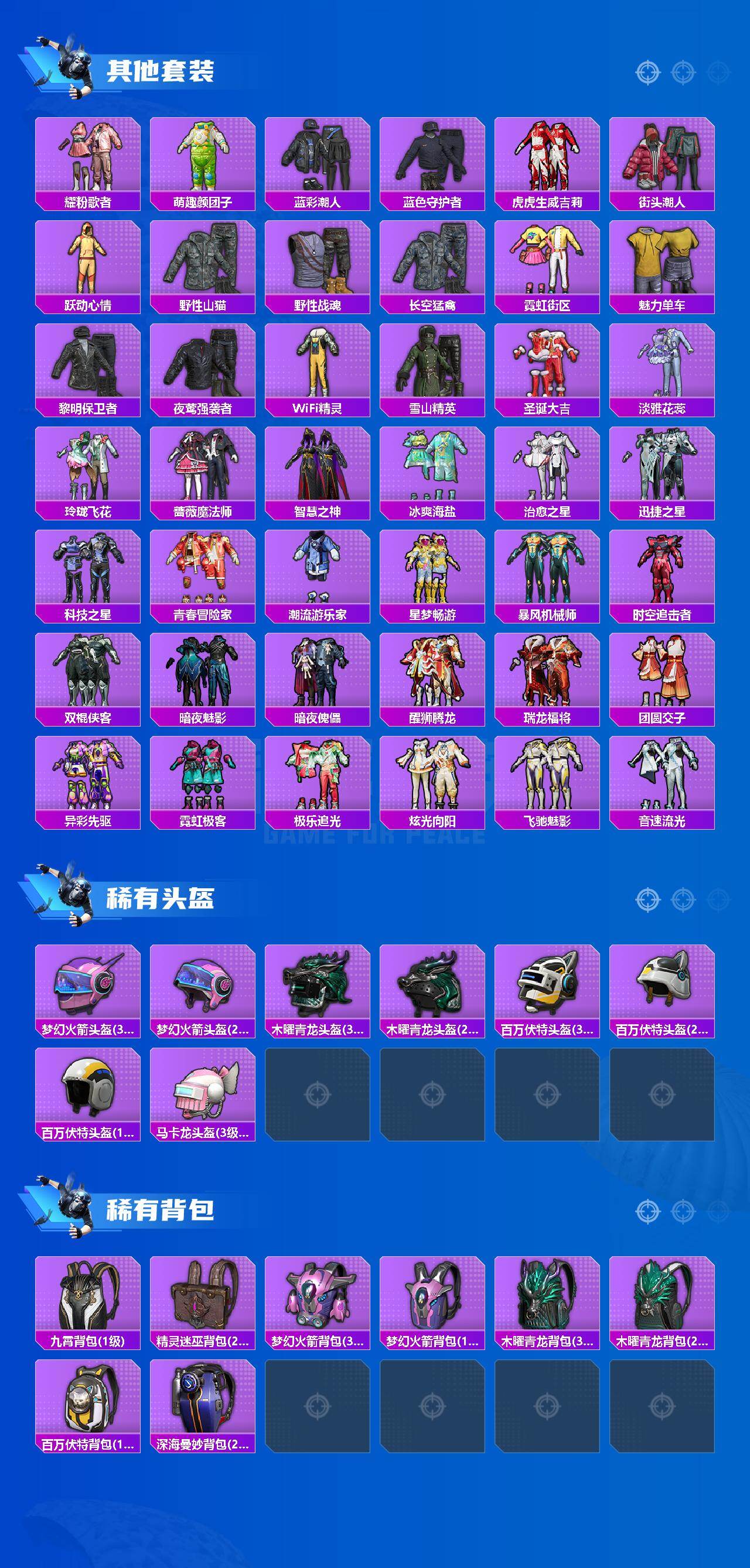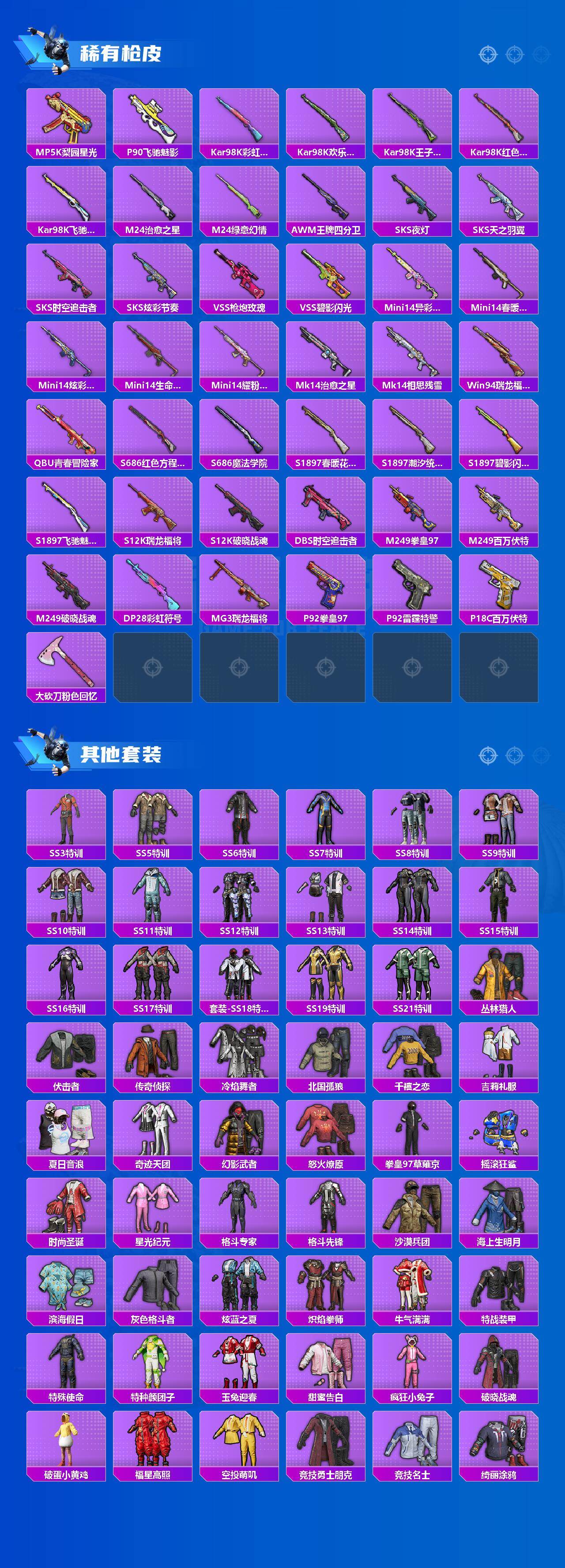 - [11603796]6粉装 4特效枪 2载具 15印记 可二次 可修改实名 身法装备:舞王派对(派对舞王、小金鞋),暗影哥特(红眼罩),萌熊伴侣背包(粉熊背包) 优质装备:玛莎拉蒂Ghibli(粉),甜心巧克力,路特斯EVIJA(星际黄),舞王派对(派对舞王、小金鞋),萌熊伴侣背包(粉熊背包),M416五爪金龙,宝贝奶油派,天使彩虹糖,向日葵(套装-向日葵先生),MG3炙焰牛王,七级MG3-炙焰牛王,七级M416-五爪金龙,羲和光序,Kar98K-巳巳如意 热门装扮:暗夜玫瑰,创世·救赎,万圣娃娃,梦魇先生,深海小丑鱼,东方飞龙,浪漫波比,萌熊伴侣,派对舞王(小金鞋) 稀有枪皮:DP-28-豹影疾电 五级特效枪:五级Kar98K-巳巳如意,五级DP-28-豹影疾电 紫色装扮:SS22特训,SS23特训,SS21特训,SS31特训套装,SS2特训,SS3特训,SS4特训,SS5特训,人气偶像,六六大吉,冰川特警,决胜时刻,冷焰舞者,凛冬战士,刚毅裁决者,北国孤狼,午夜朋克,旭日情侣,SS30特训套装,云朵鹅,彩虹兔,雪绒豹,SS33特训套装,青涩时光,顶瓜瓜,5.56爱好者,SS20特训,SS15特训,SS16特训,冰爽海盐,银白舞王,SS13特训,治愈之星,科技之星,SS14特训,飞驰魅影,音速流光,SS19特训,竞技角斗士,浑天鲲鹏,覆海蛟龙,甜心亚梦,虚音幻奏,瑞龙福将,团圆交子,SS17特训,异彩先驱,SS18特训,向日葵先生,阳光火鸡,都市魅力,酒红色名流,酷潮明星,野性战心,野性战魂,金鼠迎春,长空猛禽,雪山征服者,雪山精英,雷霆特警,霓虹极客,霓虹街区,青春校园,迎春赐吉,风暴特警,缤纷果语,荣耀,蓝彩潮人,蓝色运动,虎虎生威吉莉,超能勇士,飞行日记,骑行爱好者,魅力单车,鹤鸣,黄色伏地魔,黄色名流,黄色格斗者,黄色运动,黎明保卫者,黑色伏地魔,龙的传人,龟仙人,冰河战士,龙魂突击队,蝶变,和平特警,沙漠毒蛇,极地朋克,极速红龙,柠萌假日,格斗先锋,棕色飞行服,橘黑制服,沙漠兵团,派对绅士,海岛探路者,海滨突袭者,深蓝色名流,滨海假日,幻影武者,圣诞大吉,坚韧舞者,夏日倾情,夏日音浪,夜莺强袭者,完美偶像,帅气教官,幻世战舞者,怒火燎原,战地名士,战地督导,战地菁英,湖蓝色名流,滨海厨神,绮丽涂鸦,甜蜜菠萝,生化防暴队,疯狂小兔子,登山爱好者,白色伏地魔,破晓战魂,破蛋