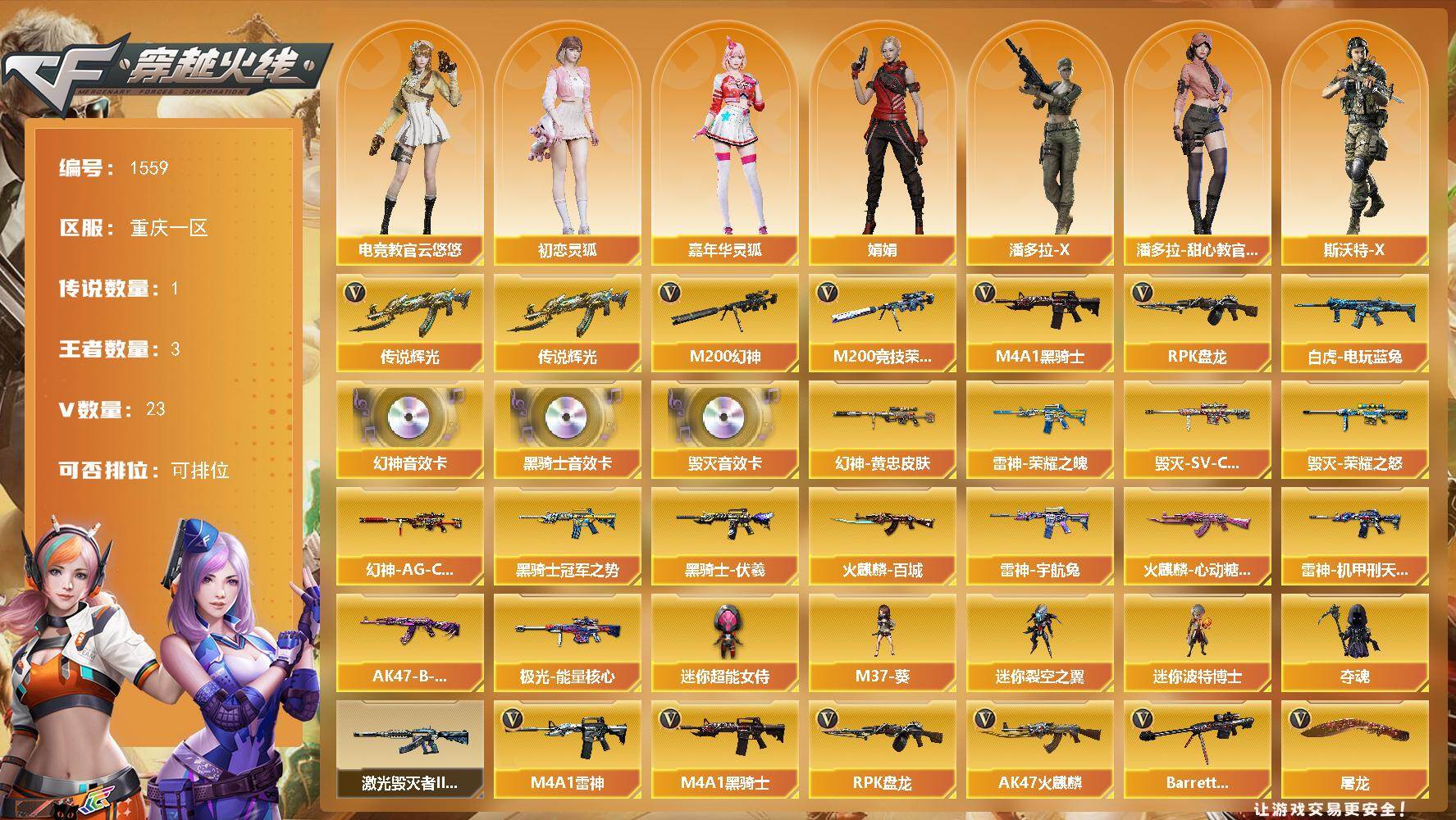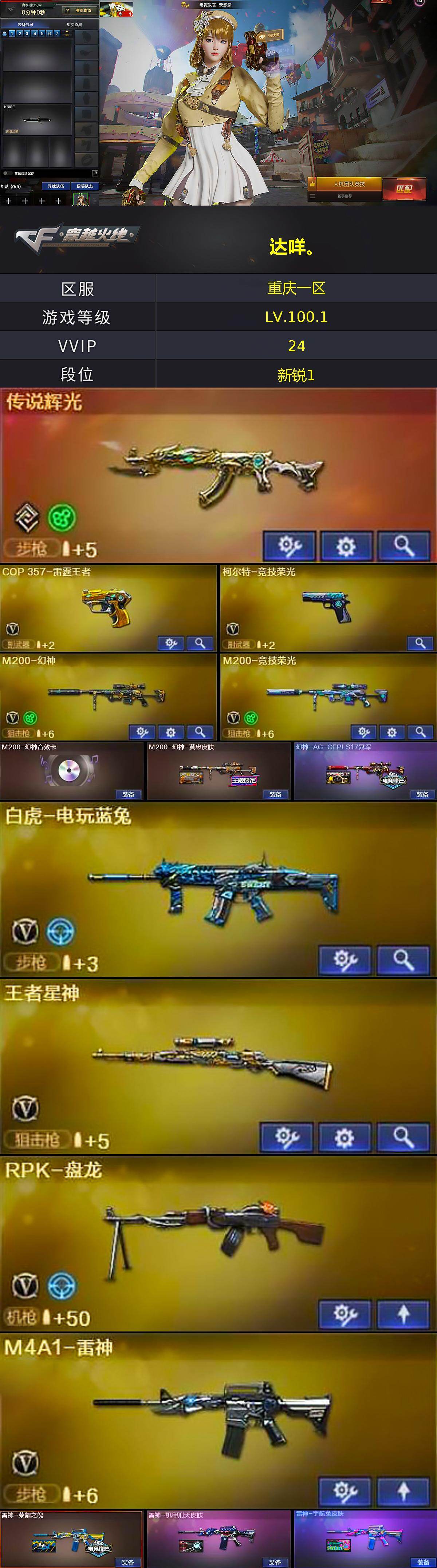 [15594841]重庆一区-23V-3王者-0炫金 【传说武器】:传说辉光 【热门武器】:传说辉光,M200-幻神,M200-竞技荣光,白虎-电玩蓝兔,M4A1-黑骑士,RPK-盘龙 【音效卡】:M200-幻神音效卡,M4A1-黑骑士音效卡,Barrett-毁灭音效卡 【皮肤】:M200-幻神-黄忠皮肤,幻神-AG-CFPLS17冠军,雷神-荣耀之魄,雷神-机甲刑天皮肤,雷神-宇航兔皮肤,火麒麟-百城,火麒麟-心动糖果,毁灭-荣耀之怒,毁灭-SV-CFPLS16冠军,黑骑士-冠军之势,黑骑士-伏羲,AK47-B-常胜将军-曹操*2,极光-能量核心 【角色】:电竞教官-云悠悠,初恋灵狐,嘉年华灵狐,娟娟,潘多拉-X,潘多拉-甜心教官,斯沃特-X 【人偶武器】:M37-葵,迷你裂空之翼,迷你波特博士,夺魂,迷你超能女侍 【挑战大师】:激光毁灭者III-白马银枪 【英雄级武器】:AK47-火麒麟*2,M4A1-雷神,M4A1-黑骑士,无影-神兵利器,王者之武-觉醒版,AK-47-猩红传说*2,白虎-电玩蓝兔,Barrett-毁灭,M200-幻神,M200-竞技荣光,王者星神-觉醒版,RPK-盘龙,COP 357-雷霆王者-觉醒版,柯尔特-竞技荣光,屠龙*3,擎天-竞技荣光,高爆手雷-竞技荣光,闪光弹-竞技荣光,烟雾弹-竞技荣光,烟雾弹-玄豹 【道具】:BS战队炫彩背包,CFS限定背包,女皇终结者-背包,炫彩背包,虎牙炫彩背包,超级背包,女皇终结者-魔龙之吻,绿色巨人,灵魂忍者*2,变异宝贝,迷雾幽灵*3,夺命之镰,防化服*3,流光-鎏金之域,电玩兔兔表情,防弹头盔*3,防弹衣*3,C4工具钳*3,手雷包*3 【特殊枪械】:1黑骑士,1盘龙