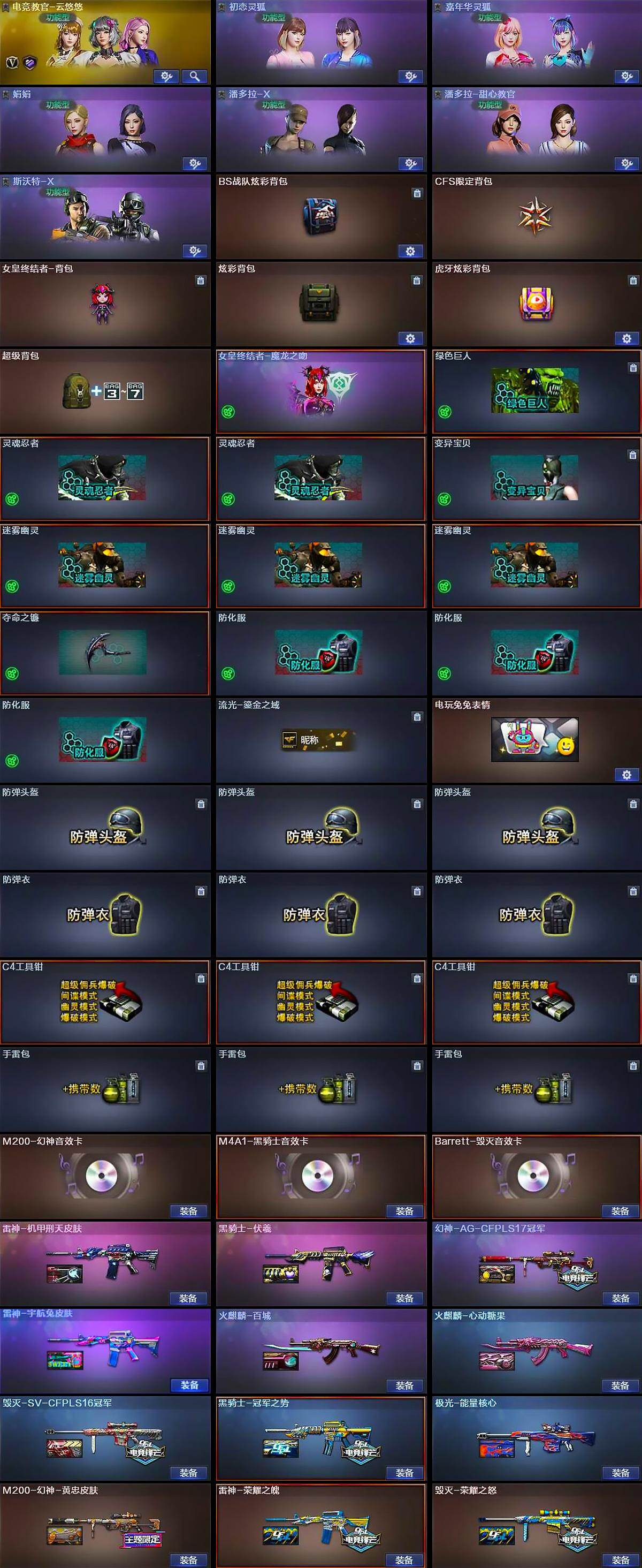 【道具】:BS战队炫彩背包,CFS限定背包,女皇终结者-背包,炫彩背包,虎牙炫彩背包,超级背包,女皇终结者-魔龙之吻,绿色巨人,灵魂忍者*2,变异宝贝,迷雾幽灵*3,夺命之镰,防化服*3,流光-鎏金之域,电玩兔兔表情,防弹头盔*3,防弹衣*3,C4工具钳*3,手雷包*3