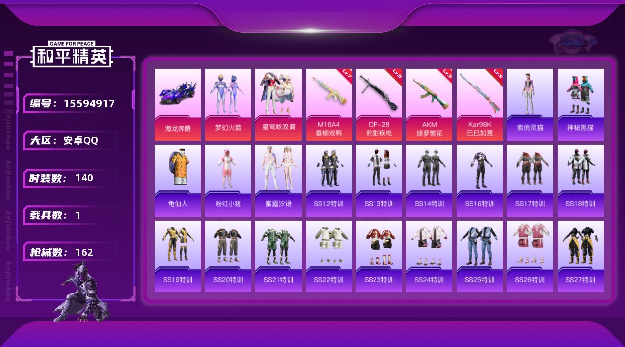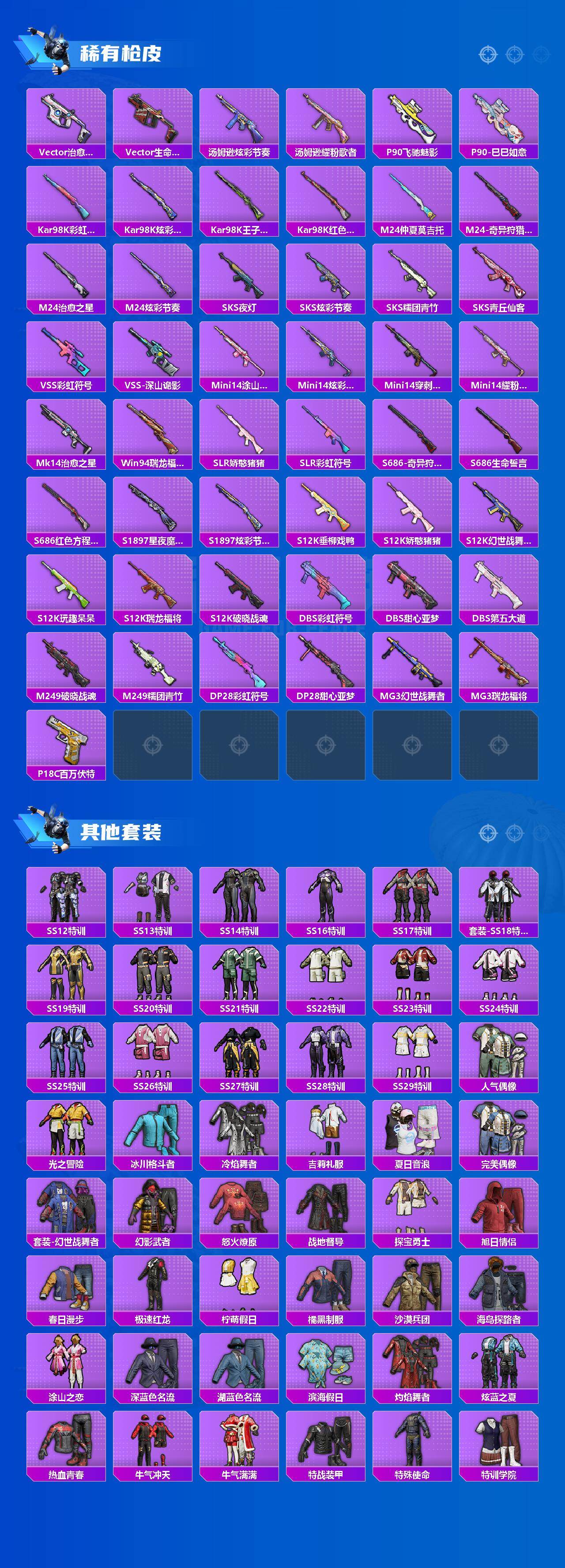 - [12289811]1红装 3粉装 7特效枪 1载具 9印记 可二次 可修改实名 优质装备:最终圣卫者-帕修斯,二级最终圣卫者-帕修斯,辉羽雀灵自行车,仙女座 瞬,AKS-74U-星穹咏叹调,MK14-甜梦熊击,MG3-辉羽雀灵,Vector-最终圣卫者,冷漠罗丽,Vector-绯穹魔姬,Kar98K-巳巳如意 热门装扮:金丰海韵 稀有枪皮:DP-28-豹影疾电 六级特效枪:六级AKS-74U-星穹咏叹调 五级特效枪:五级Kar98K-巳巳如意,五级DP-28-豹影疾电,五级MK14-甜梦熊击 四级特效枪:四级Vector-绯穹魔姬 三级特效枪:三级Vector-最终圣卫者,三级MG3-辉羽雀灵 紫色装扮:SS22特训,娇憨猪猪,萌趣咩咩,SS21特训,SS31特训套装,冷焰舞者,霓虹热舞,极速光影,SS30特训套装,云朵鹅,雪绒豹,SS33特训套装,顶瓜瓜,SS20特训,SS16特训,SS14特训,SS19特训,豚鼠丹丹,竞技角斗士,吉莉礼服,都市漫游者,长空猛禽,霓虹街区,缤纷果语,耀眼新星,蓝色守护者,街头潮人,飞行日记,麻辣教官,黄色运动,冰河战士,龙魂突击队,蝶变,香桃花海,柠萌假日,海岛探路者,夏日音浪,完美偶像,帅气教官,幻世战舞者,战地督导,探宝勇士,绮丽涂鸦,甜蜜菠萝,破蛋小黄鸡,甜蜜告白,空岛之星,竞技达人朋克,红色运动,灰色格斗者,炫蓝之夏,热血青春,牛气满满,雏菊兔兔,萝兰蝴蝶,SS29特训,达芬奇,星途旅人,SS28特训,异域银装,玉兔迎春,巳巳如意,森林游猎者,竞技名士,街头风暴,临安公主,SS25特训,SS27特训,SS26特训,智谋强哥,大橘大利,星渊小夜曲,春日漫步,SS32特训服(SS32特训套装),青玉碎影,萌黄之夏,白糯汤圆,恋语绒绒,金耀舞者,光之冒险 优质战备:星途旅人降落伞,时光之吻飞行器,幻彩电音降落伞,最终圣卫者降落伞,辉羽雀灵降落伞,雀灵庇佑飞行器,终晖之翼飞行器,宁雨蝶降落伞,月影灵韵降落伞,圣域龙灵降落伞,幻影战神降落伞