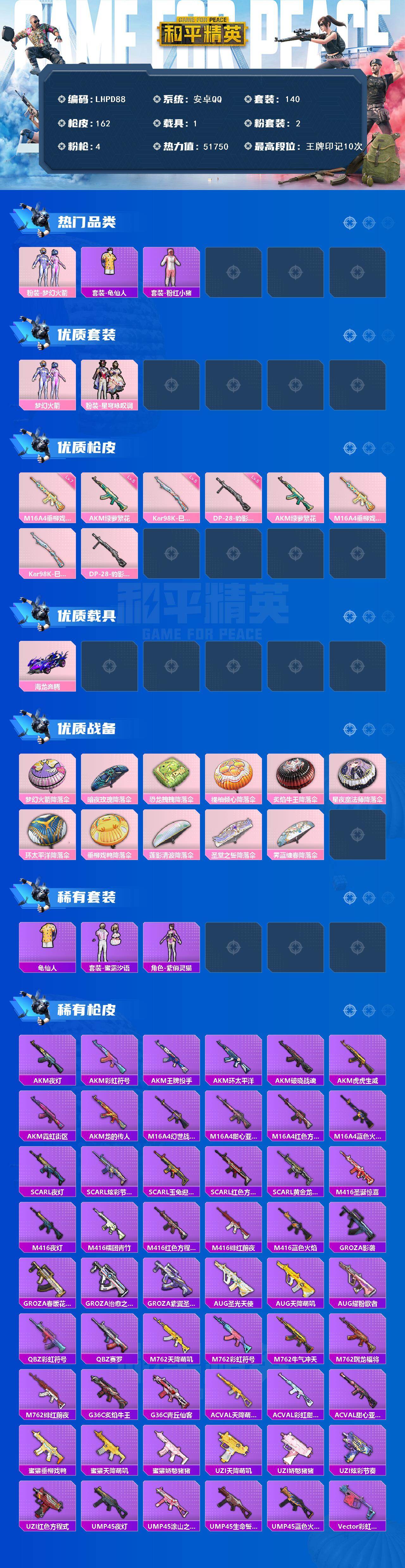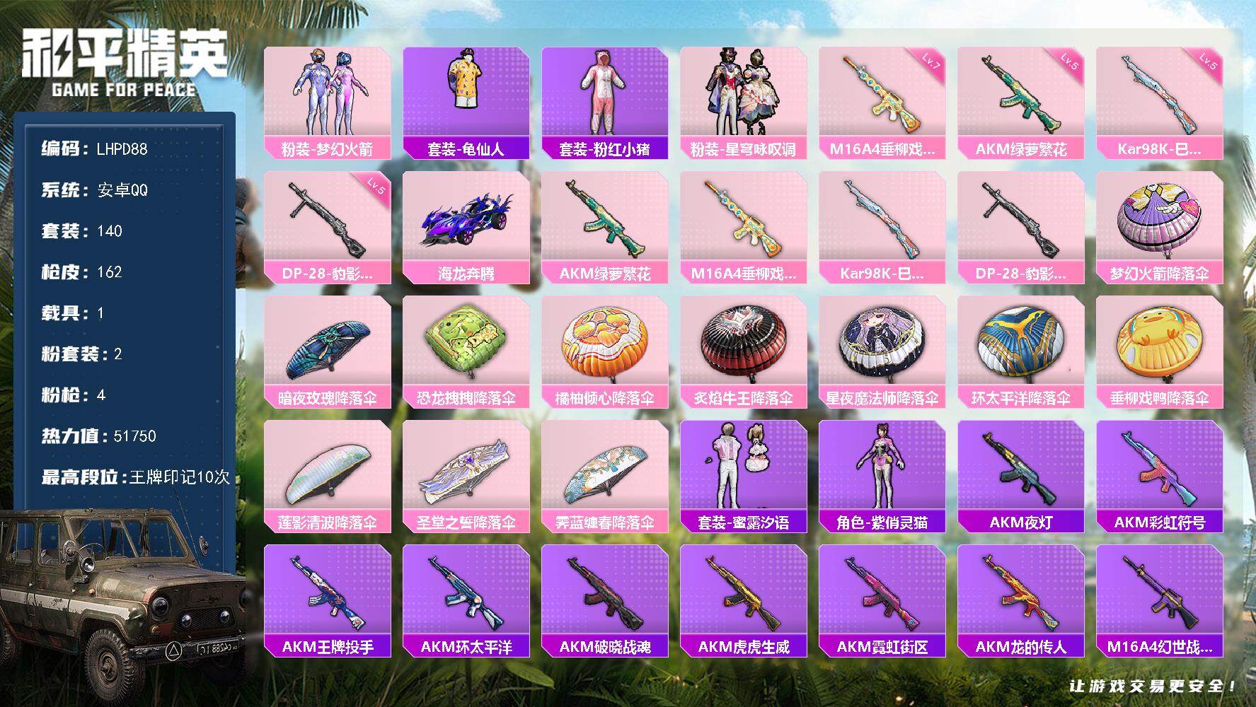 [15594917]【特价出售/店主推荐】安卓 手Q-2粉装-4特效枪-1载具-0粉色飞行器-51750热力值-10王牌印记-140套装-162枪皮【热门品类】:粉装-梦幻火箭,套装-龟仙人,套装-粉红小猪【粉色套装】:粉装-梦幻火箭,粉装-星穹咏叹调【粉色枪皮等级】:AKM-绿萝繁花(五级),M16A4-垂柳戏鸭(七级),Kar98K-巳巳如意(五级),DP-28-豹影疾电(五级)【粉色载具】:海龙奔腾【粉色枪皮】:AKM-绿萝繁花,M16A4-垂柳戏鸭,Kar98K-巳巳如意,DP-28-豹影疾电