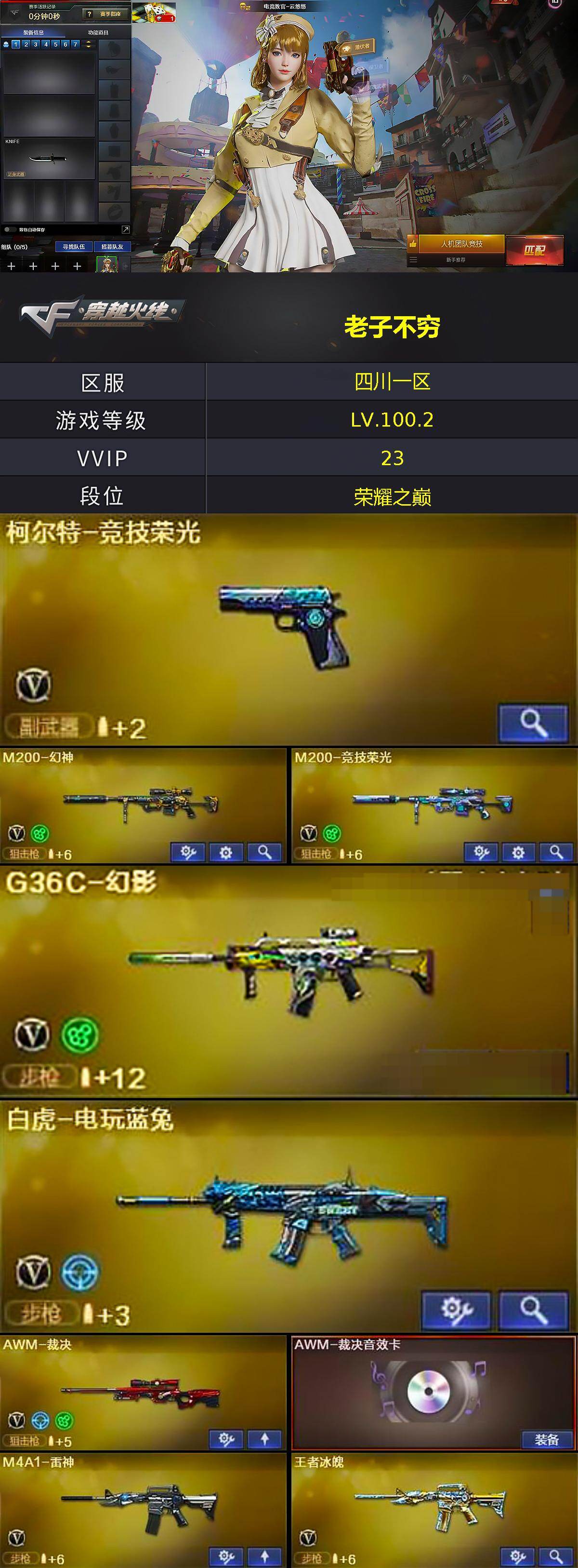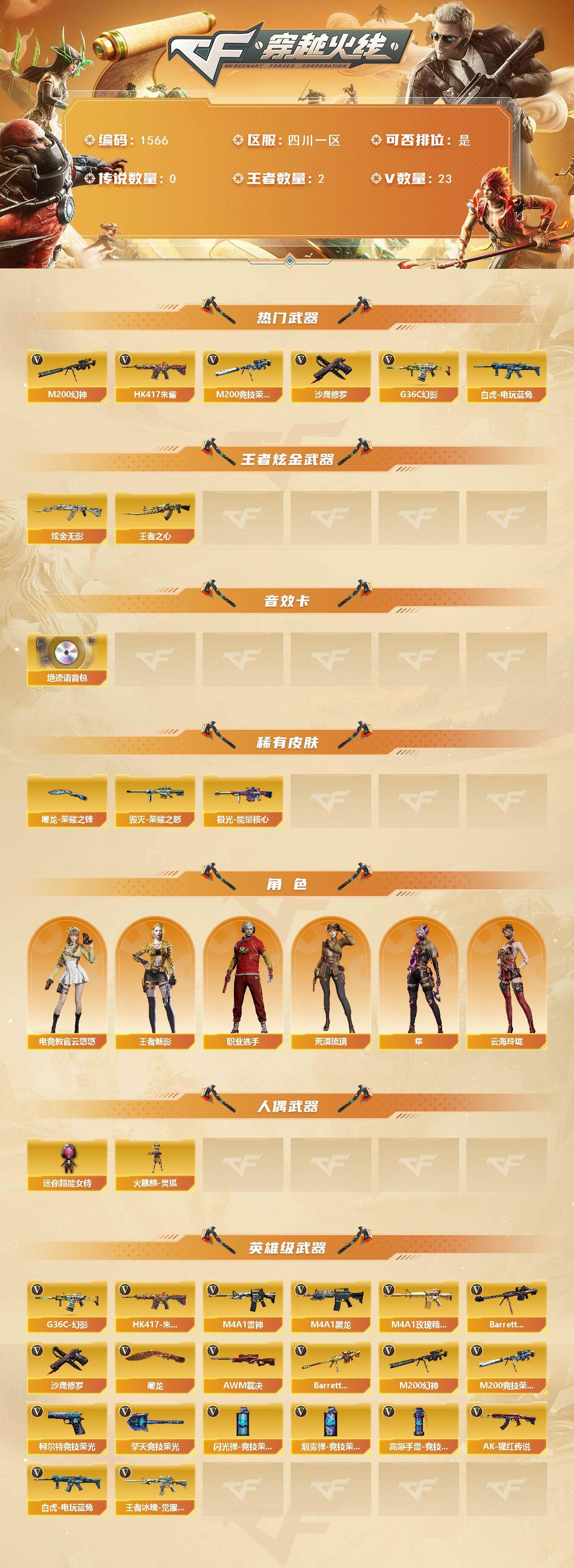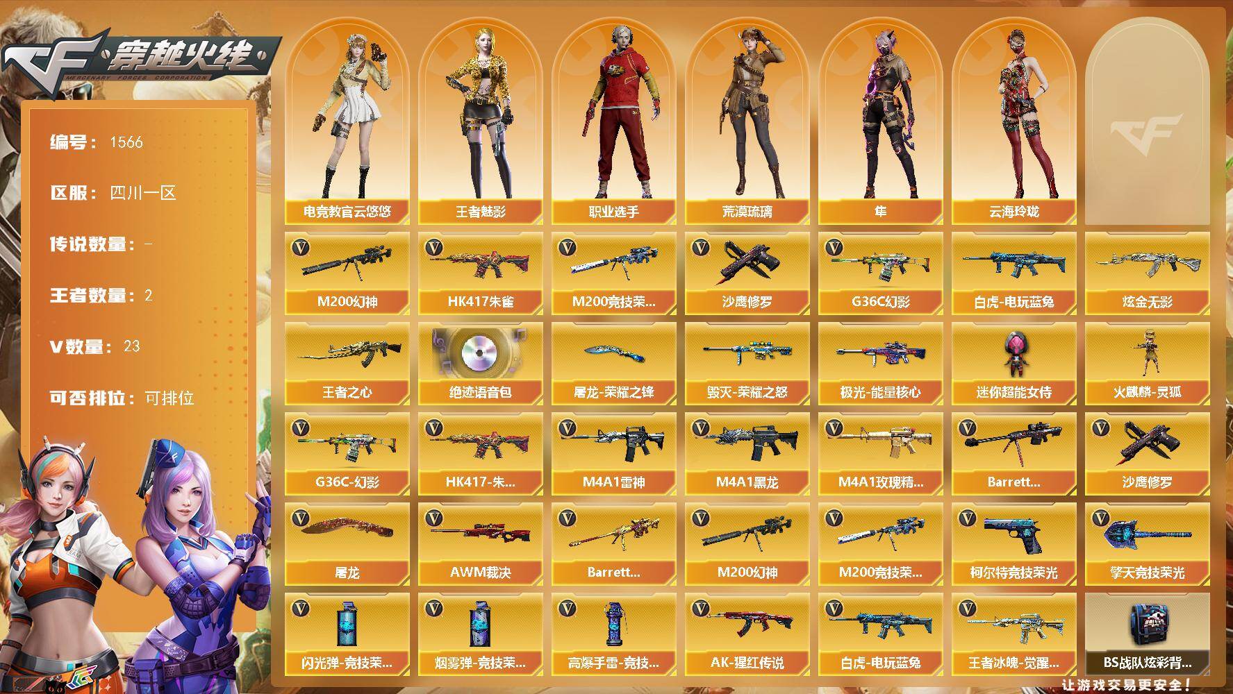 [15596420]四川一区-23V-2王者-1炫金 【热门武器】:G36C-幻影,HK417-朱雀,M200-幻神,M200-竞技荣光,白虎-电玩蓝兔,沙鹰-修罗 【王者炫金武器】:王者之心,炫金无影 【音效卡】:绝迹语音包 【皮肤】:毁灭-荣耀之怒,极光-能量核心,屠龙-荣耀之锋 【角色】:电竞教官-云悠悠,荒漠琉璃,隼,王者-魅影,云海玲珑,职业选手 【人偶武器】:火麒麟-灵狐,迷你超能女侍 【英雄级武器】:M4A1-黑龙,M4A1-雷神,HK417-朱雀,G36C-幻影,M4A1-玫瑰精灵,AK-47-猩红传说,王者冰魄-觉醒版,白虎-电玩蓝兔,Barrett-毁灭,AWM-裁决,M200-幻神,Barrett-朱雀,M200-竞技荣光,沙鹰-修罗,柯尔特-竞技荣光,屠龙,擎天-竞技荣光,高爆手雷-竞技荣光,闪光弹-竞技荣光,烟雾弹-竞技荣光 【道具】:BS战队炫彩背包,女皇终结者-魔龙之吻,救世主-黑桃战神,绿色巨人,灵魂忍者,迷雾幽灵,夺命之镰,防化服*2,电玩兔兔表情,循环实验表情,防弹头盔*2,防弹衣*2,C4工具钳*2,手雷包*2 【特殊枪械】: