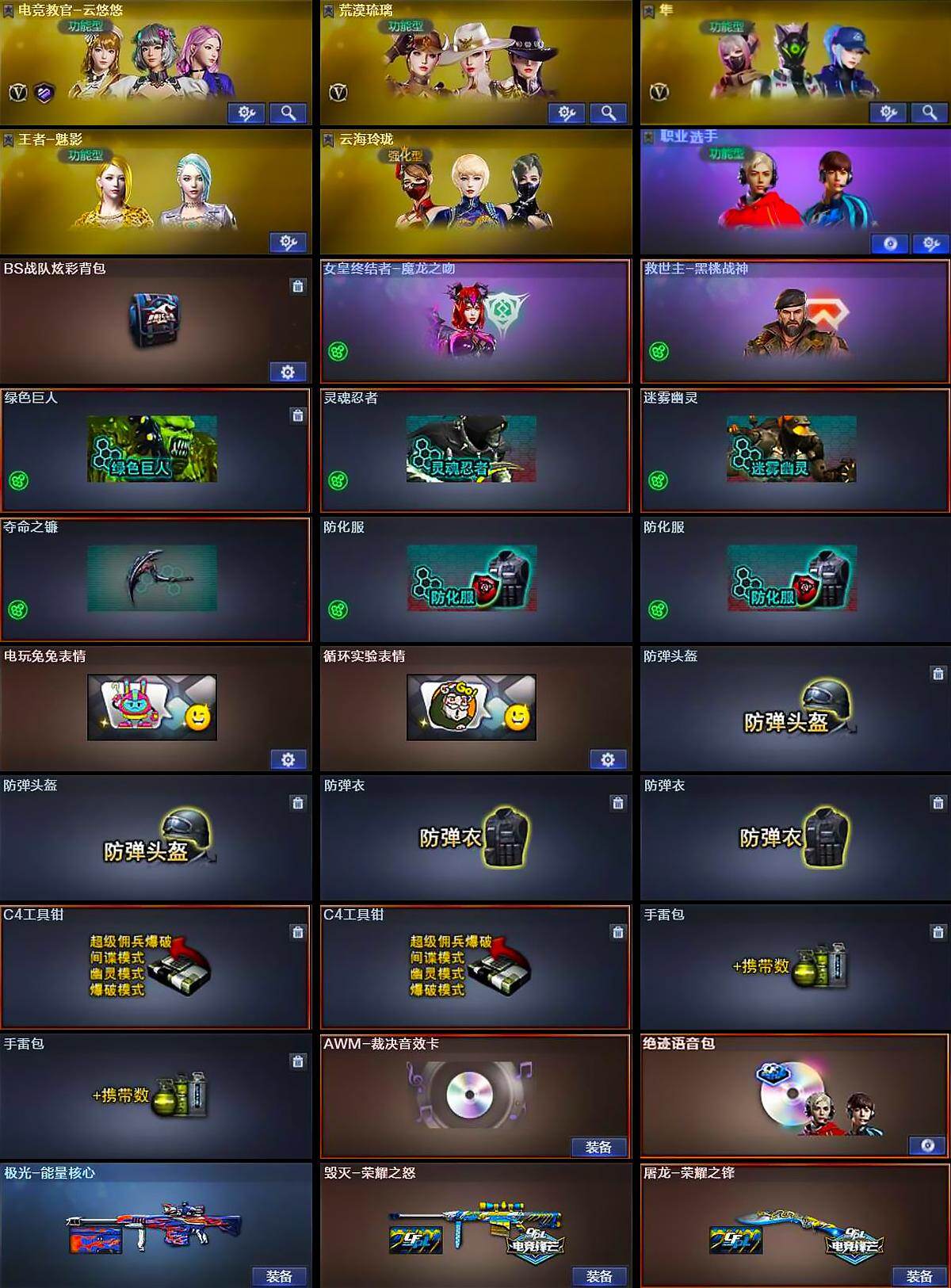 【道具】:BS战队炫彩背包,女皇终结者-魔龙之吻,救世主-黑桃战神,绿色巨人,灵魂忍者,迷雾幽灵,夺命之镰,防化服*2,电玩兔兔表情,循环实验表情,防弹头盔*2,防弹衣*2,C4工具钳*2,手雷包*2