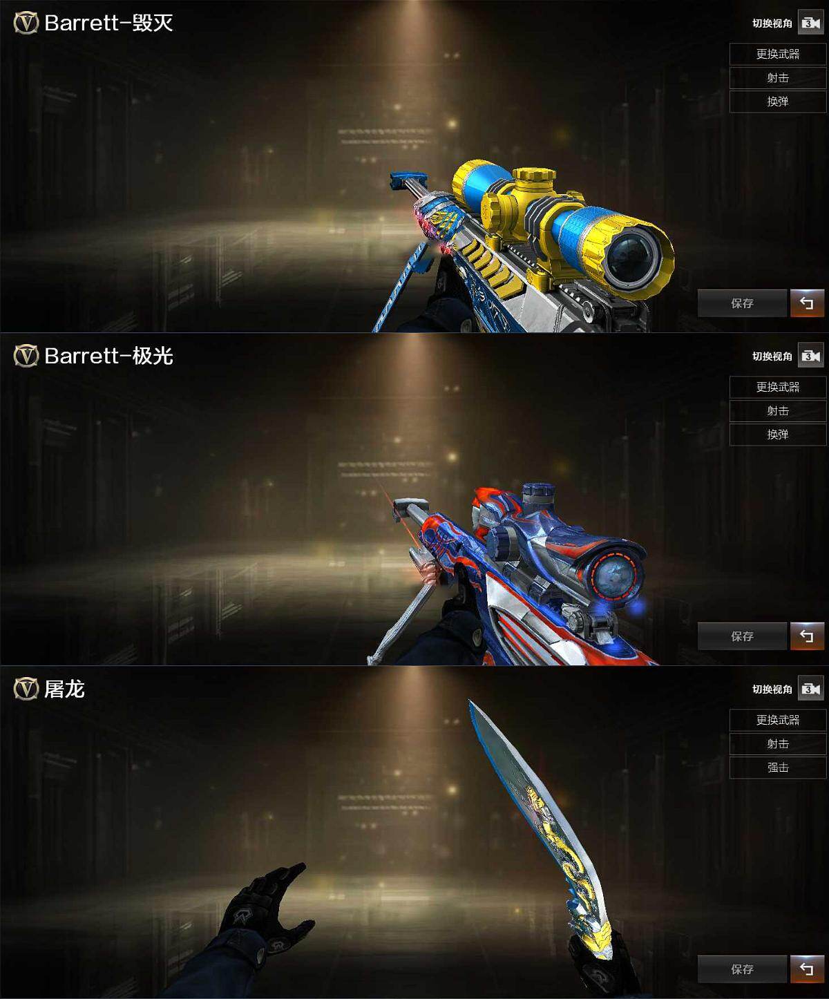 【英雄级武器】:M4A1-黑龙,M4A1-雷神,HK417-朱雀,G36C-幻影,M4A1-玫瑰精灵,AK-47-猩红传说,王者冰魄-觉醒版,白虎-电玩蓝兔,Barrett-毁灭,AWM-裁决,M200-幻神,Barrett-朱雀,M200-竞技荣光,沙鹰-修罗,柯尔特-竞技荣光,屠龙,擎天-竞技荣光,高爆手雷-竞技荣光,闪光弹-竞技荣光,烟雾弹-竞技荣光