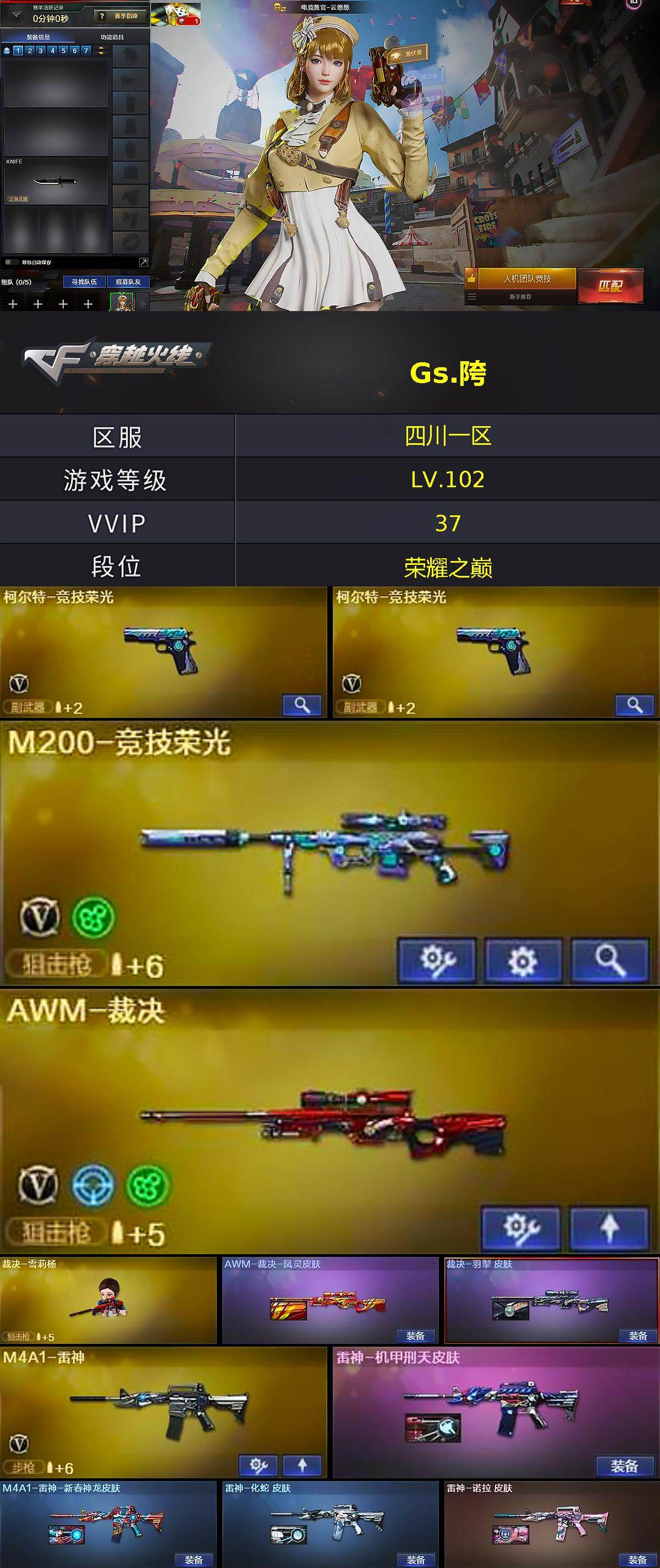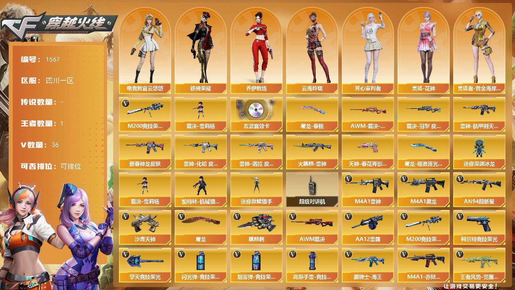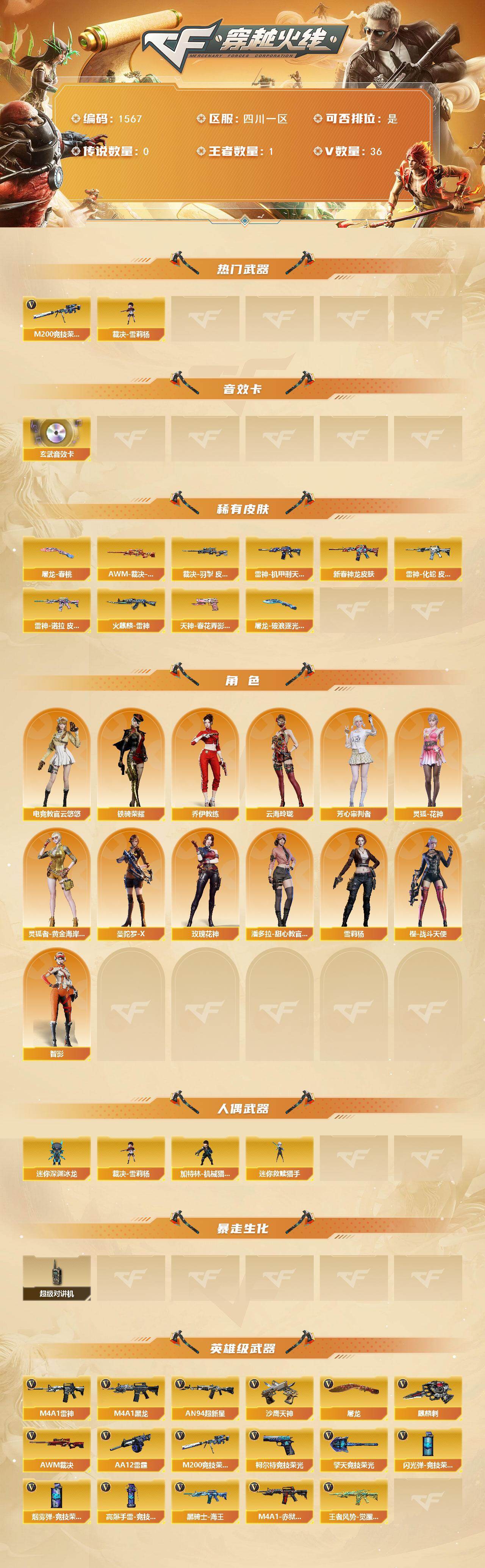 [15596516]四川一区-36V-1王者-0炫金 【热门武器】:M200-竞技荣光,裁决-雪莉杨 【音效卡】:M14EBR-玄武音效卡 【皮肤】:AWM-裁决-凤灵皮肤,裁决-羽掣 皮肤,雷神-机甲刑天皮肤,M4A1-雷神-新春神龙皮肤,雷神-化蛇 皮肤,雷神-诺拉 皮肤,火麒麟-雷神,天神-春花弄影 皮肤,屠龙-春桃 皮肤,屠龙-破浪逐光 皮肤 【角色】:电竞教官-云悠悠,乔伊教练,云海玲珑,芳心审判者,灵狐-花神,灵狐者-黄金海岸,曼陀罗-X,玫瑰花神,潘多拉-甜心教官,铁骑荣耀,雪莉杨,樱-战斗天使,智影 【人偶武器】:裁决-雪莉杨,迷你救赎猎手,加特林-机械猎手,迷你深渊冰龙 【暴走生化】:超级对讲机 【英雄级武器】:M4A1-黑龙,M4A1-雷神,AN94-超新星,黑骑士-海王,王者风势-觉醒版,AWM-裁决,M200-竞技荣光,AA-12-雷霆,沙鹰-天神,柯尔特-竞技荣光*2,屠龙,麒麟刺,擎天-竞技荣光*2,高爆手雷-竞技荣光*5,闪光弹-竞技荣光*6,烟雾弹-竞技荣光*7,M4A1-赤狱骑士 【道具】:云山科技背包,亚洲杯纪念炫彩背包,炫彩背包-诺拉,虎牙炫彩背包,救世主-黑桃战神,黄金生化钩,绿色巨人,灵魂忍者,迷雾幽灵,夺命之镰,防化服*2,流光-再燃火线,枪王排位29赛季金色流光,语音特效-机器人,CFPL选手表情-第1套,C4-黑曜,防弹头盔*2,防弹衣*2,C4工具钳*2,手雷包*2 【特殊枪械】:
