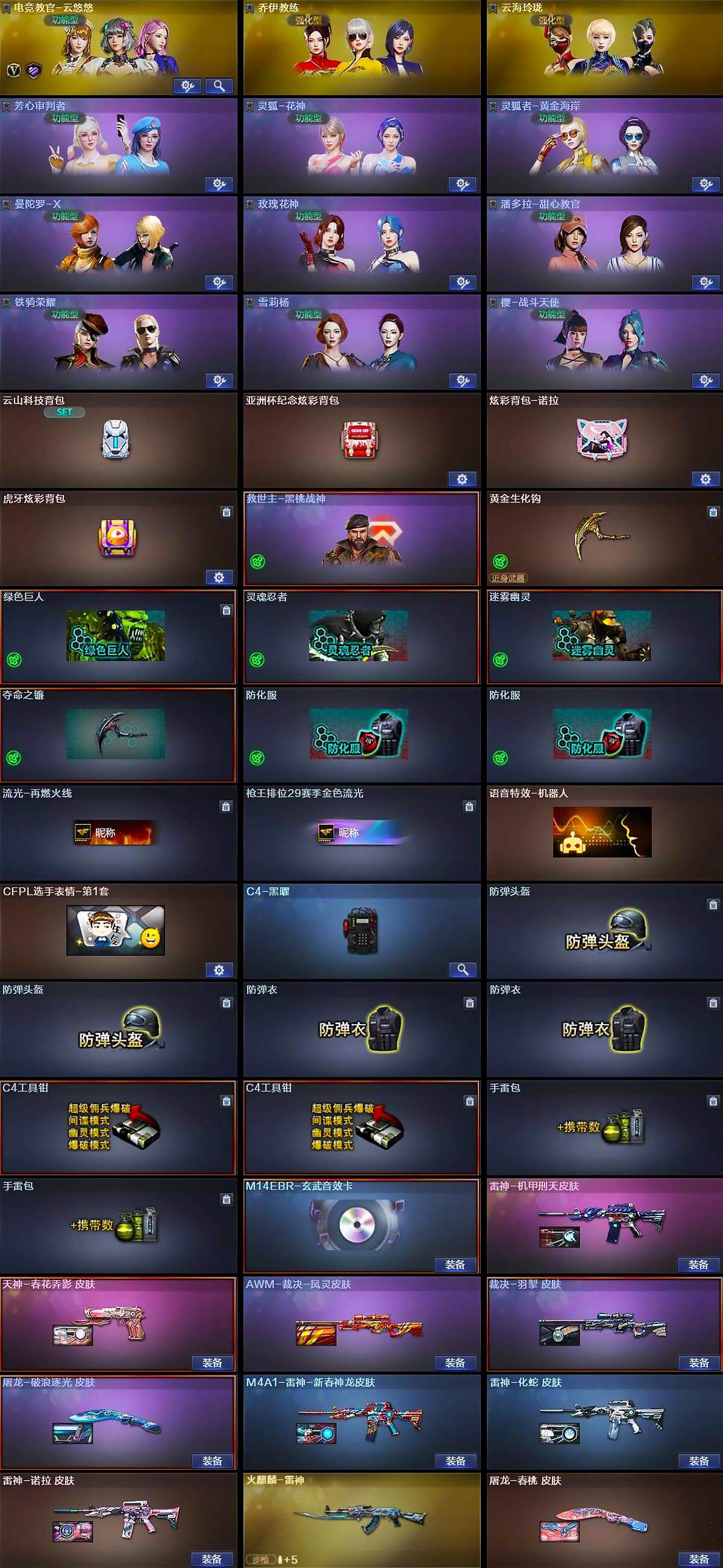 【道具】:云山科技背包,亚洲杯纪念炫彩背包,炫彩背包-诺拉,虎牙炫彩背包,救世主-黑桃战神,黄金生化钩,绿色巨人,灵魂忍者,迷雾幽灵,夺命之镰,防化服*2,流光-再燃火线,枪王排位29赛季金色流光,语音特效-机器人,CFPL选手表情-第1套,C4-黑曜,防弹头盔*2,防弹衣*2,C4工具钳*2,手雷包*2