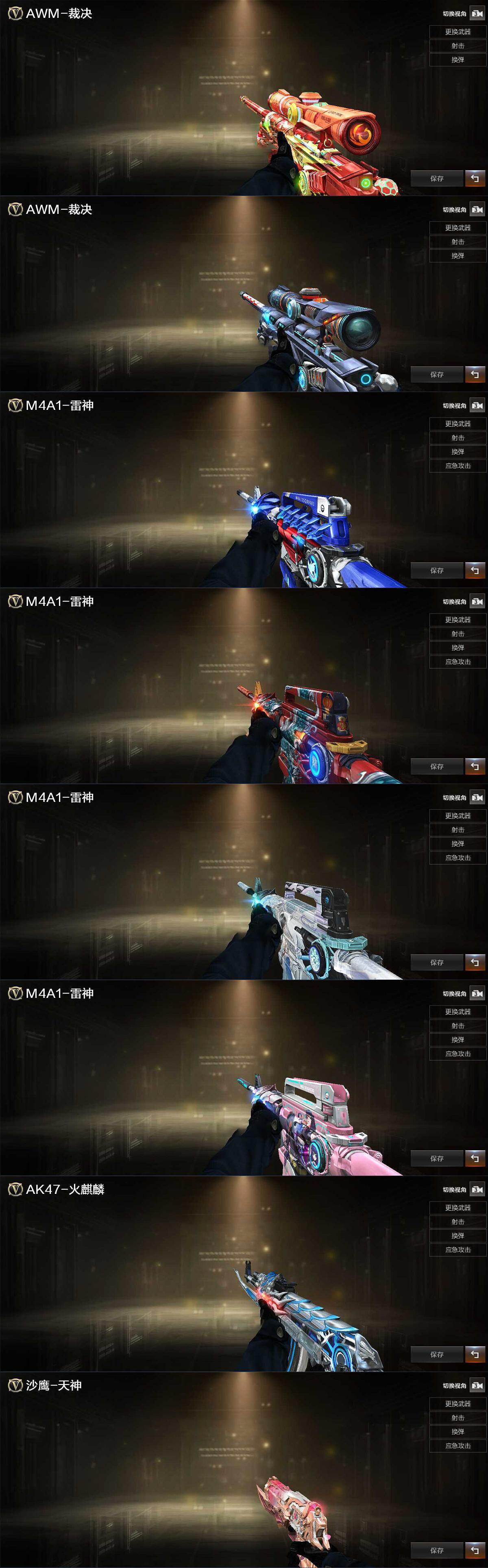 【皮肤】:AWM-裁决-凤灵皮肤,裁决-羽掣 皮肤,雷神-机甲刑天皮肤,M4A1-雷神-新春神龙皮肤,雷神-化蛇 皮肤,雷神-诺拉 皮肤,火麒麟-雷神,天神-春花弄影 皮肤,屠龙-春桃 皮肤,屠龙-破浪逐光 皮肤