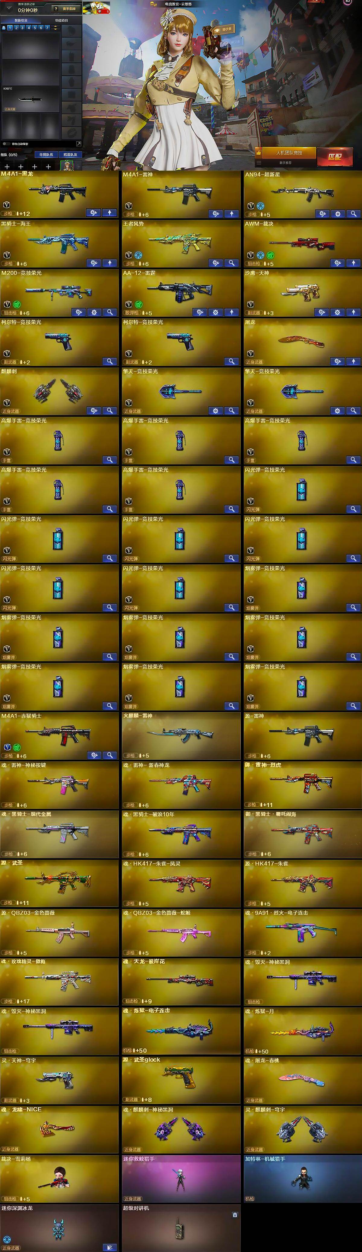 【英雄级武器】:M4A1-黑龙,M4A1-雷神,AN94-超新星,黑骑士-海王,王者风势-觉醒版,AWM-裁决,M200-竞技荣光,AA-12-雷霆,沙鹰-天神,柯尔特-竞技荣光*2,屠龙,麒麟刺,擎天-竞技荣光*2,高爆手雷-竞技荣光*5,闪光弹-竞技荣光*6,烟雾弹-竞技荣光*7,M4A1-赤狱骑士