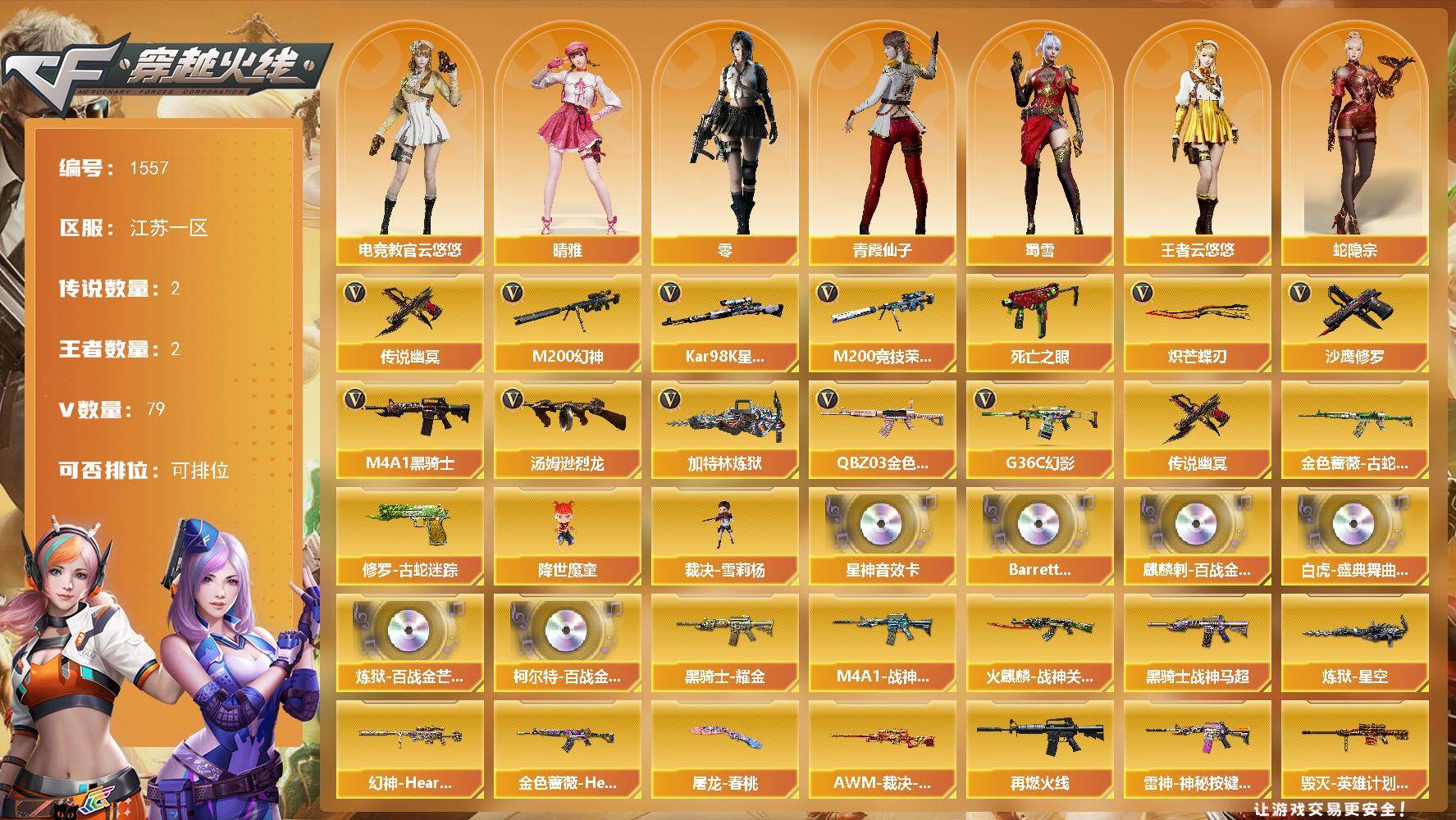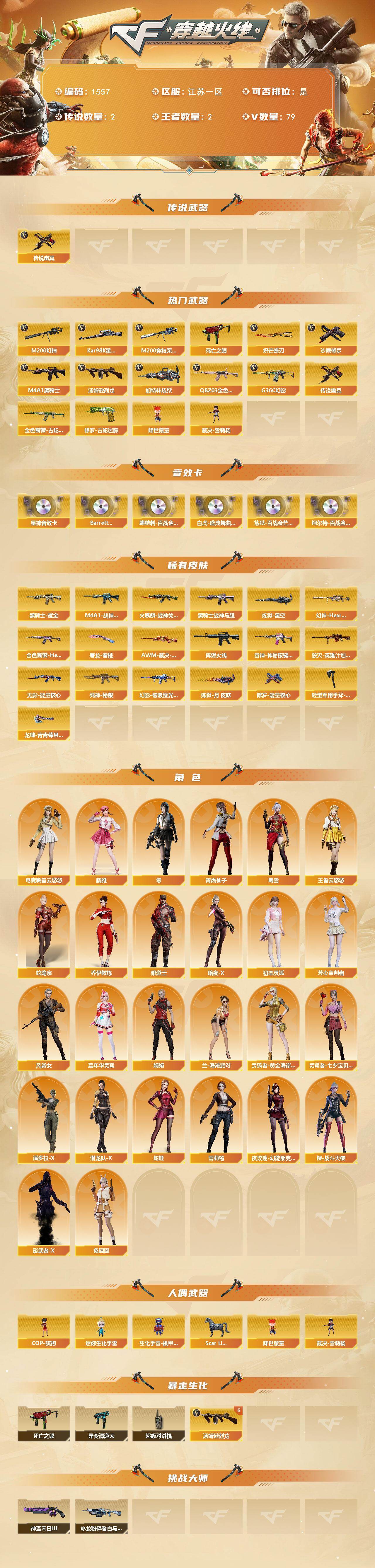 [15596781]江苏一区-79V-2王者-0炫金 【传说武器】:传说幽冥*2 【热门武器】:传说幽冥*2,G36C-幻影,QBZ03-金色蔷薇,M200-幻神,金色蔷薇-古蛇迷踪,修罗-古蛇迷踪,M200-竞技荣光*2,死亡之眼,Kar98K-星神,M4A1-黑骑士*2,汤姆逊-烈龙*7,加特林-炼狱,降世魔童,裁决-雪莉杨,沙鹰-修罗,炽芒蝶刃*2 【音效卡】:Kar98K-星神音效卡,Barrett-碧霄极光音效卡,麒麟刺-百战金芒-盛典舞曲音效卡,白虎-盛典舞曲音效卡,炼狱-百战金芒-庆典舞曲音效卡,柯尔特-百战金芒-庆典舞曲音效卡 【皮肤】:幻神-Heartshot 皮肤,金色蔷薇-Heartshot皮肤,AWM-裁决-凤灵皮肤,M4A1-战神赵云,M4A1-再燃火线,雷神-神秘按键 皮肤,火麒麟-战神关羽,毁灭-英雄计划 皮肤,黑骑士耀金皮肤,黑骑士-战神马超,无影-能量核心,死神-秘银,幻影-破浪逐光 皮肤,炼狱-星空,炼狱-月 皮肤,修罗-能量核心,屠龙-春桃 皮肤,轻型军用手斧-再燃火线,龙啸-青青莓果 皮肤 【角色】:零,电竞教官-云悠悠,晴雅,王者云悠悠,蛇隐宗,乔伊教练,修道士,暗夜-X,初恋灵狐,芳心审判者,风暴女,嘉年华灵狐,娟娟,兰-海滩派对,灵狐者-黄金海岸,灵狐者-七夕宝贝,潘多拉-X,潜龙队-X,青霞仙子,蛇姬,蜀雪,兔囡囡,雪莉杨,夜玫瑰-幻能朋克,樱-战斗天使,影武者-X 【人偶武器】:裁决-雪莉杨,Scar Light-马枪,COP-旗袍,迷你生化手雷,生化手雷-机甲核心,降世魔童 【暴走生化】:异变清道夫,死亡之眼,超级对讲机 【挑战大师】:冰龙粉碎者-白马银枪,神圣爆裂者-末日III 【英雄级武器】:AK47-火麒麟*2,M4A1-黑龙*2,M4A1-雷神*2,M4A1-黑骑士*2,AK47-无影*2,M4A1-死神,AK12-天启,G36C-幻影,金色蔷薇-古蛇迷踪,M4A1-玫瑰精灵,QBZ03-金色蔷薇,王者之武-觉醒版,AWM-天龙,Barrett-毁灭*3,Barrett-极光,AWM-裁决,M200-幻神,Kar98K-星神,M200-竞技荣光*2,王者幻神-觉醒版,加特林-炼狱,炼狱-百战金芒,汤姆逊-烈龙*7,沙鹰-修罗,沙鹰-天神,柯尔特-竞技荣光,修罗-古蛇迷踪,屠龙*2,龙啸,擎天*2,麒麟刺*3,擎天-竞技荣光*
