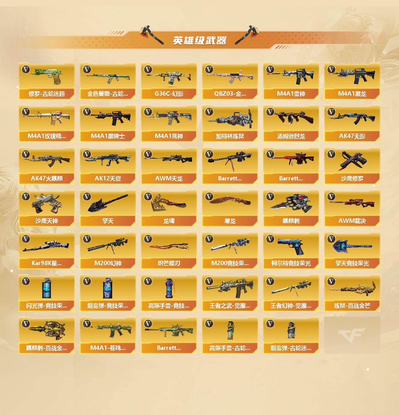 【英雄级武器】:AK47-火麒麟*2,M4A1-黑龙*2,M4A1-雷神*2,M4A1-黑骑士*2,AK47-无影*2,M4A1-死神,AK12-天启,G36C-幻影,金色蔷薇-古蛇迷踪,M4A1-玫瑰精灵,QBZ03-金色蔷薇,王者之武-觉醒版,AWM-天龙,Barrett-毁灭*3,Barrett-极光,AWM-裁决,M200-幻神,Kar98K-星神,M200-竞技荣光*2,王者幻神-觉醒版,加特林-炼狱,炼狱-百战金芒,汤姆逊-烈龙*7,沙鹰-修罗,沙鹰-天神,柯尔特-竞技荣光,修罗-古蛇迷踪,屠龙*2,龙啸,擎天*2,麒麟刺*3,擎天-竞技荣光*