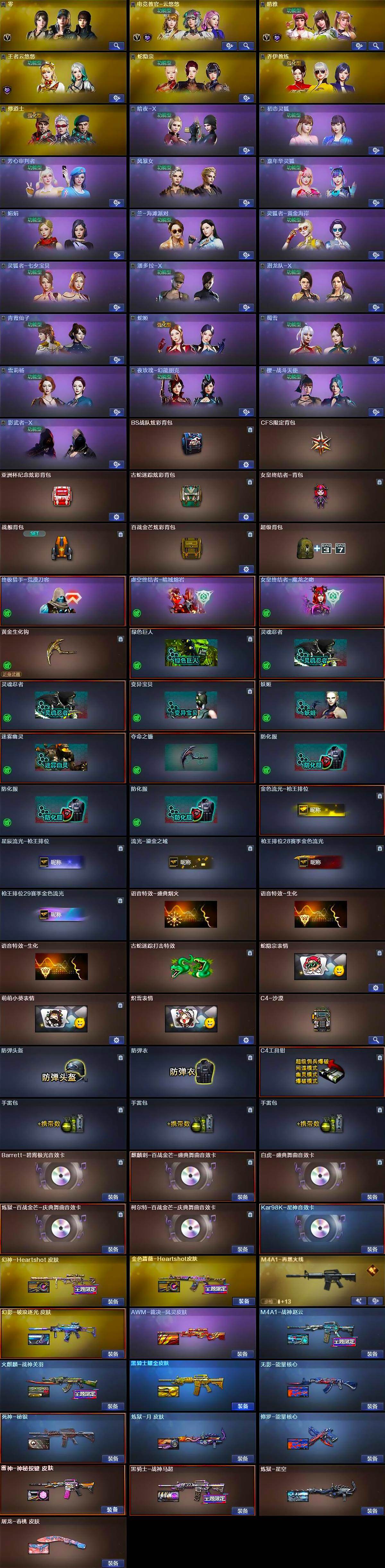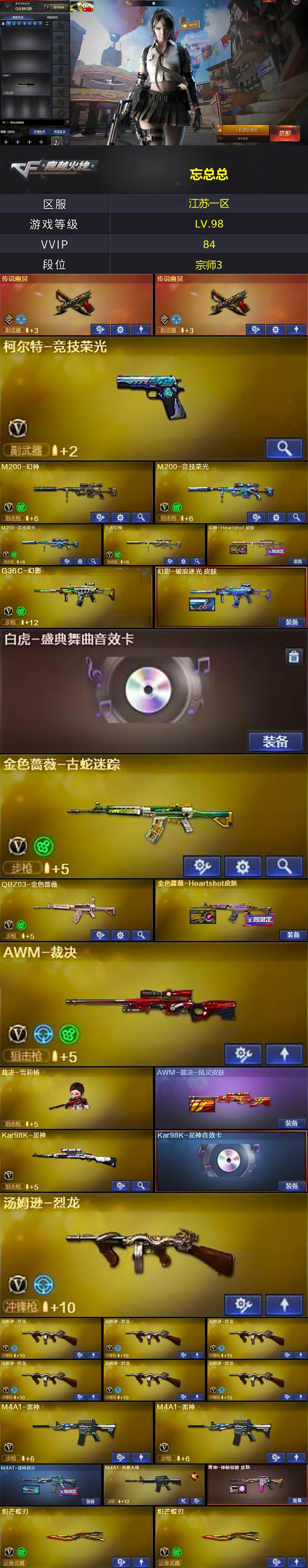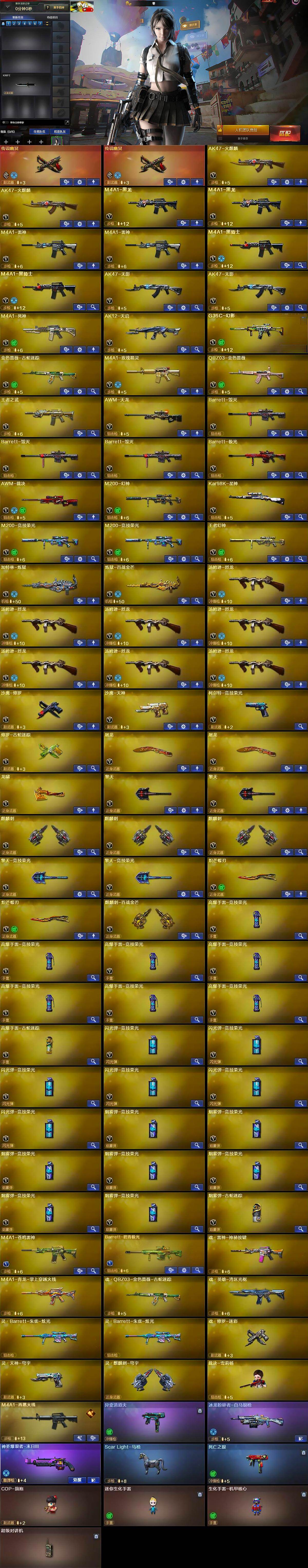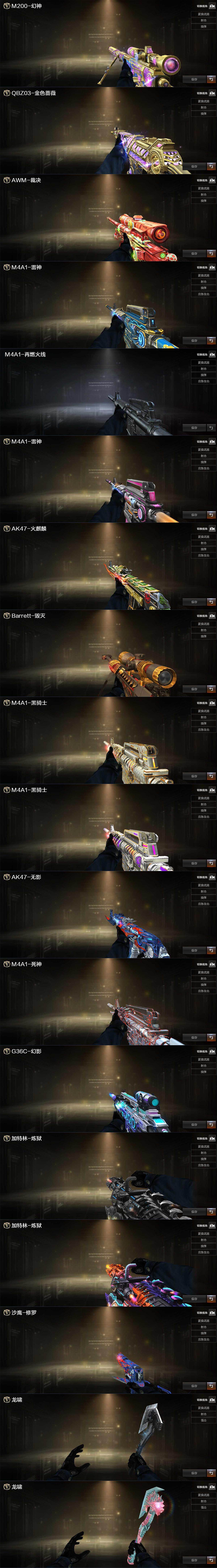 【热门武器】:传说幽冥*2,G36C-幻影,QBZ03-金色蔷薇,M200-幻神,金色蔷薇-古蛇迷踪,修罗-古蛇迷踪,M200-竞技荣光*2,死亡之眼,Kar98K-星神,M4A1-黑骑士*2,汤姆逊-烈龙*7,加特林-炼狱,降世魔童,裁决-雪莉杨,沙鹰-修罗,炽芒蝶刃*2