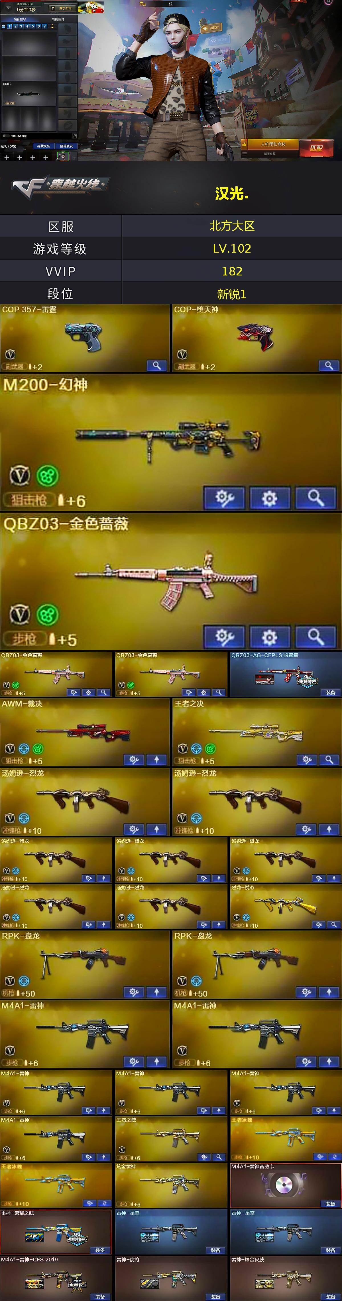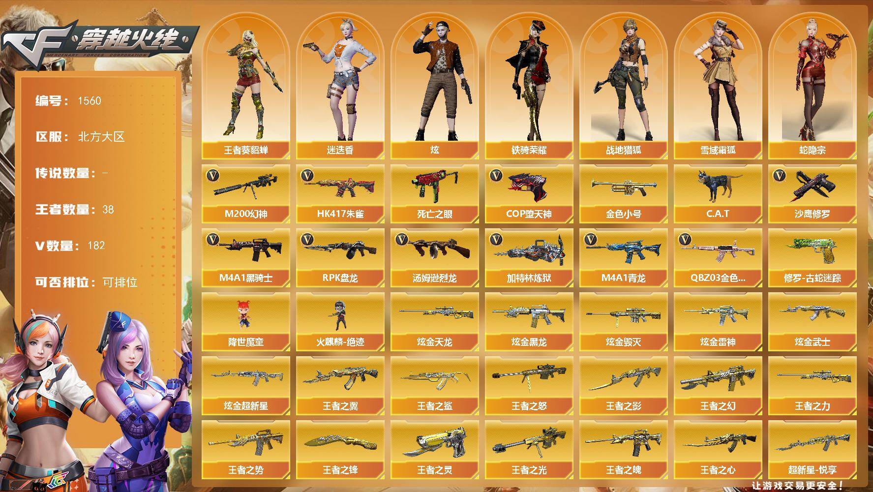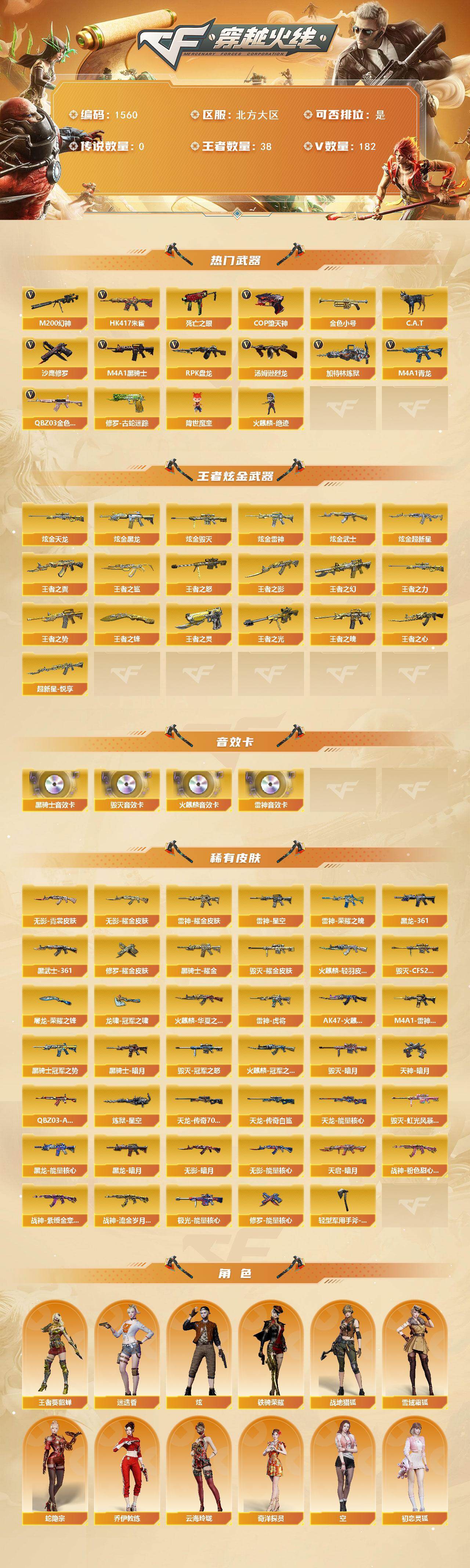 [15596888]北方大区-182V-38王者-9炫金 【热门武器】:QBZ03-金色蔷薇*3,HK417-朱雀,M4A1-青龙,M200-幻神,修罗-古蛇迷踪,死亡之眼,金色小号,C.A.T,M4A1-黑骑士*6,汤姆逊-烈龙*7,RPK-盘龙*2,加特林-炼狱*2,降世魔童,火麒麟-绝迹,COP-堕天神,沙鹰-修罗*5 【王者炫金武器】:王者之鲨,超新星-悦享,王者之幻*2,王者之翼*3,王者之势*2,王者之影,王者之魄*2,王者之心,王者之光,王者之怒*2,王者之力,王者之灵,王者之锋*3,炫金黑龙*4,炫金雷神,炫金武士,炫金超新星,炫金毁灭,炫金天龙 【音效卡】:AK47-火麒麟音效卡,M4A1-雷神音效卡,M4A1-黑骑士音效卡,Barrett-毁灭音效卡*2 【皮肤】:QBZ03-AG-CFPLS19冠军,雷神-荣耀之魄,雷神-星空*2,M4A1-雷神-CFS 2019,雷神-虎将,雷神-耀金皮肤,火麒麟-冠军之心,火麒麟-华夏之心,AK47-火麒麟-传奇EVEN,火麒麟-轻羽皮肤,毁灭-暗月*2,毁灭耀金皮肤,毁灭-冠军之怒,毁灭-CFS2020,毁灭-虹光风暴 皮肤,黑龙-能量核心*2,黑龙-暗月*2,M4A1-黑龙-361,黑骑士-暗月,黑骑士耀金皮肤*2,黑骑士-冠军之势,无影-暗月*4,无影-能量核心,无影耀金皮肤,无影-霓裳皮肤*2,AK47-黑武士-361*2,天启-暗月,战神-粉色甜心皮肤*12,战神-紫绶金章皮肤*36,战神-流金岁月皮肤*20,天龙-能量核心,AWM-天龙-传奇70KG*3,AWM-天龙-传奇白鲨*2,极光-能量核心*2,炼狱-星空,修罗-能量核心*4,修罗耀金皮肤*2,天神-暗月*2,屠龙-荣耀之锋*2,龙啸-冠军之啸,轻型军用手斧-再燃火线 【角色】:炫,迷迭香,战地猎狐,王者-葵-貂蝉,雪域霜狐,蛇隐宗,奇洋探员,乔伊教练,云海玲珑,空,初恋灵狐,兰-海滩派对,灵狐者-X,潘多拉-X,潜龙队-X,蛇姬,斯沃特-X,铁骑荣耀,新娜塔莎,樱-缤纷夏日,影武者-X 【人偶武器】:火麒麟-绝迹,火麒麟-灵狐*2,M4A1-雷神-精英刀锋,巴雷特-零-水下丽影,C.A.T,夺魂,迷你生化手雷,闪光弹-小乔,降世魔童 【暴走生化】:死亡之眼,超级对讲机 【英雄级武器】:M4A1-千变,AK47-火麒麟*8,M4A1-黑龙*6,M4A1-雷