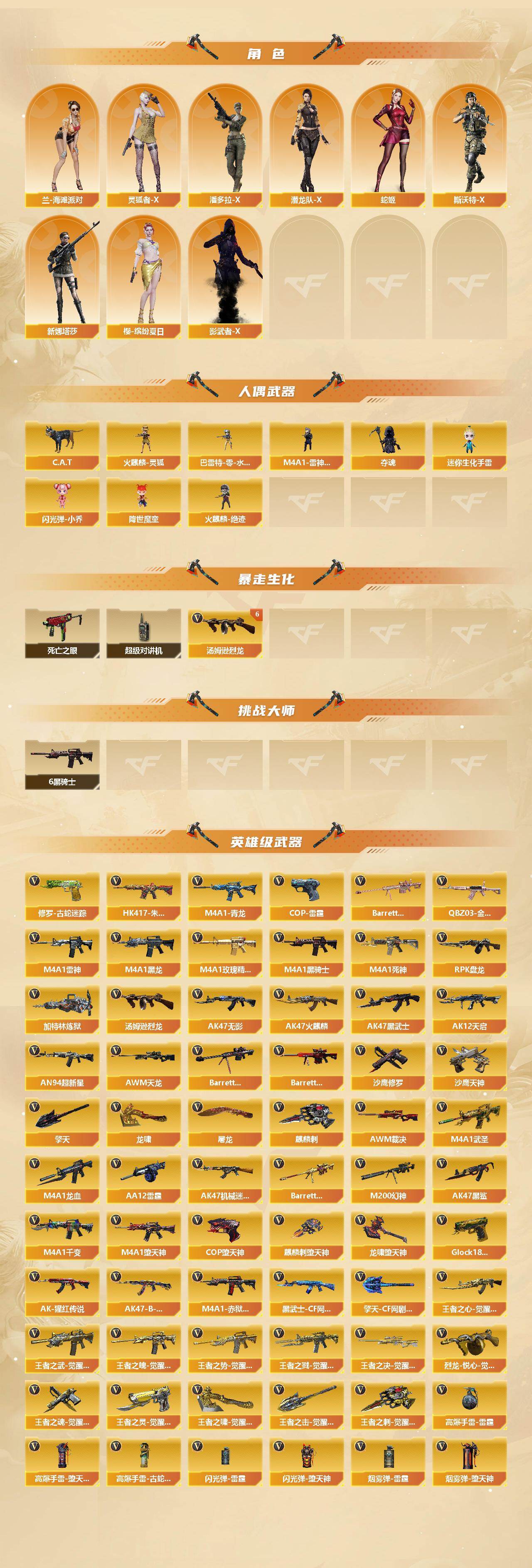 【英雄级武器】:M4A1-千变,AK47-火麒麟*8,M4A1-黑龙*6,M4A1-雷