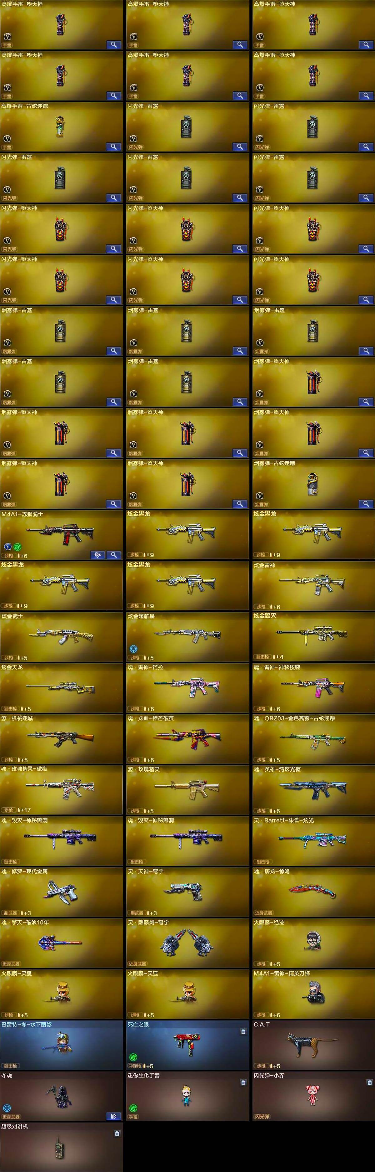 【热门武器】:QBZ03-金色蔷薇*3,HK417-朱雀,M4A1-青龙,M200-幻神,修罗-古蛇迷踪,死亡之眼,金色小号,C.A.T,M4A1-黑骑士*6,汤姆逊-烈龙*7,RPK-盘龙*2,加特林-炼狱*2,降世魔童,火麒麟-绝迹,COP-堕天神,沙鹰-修罗*5