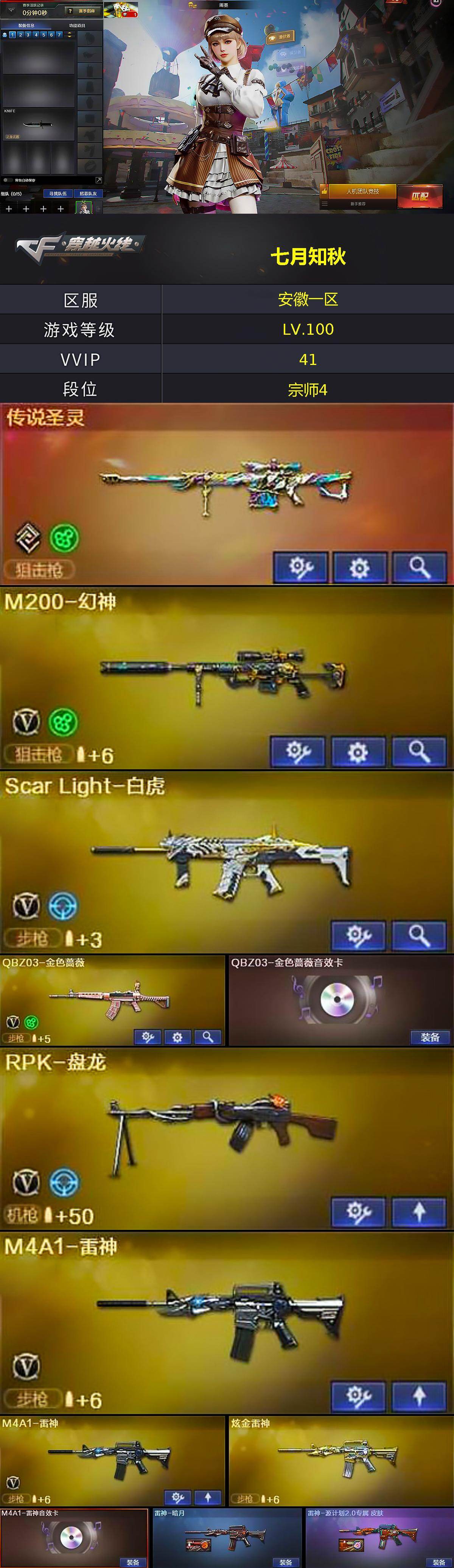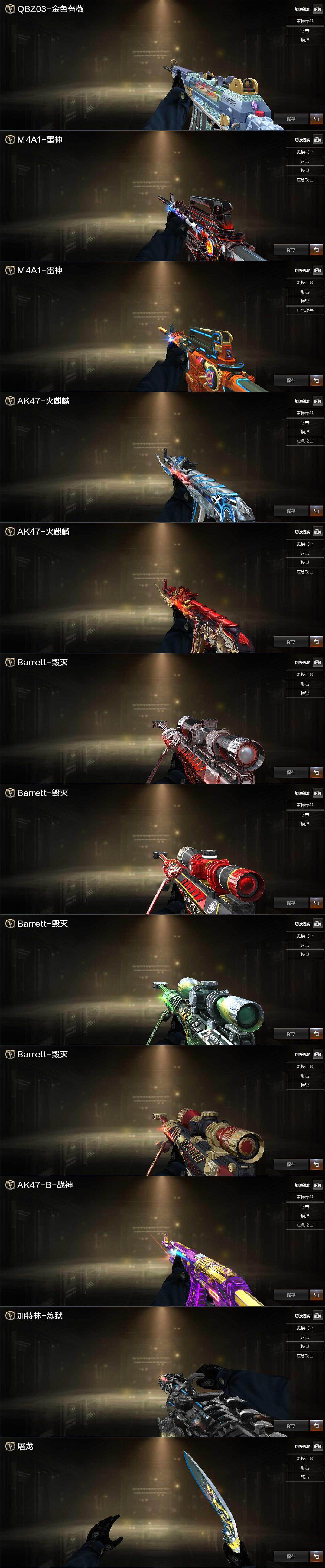 【热门武器】:传说圣灵,QBZ03-金色蔷薇,Scar Light-白虎,M200-幻神,死亡之眼,RPK-盘龙,加特林-炼狱*2,沙鹰-修罗*2,金刚伞