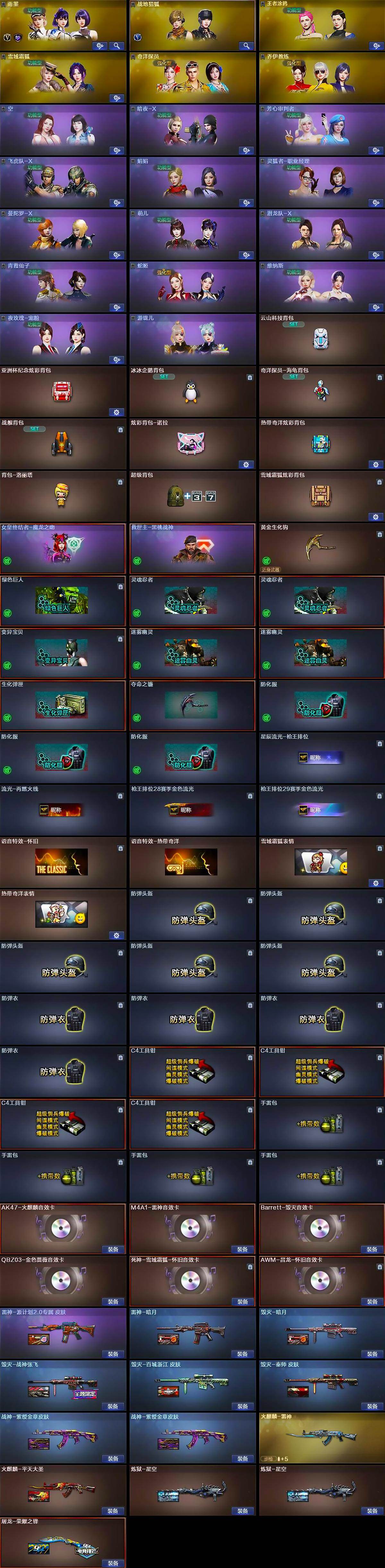 【道具】:云山科技背包,亚洲杯纪念炫彩背包,冰冰企鹅背包,奇洋探员-海龟背包,战舰背包,炫彩背包-诺拉,热带奇洋炫彩背包,背包-洛丽塔,超级背包,雪域霜狐炫彩背包,女皇终结者-魔龙之吻,救世主-黑桃战神,黄金生化钩,绿色巨人,灵魂忍者*2,变异宝贝,迷雾幽灵*2,生化弹匣,夺命之镰,防化服*3,星辰流光-枪王排位,流光-再燃火线,枪王排位28赛季金色流光,枪王排位29赛季金色流光,语音特效-怀旧,语音特效-热带奇洋,雪域霜狐表情,热带奇洋表情,防弹头盔*5,防弹衣*4,C4工具钳*4,手雷包*4
