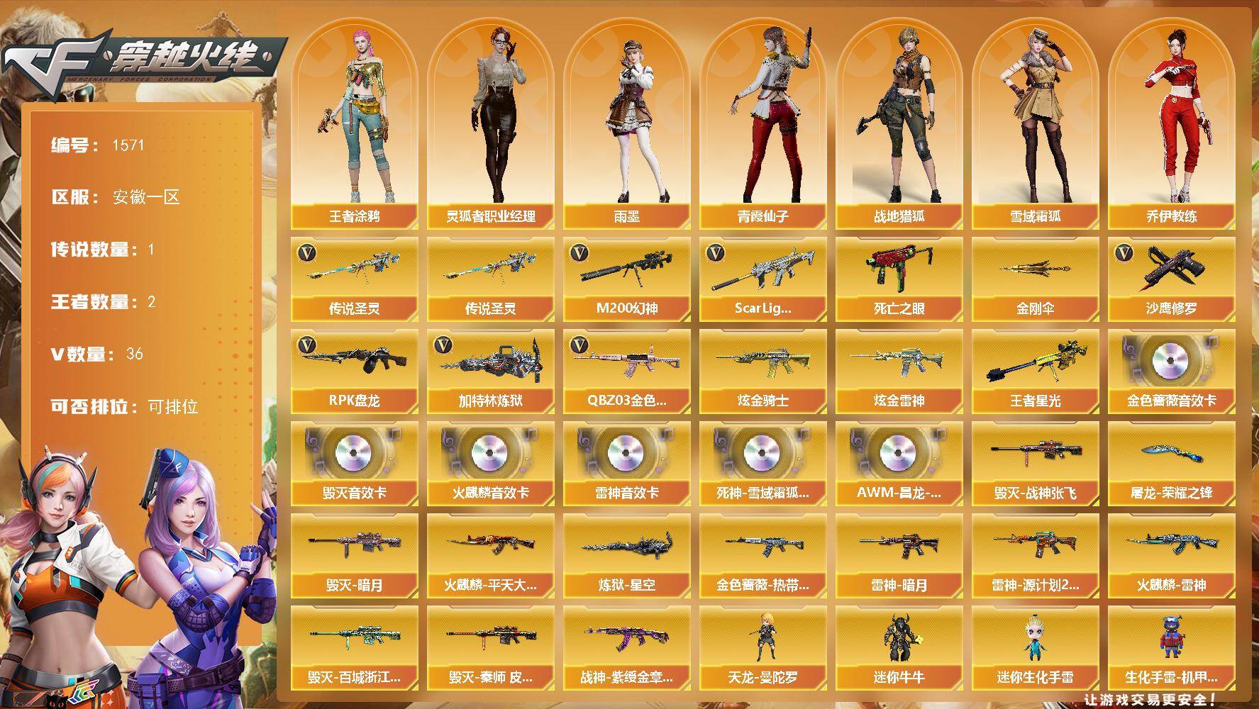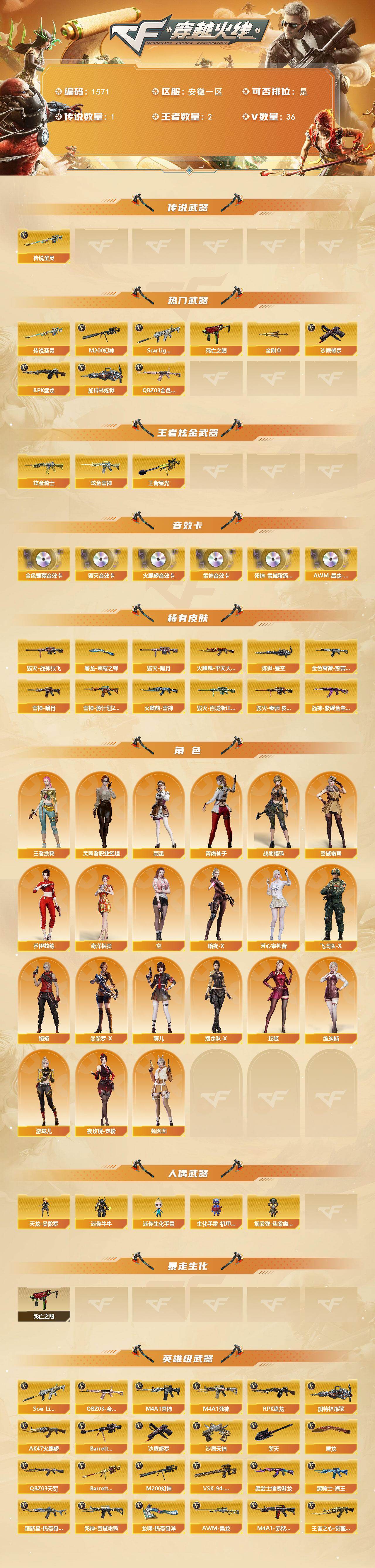 [15597547]安徽一区-36V-2王者-2炫金 【传说武器】:传说圣灵 【热门武器】:传说圣灵,QBZ03-金色蔷薇,Scar Light-白虎,M200-幻神,死亡之眼,RPK-盘龙,加特林-炼狱*2,沙鹰-修罗*2,金刚伞 【王者炫金武器】:王者星光,炫金骑士,炫金雷神 【音效卡】:AK47-火麒麟音效卡,M4A1-雷神音效卡,Barrett-毁灭音效卡,QBZ03-金色蔷薇音效卡,死神-雪域霜狐-怀旧音效卡,AWM-昌龙-怀旧音效卡 【皮肤】:金色蔷薇-热带奇洋 皮肤,雷神-暗月,雷神-源计划2.0专属 皮肤,火麒麟-雷神,火麒麟-平天大圣,毁灭-暗月,毁灭-战神张飞,毁灭-百城浙江 皮肤,毁灭-秦师 皮肤,战神-紫绶金章皮肤*2,炼狱-星空*2,屠龙-荣耀之锋 【角色】:雨墨,战地猎狐,王者涂鸦,雪域霜狐,奇洋探员,乔伊教练,空,暗夜-X,芳心审判者,飞虎队-X,娟娟,灵狐者-职业经理,曼陀罗-X,萌儿,潜龙队-X,青霞仙子,蛇姬,兔囡囡,维纳斯,夜玫瑰-宠粉,游珑儿 【人偶武器】:天龙-曼陀罗,迷你牛牛,迷你生化手雷,生化手雷-机甲核心,烟雾弹-迷雾幽灵 【暴走生化】:死亡之眼 【英雄级武器】:AK47-火麒麟,M4A1-雷神*2,M4A1-死神,Scar Light-白虎,QBZ03-天罚,黑武士-锦绣游龙,超新星-热带奇洋,死神-雪域霜狐,QBZ03-金色蔷薇,王者之心-觉醒版,黑骑士-海王*3,Barrett-毁灭,M200-幻神,Barrett-朱雀,VSK-94-金蚀,RPK-盘龙,加特林-炼狱*2,沙鹰-修罗*2,沙鹰-天神*3,屠龙*4,擎天,龙啸-热带奇洋,高爆手雷-幻灵,手雷-热带奇洋,闪光弹-幻灵*2,M4A1-赤狱骑士,AWM-昌龙 【道具】:云山科技背包,亚洲杯纪念炫彩背包,冰冰企鹅背包,奇洋探员-海龟背包,战舰背包,炫彩背包-诺拉,热带奇洋炫彩背包,背包-洛丽塔,超级背包,雪域霜狐炫彩背包,女皇终结者-魔龙之吻,救世主-黑桃战神,黄金生化钩,绿色巨人,灵魂忍者*2,变异宝贝,迷雾幽灵*2,生化弹匣,夺命之镰,防化服*3,星辰流光-枪王排位,流光-再燃火线,枪王排位28赛季金色流光,枪王排位29赛季金色流光,语音特效-怀旧,语音特效-热带奇洋,雪域霜狐表情,热带奇洋表情,防弹头盔*5,防弹衣*4,C4工具钳*4,手雷包*4 【特殊枪械】:1白虎