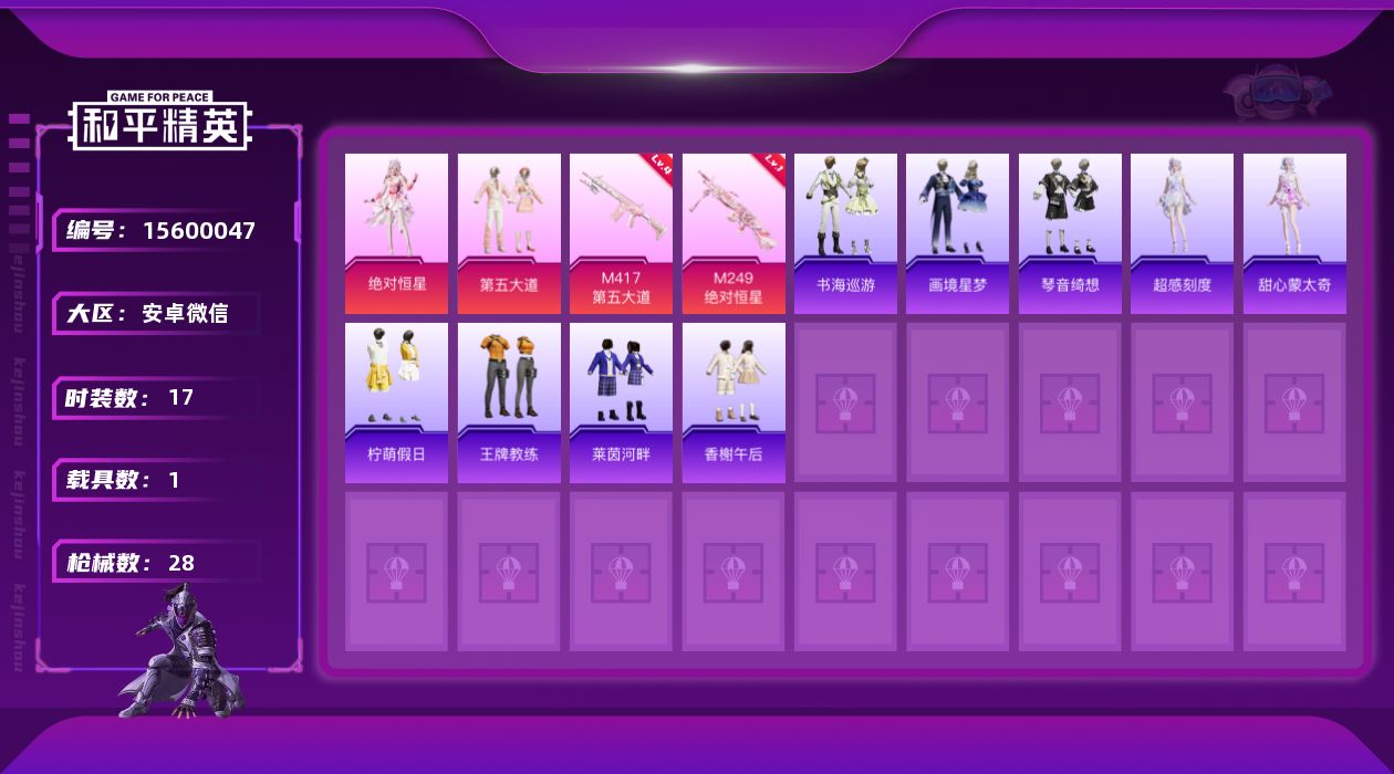 [15600047]【特价出售/店主推荐】安卓 微信-1神装-2粉装-2特效枪-1载具-3粉色飞行器-12282热力值-2王牌印记-17套装-28枪皮【红色神装等级】:暮色玫影-艾丽娅(二级)【红色角色神装】:暮色玫影-艾丽娅【粉色套装】:角色-绝对恒星,粉装-第五大道【粉色枪皮等级】:M417-第五大道(四级),M249-绝对恒星(一级)【粉色载具】:暮色幽蹄【粉色枪皮】:M417-第五大道,M249-绝对恒星【粉色飞行器】:绝对恒星飞行器,暮色之舞飞行器