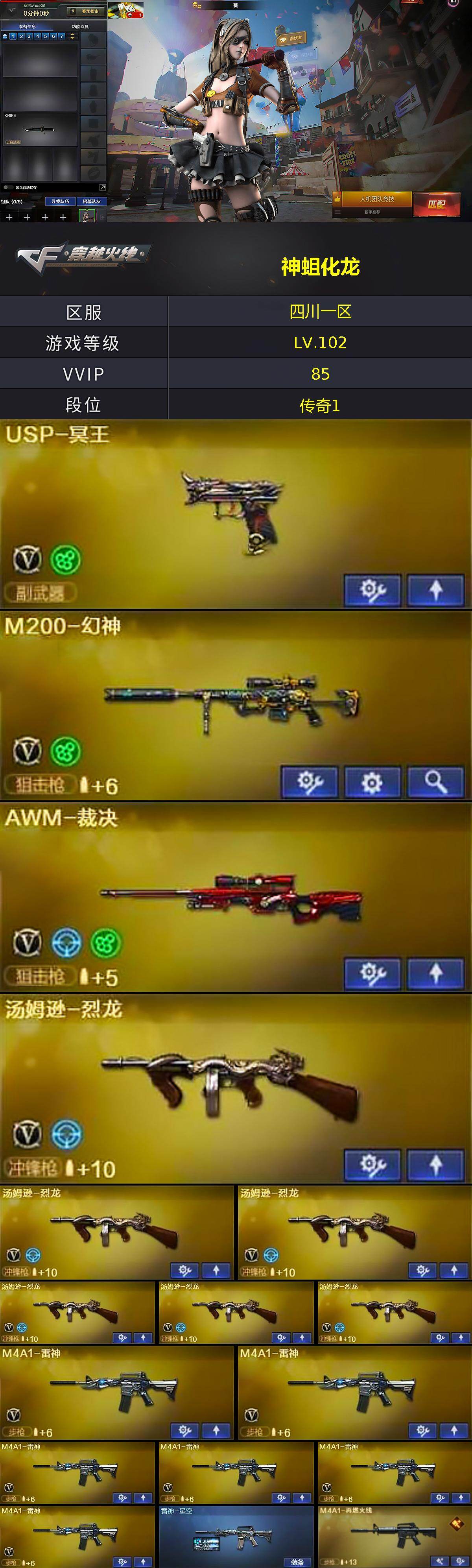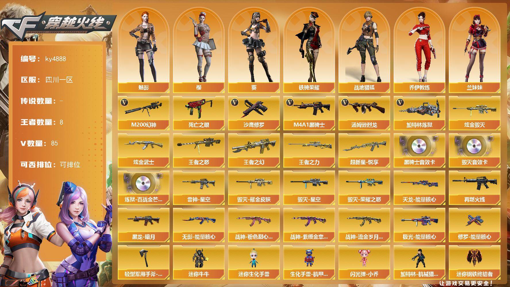 [15600306]四川一区-85V-8王者-3炫金 【热门武器】:M200-幻神,死亡之眼*2,M4A1-黑骑士,汤姆逊-烈龙*6,加特林-炼狱,沙鹰-修罗*3 【王者炫金武器】:超新星-悦享,王者之幻,王者之怒*2,王者之力,炫金武士,炫金毁灭*2 【音效卡】:M4A1-黑骑士音效卡,Barrett-毁灭音效卡,炼狱-百战金芒-庆典舞曲音效卡 【皮肤】:雷神-星空,M4A1-再燃火线,毁灭-荣耀之怒,毁灭耀金皮肤,毁灭-星空,黑龙-暗月,无影-能量核心,战神-粉色甜心皮肤,战神-紫绶金章皮肤*6,战神-流金岁月皮肤*4,天龙-能量核心,极光-能量核心,修罗-能量核心,轻型军用手斧-再燃火线 【角色】:葵,樱,魅影,战地猎狐,乔伊教练,兰妹妹,玫瑰花神,潘多拉-X,潜龙队-X,铁骑荣耀,新娜塔莎,影武者-X,智影 【人偶武器】:迷你钢铁终结者,加特林-机械猎手,迷你牛牛,迷你生化手雷,生化手雷-机甲核心,闪光弹-小乔 【暴走生化】:死亡之眼*2 【英雄级武器】:M4A1-千变,AK47-火麒麟*2,M4A1-黑龙,M4A1-雷神*6,M4A1-黑骑士,AK47-无影,M4A1-死神*2,AK47-黑武士,AN94-超新星*3,M4A1-武圣*2,AK47-机械迷城,AK47-黑鲨,M4A1-龙血*2,AK-47-猩红传说*7,AK47-B-战神,AWM-天龙*2,Barrett-毁灭*6,Barrett-极光,AWM-裁决,M200-幻神,加特林-炼狱,炼狱-百战金芒,汤姆逊-烈龙*6,AA-12-雷霆,沙鹰-修罗*3,沙鹰-天神*2,USP-冥王,王者之魂-觉醒版,Glock18-武圣,屠龙*5,龙啸,擎天,麒麟刺*3,斩神刀-雷暴,麒麟刺-百战金芒,王者之击-觉醒版,王者之刺-觉醒版,高爆手雷-雷暴,闪光弹-雷暴,烟雾弹-雷暴,烟雾弹-玄豹,M4A1-赤狱骑士 【道具】:BS战队炫彩背包,亚洲杯纪念炫彩背包,女皇终结者-背包,战舰背包,次元之矛-背包,炫彩背包-诺拉,炫彩背包,百战金芒炫彩背包,超级背包,迷你冰龙背包,女皇终结者-魔龙之吻,救世主-黑桃战神,妩媚妖姬,黄金生化钩,绿色巨人,灵魂忍者,变异宝贝,迷雾幽灵,夺命之镰,防化服*3,流光-鎏金之域,流光-再燃火线,枪王排位29赛季金色流光,语音特效-盛典烟火,萌萌小葵表情,防弹头盔*5,防弹衣*5,C4工具钳*3,手雷包