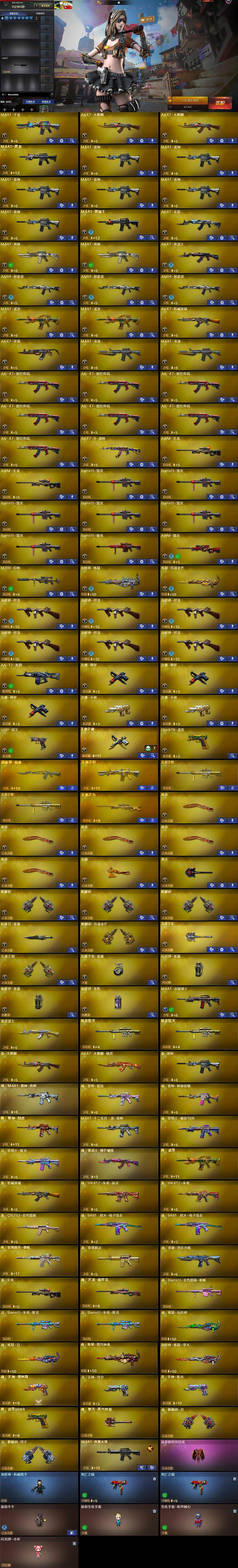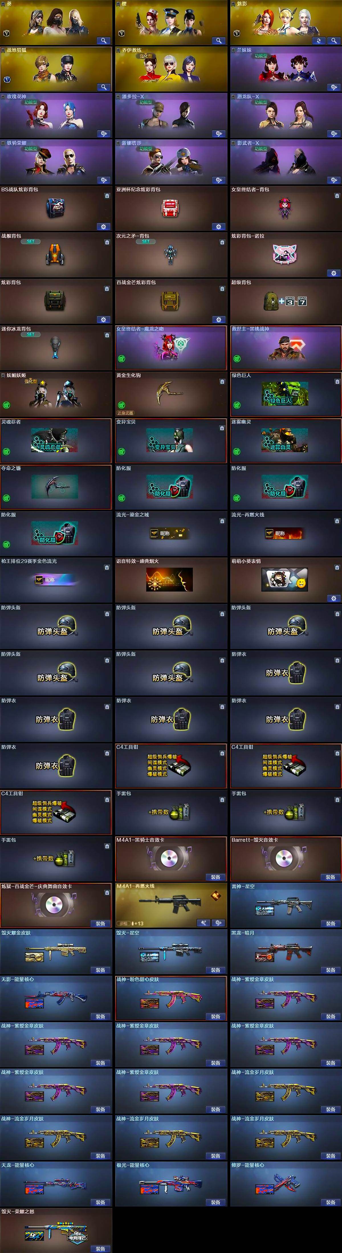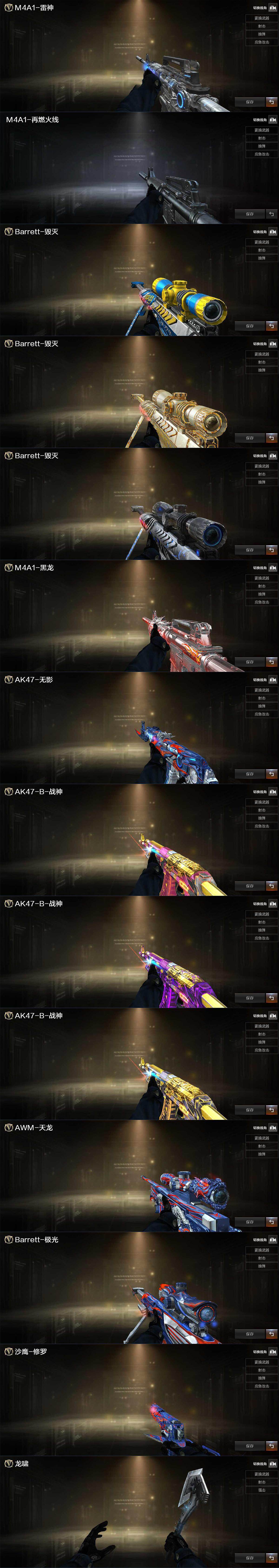 【英雄级武器】:M4A1-千变,AK47-火麒麟*2,M4A1-黑龙,M4A1-雷神*6,M4A1-黑骑士,AK47-无影,M4A1-死神*2,AK47-黑武士,AN94-超新星*3,M4A1-武圣*2,AK47-机械迷城,AK47-黑鲨,M4A1-龙血*2,AK-47-猩红传说*7,AK47-B-战神,AWM-天龙*2,Barrett-毁灭*6,Barrett-极光,AWM-裁决,M200-幻神,加特林-炼狱,炼狱-百战金芒,汤姆逊-烈龙*6,AA-12-雷霆,沙鹰-修罗*3,沙鹰-天神*2,USP-冥王,王者之魂-觉醒版,Glock18-武圣,屠龙*5,龙啸,擎天,麒麟刺*3,斩神刀-雷暴,麒麟刺-百战金芒,王者之击-觉醒版,王者之刺-觉醒版,高爆手雷-雷暴,闪光弹-雷暴,烟雾弹-雷暴,烟雾弹-玄豹,M4A1-赤狱骑士