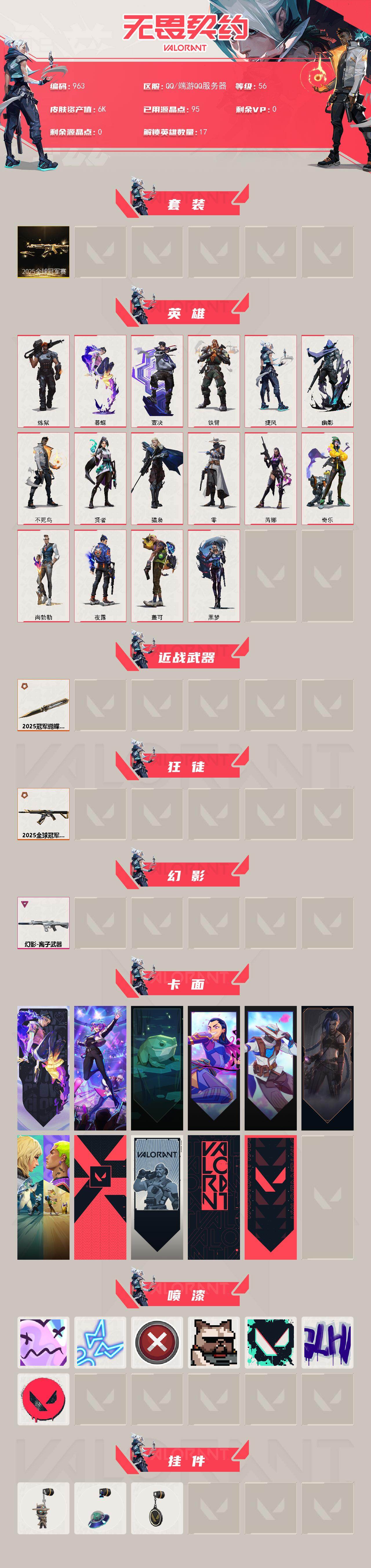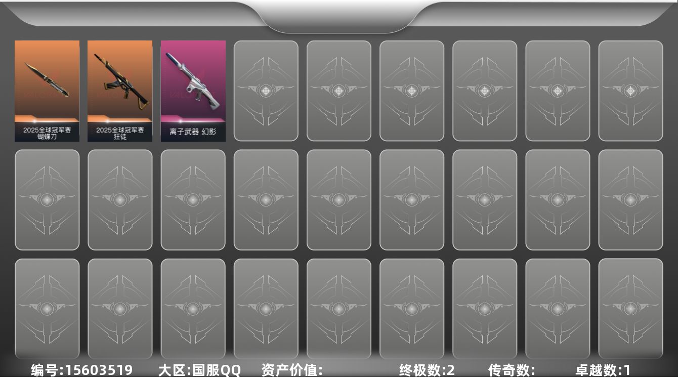 [15603519]【套装】:2025全球冠军赛套装 【英雄】:炼狱,暮蝶,壹决,铁臂,捷风,幽影,不死鸟,贤者,猎枭,零,芮娜,奇乐,尚勃勒,夜露,盖可,黑梦 【近战武器】:近战武器-2025全球冠军赛 蝴蝶刀 【狂徒】:狂徒-2025全球冠军赛 【幻影】:幻影-离子武器 【卡面】:无畏契约:暮蝶 卡面,超能偶像 卡面,霓帧牛蛙 卡面,无畏契约GO!第一卷:芮娜 卡面,无畏契约GO!第一卷:零 卡面,《双城之战》金克丝 卡面,钢锁vs盖可 卡面,代号红色 卡面,新兵报到 卡面,V契约 卡面,无畏契约 卡面 【喷漆】:伤心心 喷漆,霓光四射 喷漆,买装还是存钱 喷漆,关门放狗 喷漆,胜利属于无畏契约 喷漆,GLHF 喷漆,无畏契约 喷漆 【挂饰】:无畏契约GO!第一卷 零 挂饰,天外飞客 挂饰,无畏契约 纪念币 挂饰