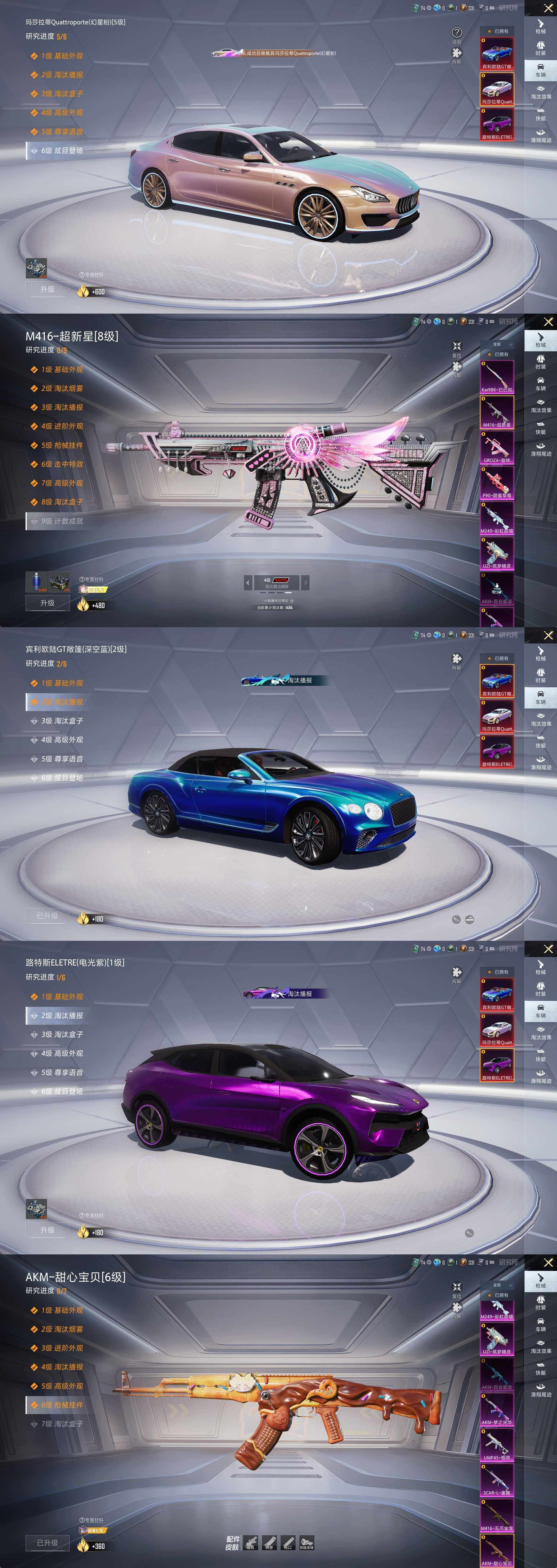 【粉色枪皮等级】:AKM-甜心宝贝(六级),AKM-梦之光华(二级),AKM-百合蜜语(二级),SCAR-L-童趣迷兔(五级),M416-五爪金龙(二级),M416-超新星(八级),GROZA-旋转彩虹(四级),UZI-筑梦精灵(四级),UMP45-相思残雪(四级),P90-甜蜜草莓(四级),Kar98K-巳巳如意(五级),M249-彩虹甜喵(四级)