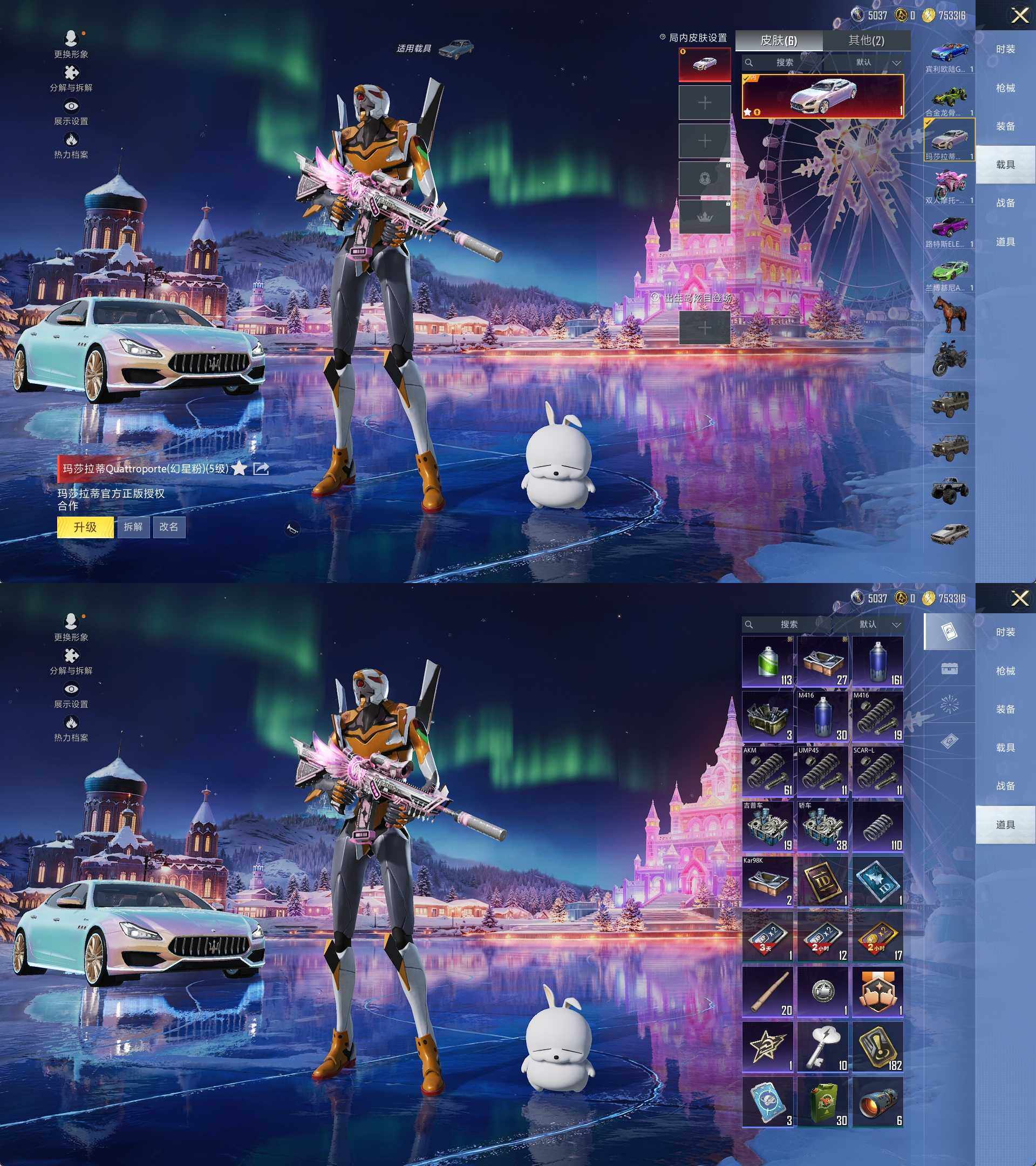 【粉色载具】:兰博基尼Aventador SVJ(翡翠绿),路特斯ELETRE(电光紫),玛莎拉蒂Quattroporte(幻星粉),宾利欧陆GT敞篷(深空蓝),合金龙骨(绿),双人摩托-梦幻火箭