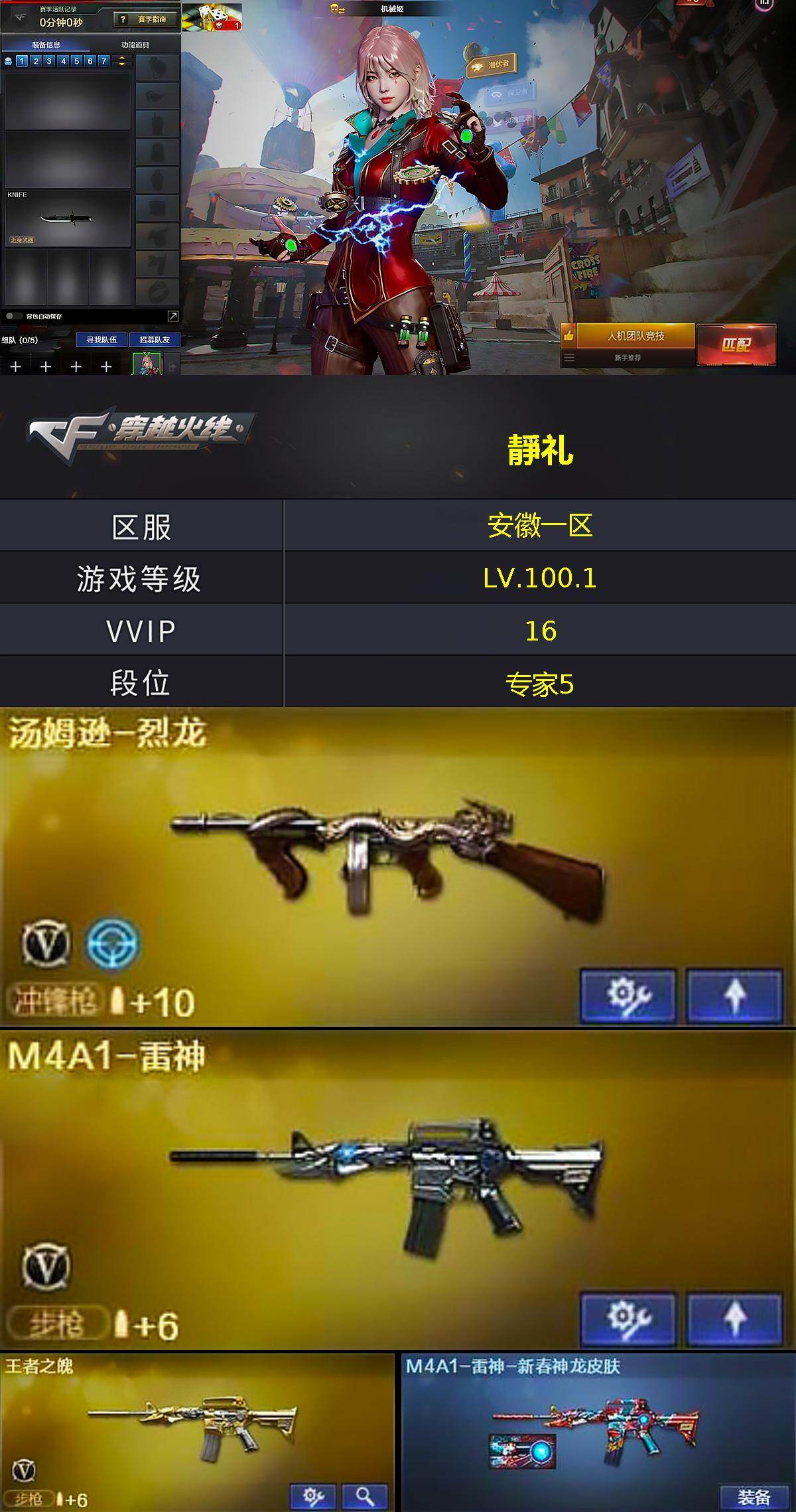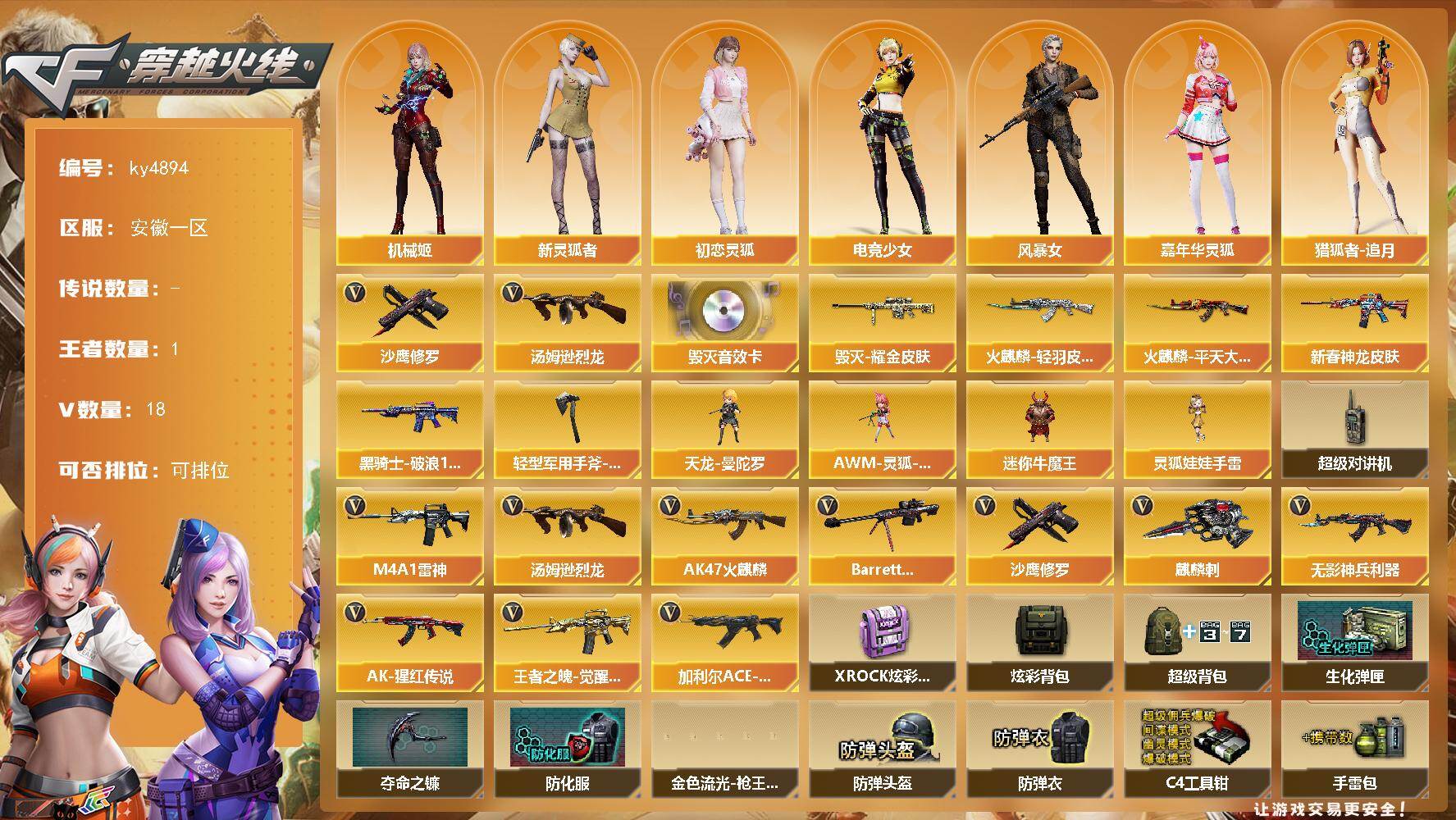 [15605410]安徽一区-18V-1王者-0炫金 【热门武器】:汤姆逊-烈龙,沙鹰-修罗*4 【音效卡】:Barrett-毁灭音效卡 【皮肤】:M4A1-雷神-新春神龙皮肤,火麒麟-轻羽皮肤,火麒麟-平天大圣,毁灭耀金皮肤,黑骑士-破浪10年皮肤,轻型军用手斧-再燃火线 【角色】:机械姬,初恋灵狐,电竞少女,风暴女,嘉年华灵狐,猎狐者-追月,灵狐者-黄金海岸,麻雀,曼陀罗-X,潘多拉-X,潜龙队-X,邱刚敖,斯沃特-X,新灵狐者,雪莉杨 【人偶武器】:天龙-曼陀罗,AWM-灵狐-15周年嘉年华,迷你牛魔王,灵狐娃娃手雷 【暴走生化】:超级对讲机 【英雄级武器】:AK47-火麒麟,M4A1-雷神,无影-神兵利器,王者之魄-觉醒版,AK-47-猩红传说,加利尔ACE-天袭,Barrett-毁灭,汤姆逊-烈龙,沙鹰-修罗*4,麒麟刺 【道具】:XROCK炫彩背包,炫彩背包,超级背包,生化弹匣,夺命之镰,防化服,金色流光-枪王排位*2,星辰流光-枪王排位,防弹头盔*2,防弹衣*2,C4工具钳*2,手雷包*2 【特殊枪械】:1烈龙