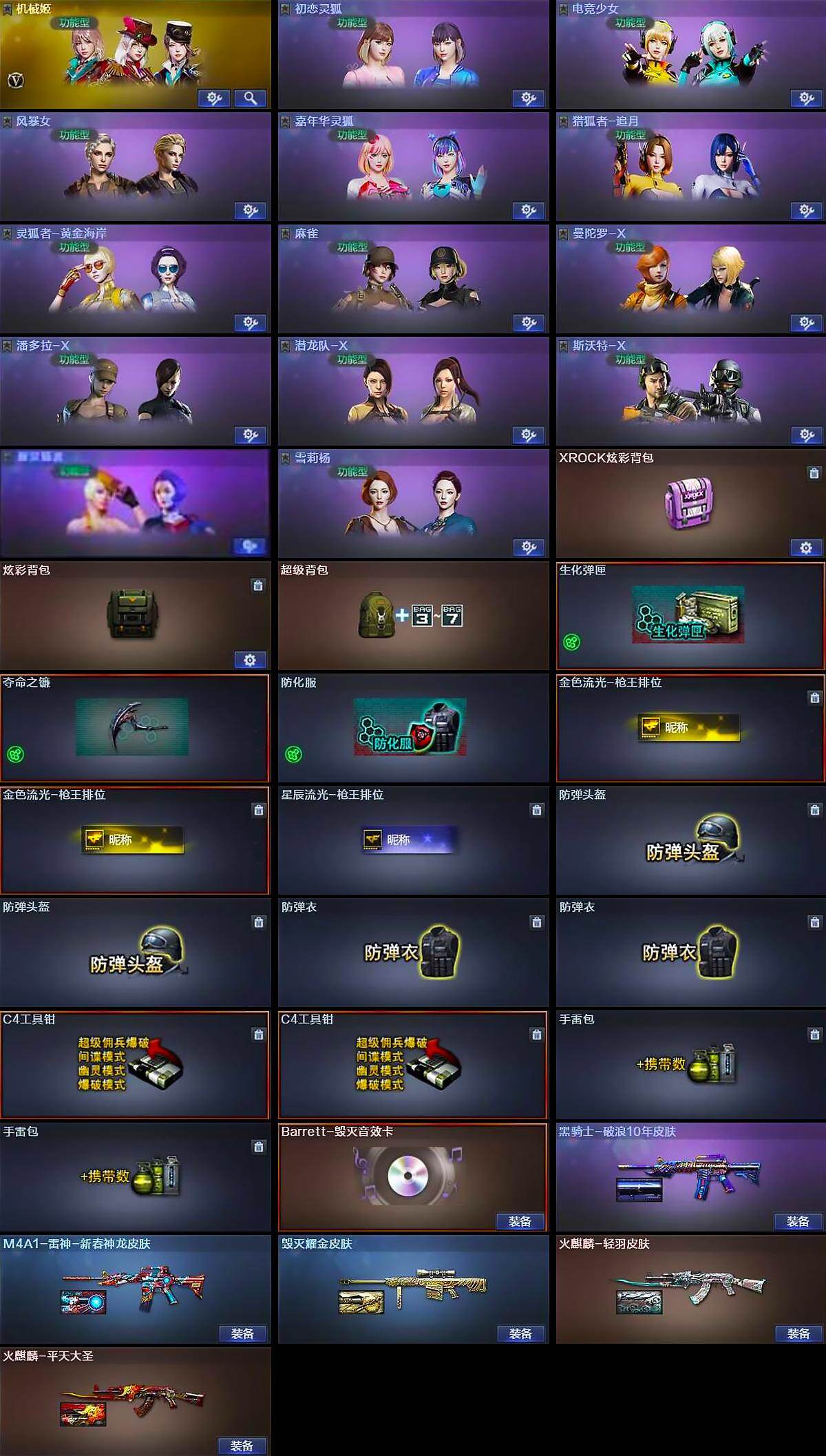 【道具】:XROCK炫彩背包,炫彩背包,超级背包,生化弹匣,夺命之镰,防化服,金色流光-枪王排位*2,星辰流光-枪王排位,防弹头盔*2,防弹衣*2,C4工具钳*2,手雷包*2