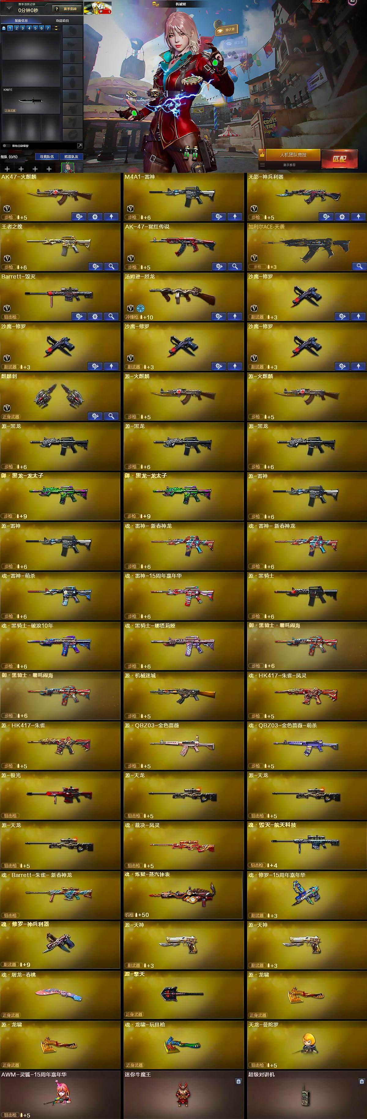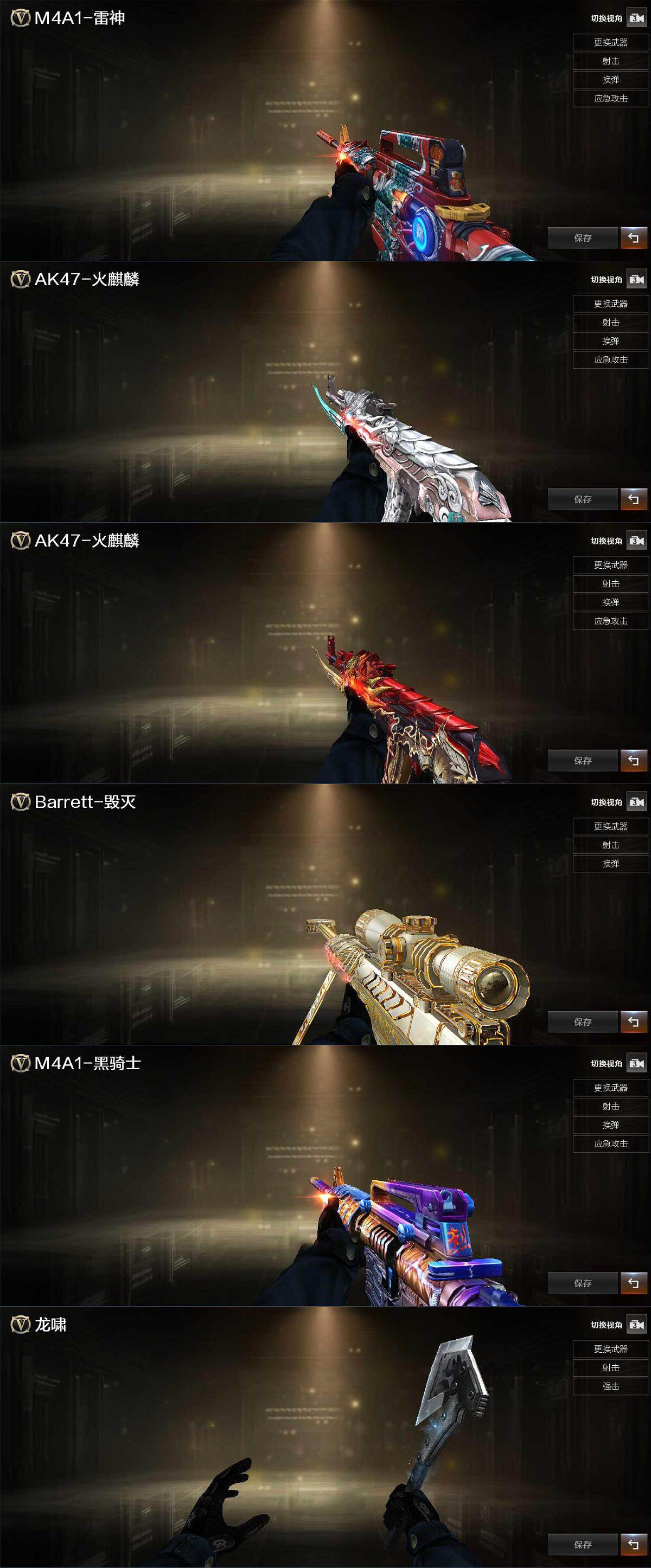 【英雄级武器】:AK47-火麒麟,M4A1-雷神,无影-神兵利器,王者之魄-觉醒版,AK-47-猩红传说,加利尔ACE-天袭,Barrett-毁灭,汤姆逊-烈龙,沙鹰-修罗*4,麒麟刺