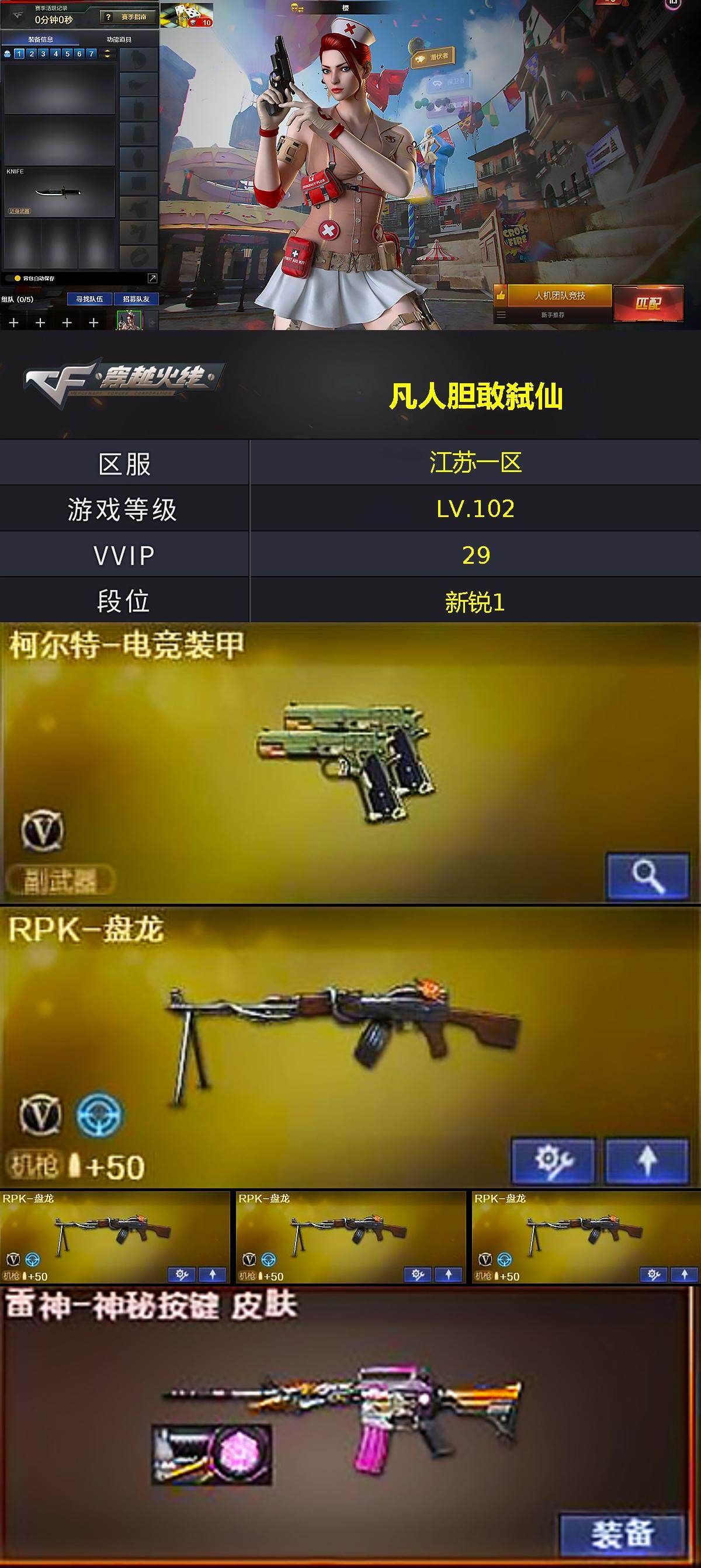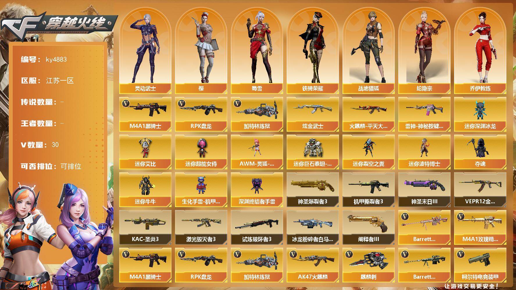 [15606422]江苏一区-30V-0王者-1炫金 【热门武器】:M4A1-黑骑士,RPK-盘龙*4,加特林-炼狱 【王者炫金武器】:炫金武士 【皮肤】:雷神-神秘按键 皮肤,火麒麟-平天大圣 【角色】:樱,战地猎狐,蛇隐宗,奇洋探员,乔伊教练,修道士,云海玲珑,暗夜-X,北极狐-X,初恋灵狐,芳心审判者,风暴女,嘉年华灵狐,灵动武士,灵狐者-X,灵狐者-七夕宝贝,龙儿,麻雀,曼陀罗-礼服,潘多拉-X,潘多拉-甜心教官,蛇姬,斯沃特-X,蜀雪,铁骑荣耀,兔囡囡,新娜塔莎,雪莉杨,雪莉杨-摸金校尉,夜玫瑰-幻能朋克,影武者-X 【人偶武器】:AWM-灵狐-15周年嘉年华,迷你深渊冰龙,迷你裂空之翼,迷你波特博士,夺魂,迷你牛牛*4,生化手雷-机甲核心*3,深渊终结者手雷,迷你艾比,迷你超能女侍,迷你巨石泰坦-魔花研究所 【挑战大师】:神圣爆裂者III,冰龙粉碎者-白马银枪,VEPR-12-金魔*2,激光毁灭者III*3,机甲撕裂者III,试炼破坏者III,KAC-圣炎切割者III,神圣爆裂者-末日III*2,阐释者III*3 【英雄级武器】:AK47-火麒麟,M4A1-黑骑士,无影-神兵利器,M4A1-玫瑰精灵,黑骑士-海王,Barrett-电竞装甲,Barrett-金色蔷薇,RPK-盘龙*4,加特林-炼狱,柯尔特-电竞装甲,麒麟刺*2,高爆手雷-古蛇迷踪,烟雾弹-古蛇迷踪,M4A1-赤狱骑士,AWM-昌龙*2,Barrett-碧霄极光*2 【道具】:BS战队炫彩背包,CFS限定背包,云山科技背包,亚洲杯纪念炫彩背包,冰冰企鹅背包,机械魔影背包-红色,炫彩背包-诺拉,虎牙炫彩背包,超级背包,黄金巨石泰坦-魔花研究所背包,黄金曼提柯尔的背包,女皇终结者-魔龙之吻,救世主-黑桃战神,黄金生化钩,绿色巨人,灵魂忍者,迷雾幽灵,夺命之镰*2,防化服*4,防弹头盔*3,防弹衣*3,C4工具钳*3,手雷包*3 【特殊枪械】:1黑骑士,4盘龙,1炼狱