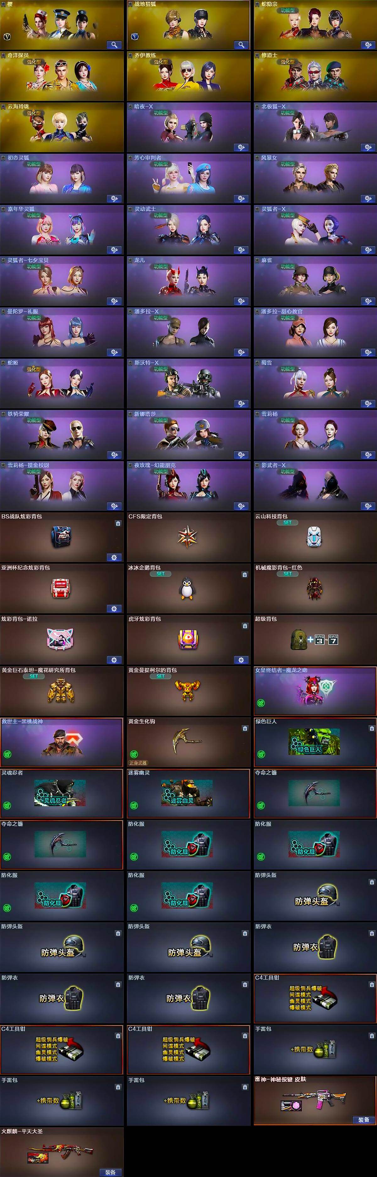 【道具】:BS战队炫彩背包,CFS限定背包,云山科技背包,亚洲杯纪念炫彩背包,冰冰企鹅背包,机械魔影背包-红色,炫彩背包-诺拉,虎牙炫彩背包,超级背包,黄金巨石泰坦-魔花研究所背包,黄金曼提柯尔的背包,女皇终结者-魔龙之吻,救世主-黑桃战神,黄金生化钩,绿色巨人,灵魂忍者,迷雾幽灵,夺命之镰*2,防化服*4,防弹头盔*3,防弹衣*3,C4工具钳*3,手雷包*3