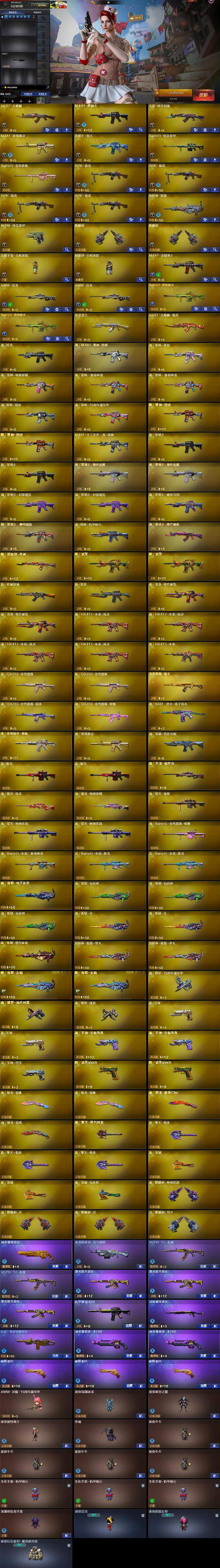 【英雄级武器】:AK47-火麒麟,M4A1-黑骑士,无影-神兵利器,M4A1-玫瑰精灵,黑骑士-海王,Barrett-电竞装甲,Barrett-金色蔷薇,RPK-盘龙*4,加特林-炼狱,柯尔特-电竞装甲,麒麟刺*2,高爆手雷-古蛇迷踪,烟雾弹-古蛇迷踪,M4A1-赤狱骑士,AWM-昌龙*2,Barrett-碧霄极光*2