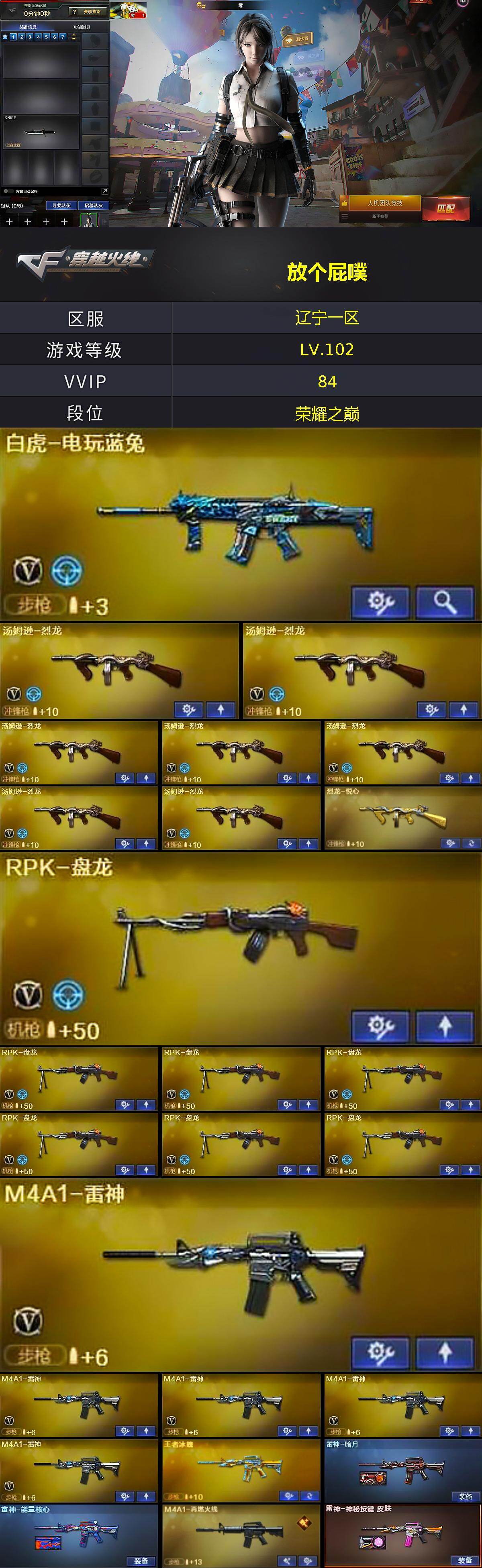【热门武器】:死亡之眼,白虎-电玩蓝兔,金色小号,C.A.T,M4A1-黑骑士*2,汤姆逊-烈龙*7,RPK-盘龙*7,加特林-炼狱,沙鹰-修罗*7
