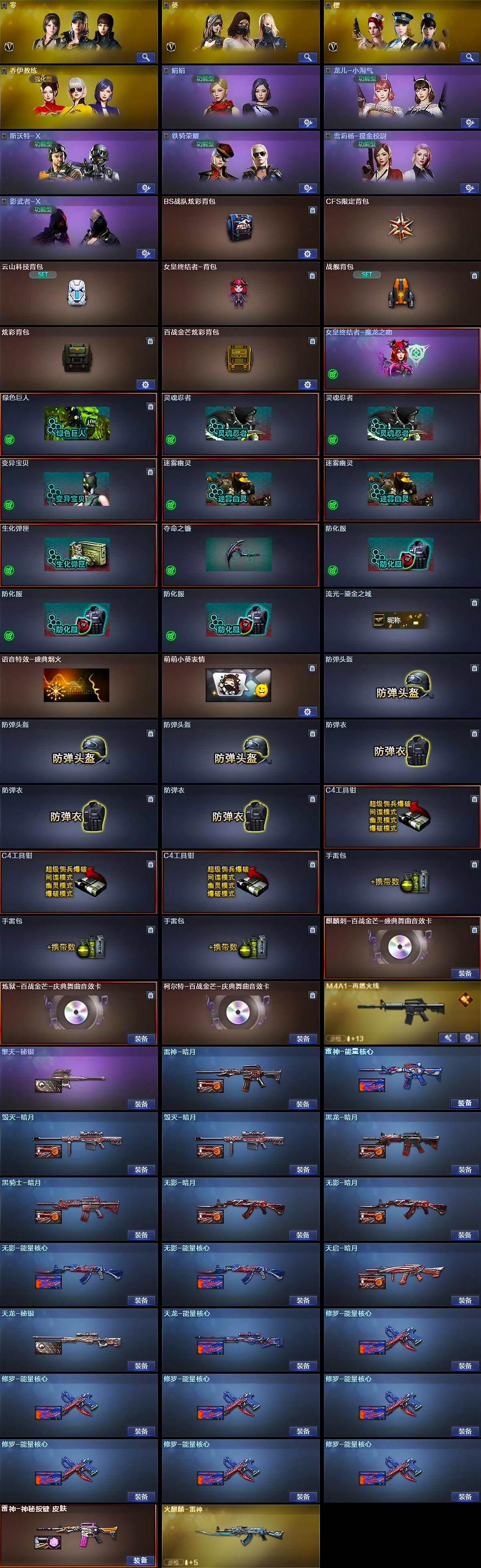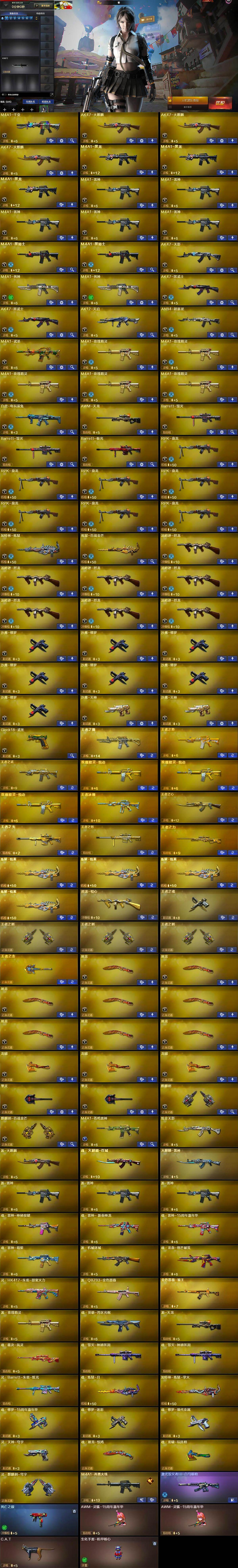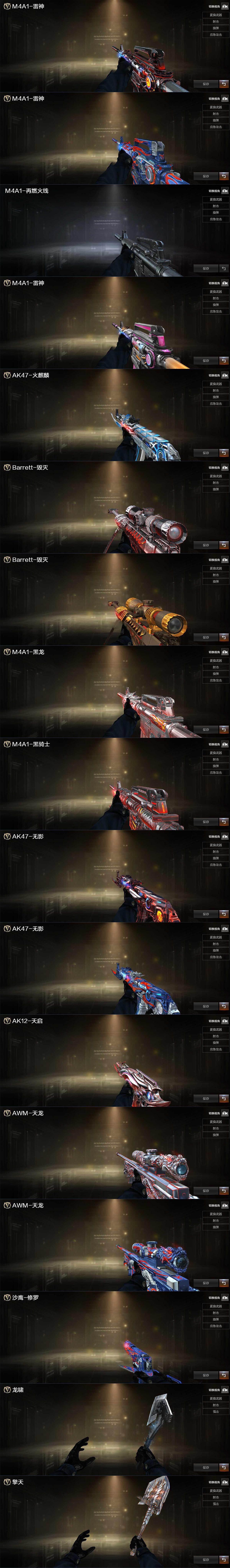 【英雄级武器】:M4A1-千变,AK47-火麒麟*3,M4A1-黑龙*3,M4A1-雷神*5,M4A1-黑骑士*2,AK47-无影,M4A1-死神*2,AK47-黑武士*2,AK12-天启,AN94-超新星,M4A1-武圣,M4A1-玫瑰精灵*5,白虎-电玩蓝兔,AWM-天龙,Barrett-毁灭*2,Barrett-极光,RPK-盘龙*7,加特林-炼狱,炼狱-百战金芒,汤姆逊-烈龙*7,沙鹰-修罗*7,沙鹰-天神*2,Glock18-武圣,屠龙*8,龙啸*3,擎天*2,麒麟刺,麒麟刺-百战金芒,M4A1-苍鸣雷神