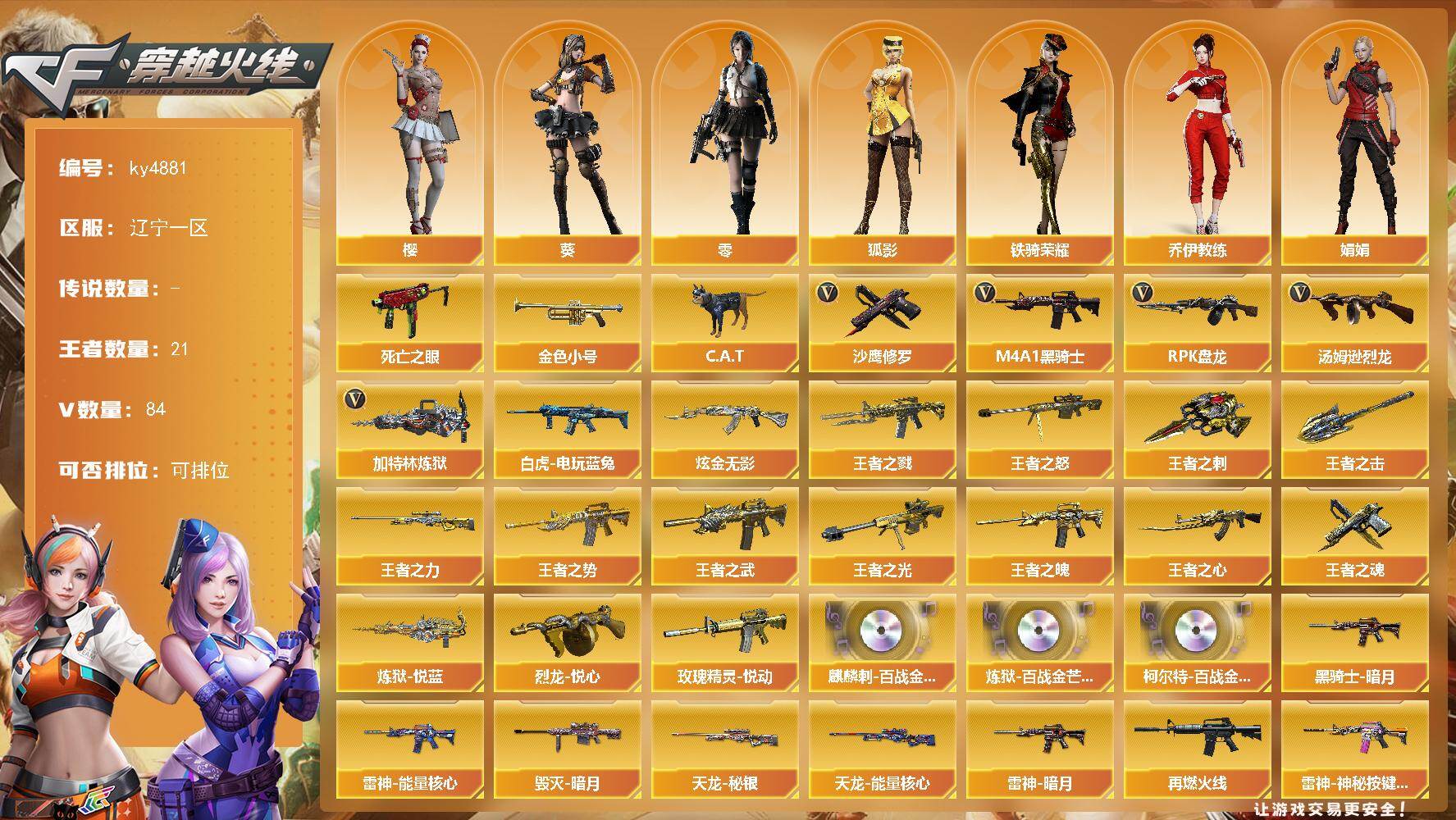 [15606873]辽宁一区-84V-21王者-1炫金 【热门武器】:死亡之眼,白虎-电玩蓝兔,金色小号,C.A.T,M4A1-黑骑士*2,汤姆逊-烈龙*7,RPK-盘龙*7,加特林-炼狱,沙鹰-修罗*7 【王者炫金武器】:王者之戮,王者之势,王者之武,玫瑰精灵-悦动*3,王者之魄,王者之心,王者之光,王者之怒,王者之力,炼狱-悦蓝*4,烈龙-悦心,王者之魂,王者之刺*3,王者之击,炫金无影 【音效卡】:麒麟刺-百战金芒-盛典舞曲音效卡,炼狱-百战金芒-庆典舞曲音效卡,柯尔特-百战金芒-庆典舞曲音效卡 【皮肤】:雷神-暗月,雷神-能量核心,M4A1-再燃火线,雷神-神秘按键 皮肤,火麒麟-雷神,毁灭-暗月*2,毁灭-英雄计划 皮肤,黑龙-暗月,黑骑士-暗月,无影-暗月*2,无影-能量核心*2,天启-暗月,天龙-秘银,天龙-能量核心,修罗-能量核心*7,轻型军用手斧-再燃火线,擎天-秘银 【角色】:零,葵,樱,狐影,乔伊教练,娟娟,龙儿-小淘气,斯沃特-X,铁骑荣耀,雪莉杨-摸金校尉,影武者-X,智影 【人偶武器】:AWM-灵狐-15周年嘉年华*2,C.A.T,生化手雷-机甲核心 【暴走生化】:死亡之眼 【挑战大师】:激光毁灭者III-白马银枪 【英雄级武器】:M4A1-千变,AK47-火麒麟*3,M4A1-黑龙*3,M4A1-雷神*5,M4A1-黑骑士*2,AK47-无影,M4A1-死神*2,AK47-黑武士*2,AK12-天启,AN94-超新星,M4A1-武圣,M4A1-玫瑰精灵*5,白虎-电玩蓝兔,AWM-天龙,Barrett-毁灭*2,Barrett-极光,RPK-盘龙*7,加特林-炼狱,炼狱-百战金芒,汤姆逊-烈龙*7,沙鹰-修罗*7,沙鹰-天神*2,Glock18-武圣,屠龙*8,龙啸*3,擎天*2,麒麟刺,麒麟刺-百战金芒,M4A1-苍鸣雷神 【道具】:BS战队炫彩背包,CFS限定背包,云山科技背包,女皇终结者-背包,战舰背包,炫彩背包,百战金芒炫彩背包,女皇终结者-魔龙之吻,绿色巨人,灵魂忍者*2,变异宝贝,迷雾幽灵*2,生化弹匣,夺命之镰,防化服*3,流光-鎏金之域,语音特效-盛典烟火,萌萌小葵表情,防弹头盔*3,防弹衣*3,C4工具钳*3,手雷包*3 【特殊枪械】:2黑骑士,6烈龙,6盘龙,1炼狱