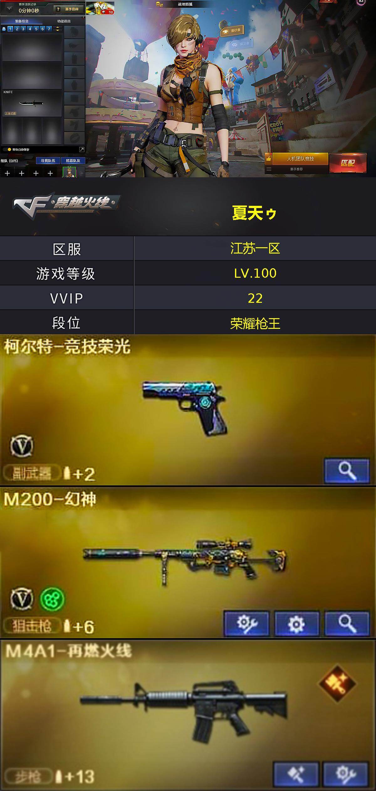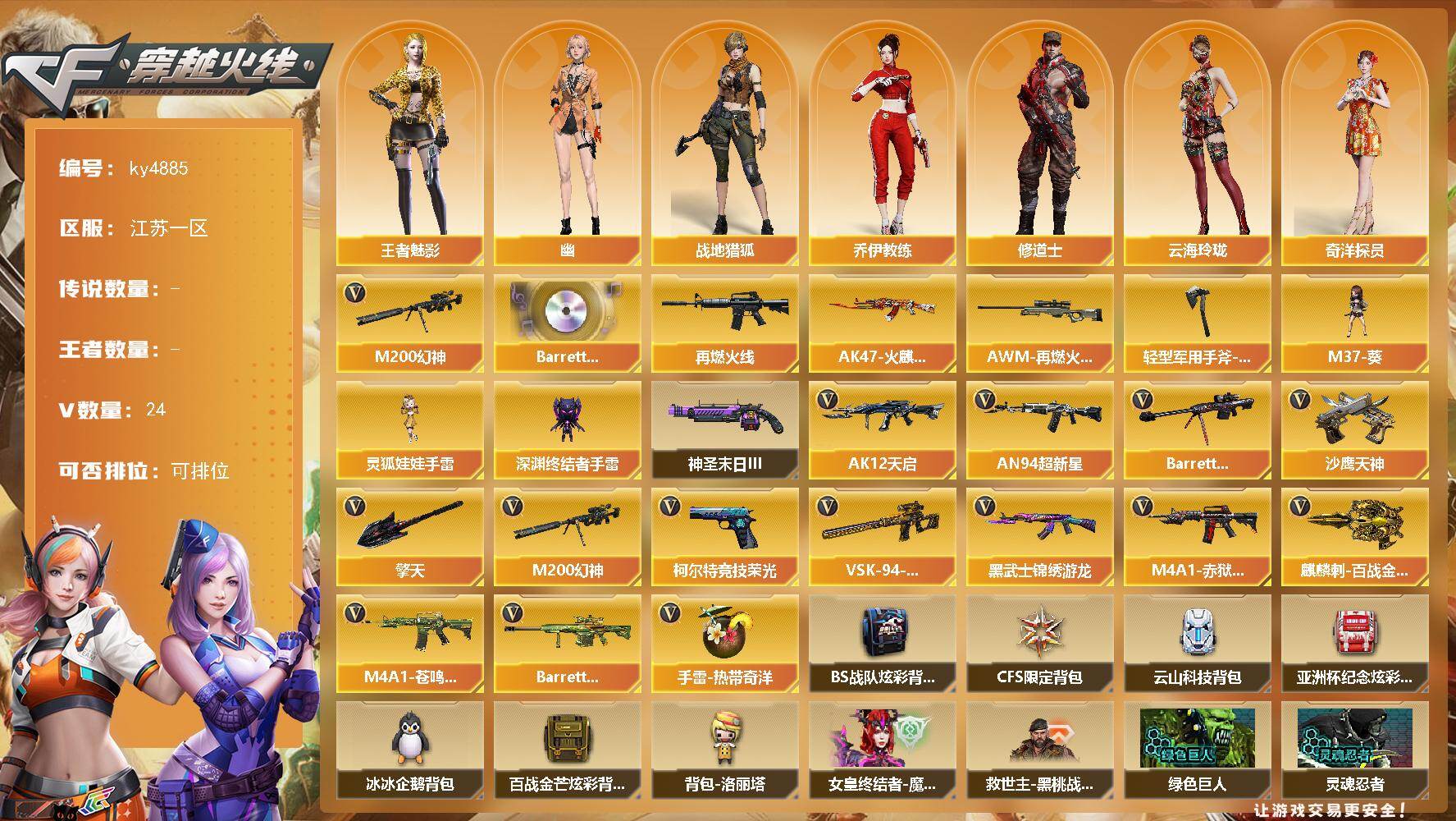 [15607058]江苏一区-24V-0王者-0炫金 【热门武器】:M200-幻神 【音效卡】:Barrett-碧霄极光音效卡 【皮肤】:M4A1-再燃火线,AK47-火麒麟-百城23冠军皮肤,AWM-再燃火线,轻型军用手斧-再燃火线 【角色】:战地猎狐,王者-魅影,奇洋探员,乔伊教练,修道士,云海玲珑,暗夜-X,曼陀罗-X,潘多拉-甜心教官,蛇姬,铁扇公主-暗灵,维纳斯,雪莉杨-摸金校尉,夜玫瑰-宠粉,幽 【人偶武器】:M37-葵,深渊终结者手雷,灵狐娃娃手雷 【挑战大师】:神圣爆裂者-末日III 【英雄级武器】:AK12-天启,AN94-超新星,黑武士-锦绣游龙,Barrett-毁灭,M200-幻神,VSK-94-金蚀,沙鹰-天神*2,柯尔特-竞技荣光,擎天,麒麟刺-百战金芒,手雷-热带奇洋,M4A1-赤狱骑士,M4A1-苍鸣雷神,Barrett-碧霄极光 【道具】:BS战队炫彩背包,CFS限定背包,云山科技背包,亚洲杯纪念炫彩背包,冰冰企鹅背包,百战金芒炫彩背包,背包-洛丽塔,女皇终结者-魔龙之吻,救世主-黑桃战神,黄金生化钩,绿色巨人,灵魂忍者*2,迷雾幽灵*2,夺命之镰,防化服*3,流光-鎏金之域,枪王排位28赛季金色流光,枪王排位29赛季金色流光,语音特效-盛典烟火,萌萌小葵表情,C4-再燃火线,防弹头盔*3,防弹衣*3,C4工具钳*3,手雷包*3 【特殊枪械】: