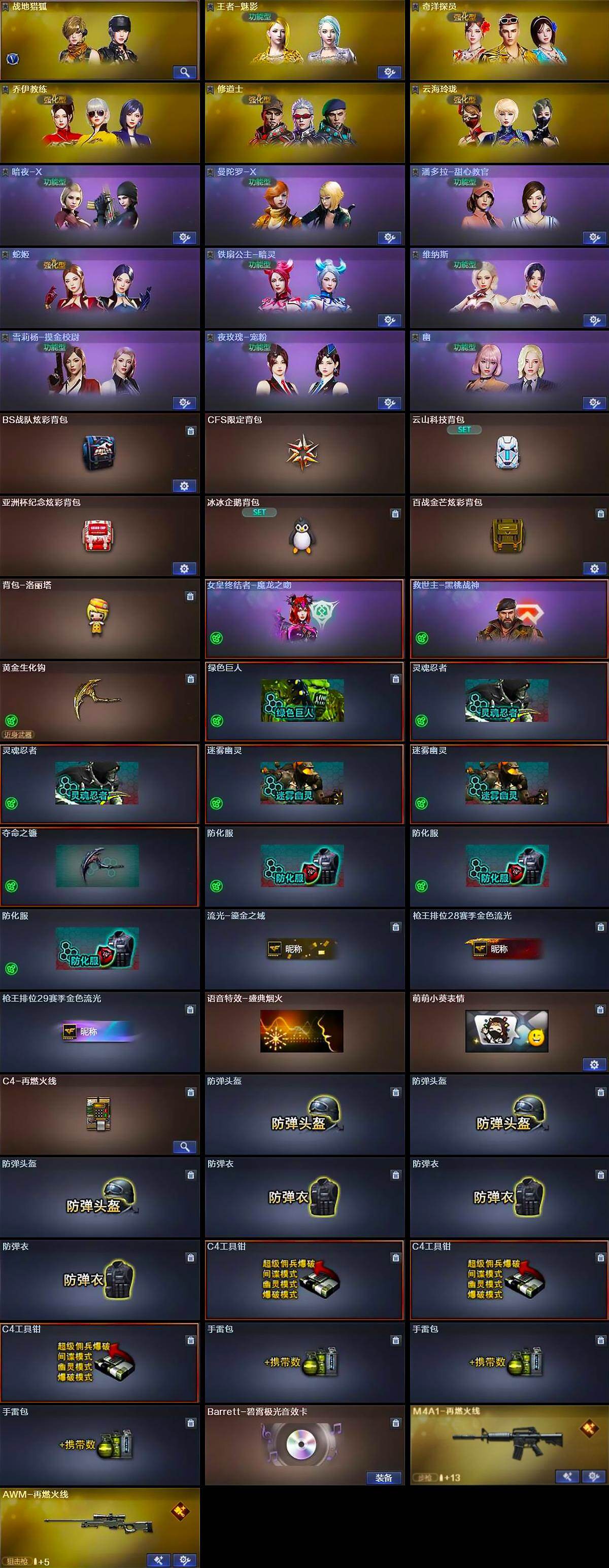 【道具】:BS战队炫彩背包,CFS限定背包,云山科技背包,亚洲杯纪念炫彩背包,冰冰企鹅背包,百战金芒炫彩背包,背包-洛丽塔,女皇终结者-魔龙之吻,救世主-黑桃战神,黄金生化钩,绿色巨人,灵魂忍者*2,迷雾幽灵*2,夺命之镰,防化服*3,流光-鎏金之域,枪王排位28赛季金色流光,枪王排位29赛季金色流光,语音特效-盛典烟火,萌萌小葵表情,C4-再燃火线,防弹头盔*3,防弹衣*3,C4工具钳*3,手雷包*3