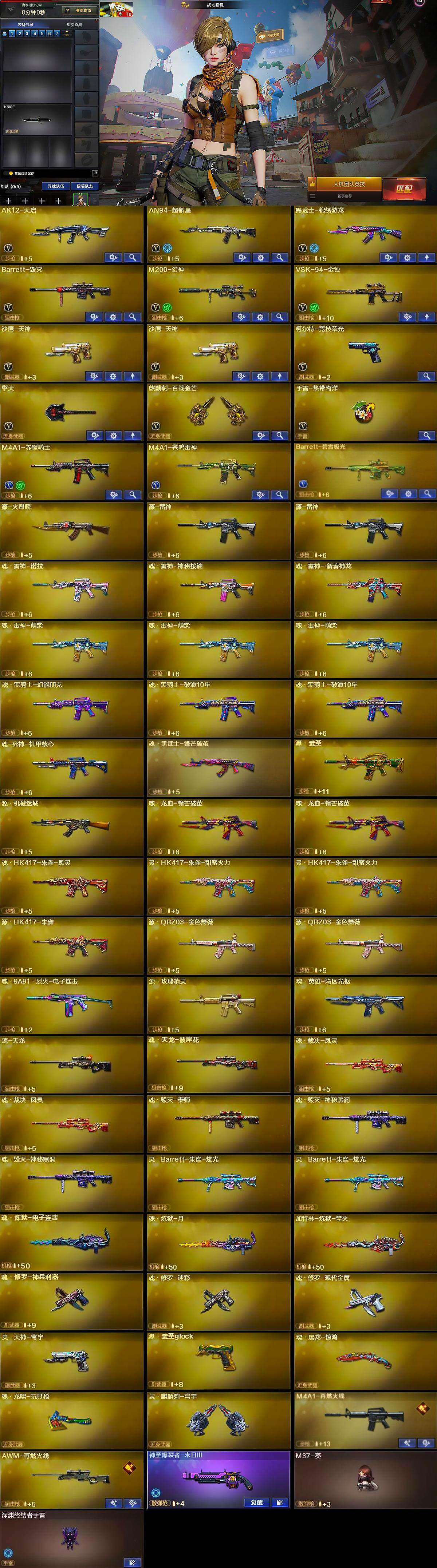 【英雄级武器】:AK12-天启,AN94-超新星,黑武士-锦绣游龙,Barrett-毁灭,M200-幻神,VSK-94-金蚀,沙鹰-天神*2,柯尔特-竞技荣光,擎天,麒麟刺-百战金芒,手雷-热带奇洋,M4A1-赤狱骑士,M4A1-苍鸣雷神,Barrett-碧霄极光