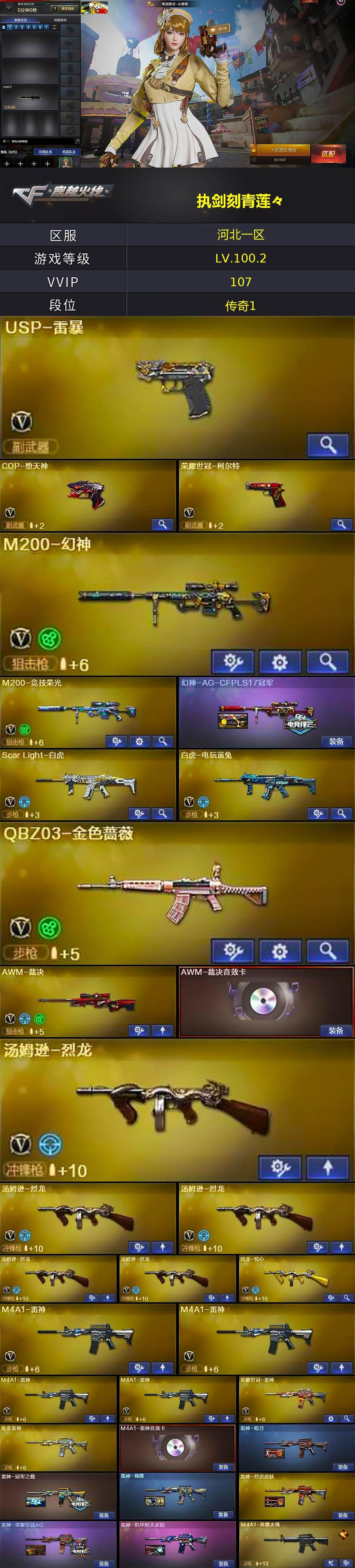 [15607145]河北一区-107V-16王者-2炫金 【热门武器】:QBZ03-金色蔷薇,Scar Light-白虎,HK417-朱雀,M4A1-青龙*2,M200-幻神,M200-竞技荣光,死亡之眼,荣耀世冠-雷神,白虎-电玩蓝兔,荣耀世冠-柯尔特,M4A1-黑骑士*5,汤姆逊-烈龙*5,加特林-炼狱*5,斯泰尔-蝴蝶,雷神-小红,USP-雷暴,COP-堕天神,沙鹰-修罗 【王者炫金武器】:炫金黑龙,炫金雷神 【音效卡】:M4A1-雷神音效卡,M4A1-黑骑士音效卡,Barrett-极光音效卡,AWM-裁决音效卡,HK417-朱雀音效卡,炼狱-百战金芒-庆典舞曲音效卡 【皮肤】:幻神-AG-CFPLS17冠军,雷神-暗月,雷神-冠军之魄,雷神-杨戬,雷神-烈虎皮肤,雷神-荣耀世冠AG,雷神-机甲刑天皮肤,M4A1-再燃火线,火麒麟-AG战队皮肤,传奇石头-横秒之巅,火麒麟-平天大圣,火麒麟-百城,AK47-火麒麟-百城23冠军皮肤,毁灭耀金皮肤,毁灭-风暴,毁灭-英雄计划 皮肤,M4A1-千变-孔明皮肤,黑骑士耀金皮肤,黑骑士-冠军之势,黑骑士-战神马超,死神-机甲核心皮肤,AK47-B-常胜将军-曹操,AK47-B-常胜将军-孙权*2,AWM-天龙-传奇70KG,极光-能量核心,炼狱-星空,屠龙-春桃 皮肤,龙啸-冠军之啸,轻型军用手斧-再燃火线,擎天-冠军之击 【角色】:电竞教官-云悠悠,战地猎狐,王者-葵-貂蝉,王者葵-惊若翩鸿,王者玲珑-小乔,乔伊教练,修道士,芳心审判者,风暴女,虎妞,嘉年华灵狐,兰-新年限定,灵狐者-七夕宝贝,龙儿,潘多拉-X,青霞仙子,甜心偶像,樱-战斗天使,影武者-X,职业选手 【人偶武器】:雷神-小红,天龙-曼陀罗,斯泰尔-蝴蝶,巴雷特-零-水下丽影,AWM-灵狐-15周年嘉年华,迷你深渊冰龙,迷你裂空之翼*7,夺魂,迷你生化手雷*2,生化手雷-机甲核心,深渊终结者手雷,闪光弹-貂蝉,高爆手雷-大乔,迷你艾比 【暴走生化】:异变清道夫,死亡之眼,超级对讲机 【挑战大师】:暴君乱世-超越Max,神圣爆裂者III,冰龙粉碎者-白马银枪,激光毁灭者III-白马银枪*4,VEPR-12-金魔,激光毁灭者III*2,机甲撕裂者III,阐释者III 【英雄级武器】:M4A1-千变,AK47-火麒麟*2,M4A1-雷神*4,M4A1-黑骑士*5,M4A1-死
