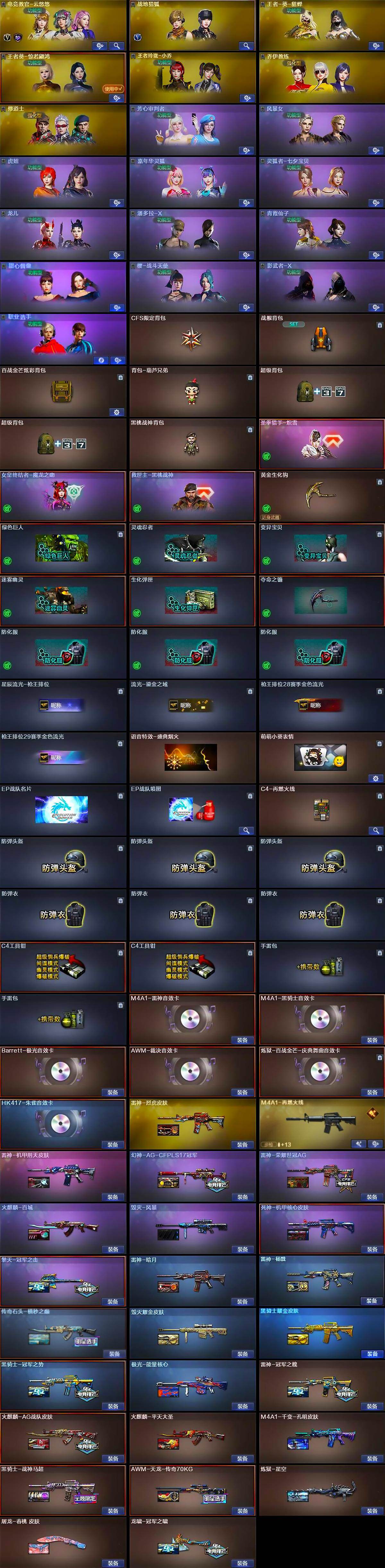 【皮肤】:幻神-AG-CFPLS17冠军,雷神-暗月,雷神-冠军之魄,雷神-杨戬,雷神-烈虎皮肤,雷神-荣耀世冠AG,雷神-机甲刑天皮肤,M4A1-再燃火线,火麒麟-AG战队皮肤,传奇石头-横秒之巅,火麒麟-平天大圣,火麒麟-百城,AK47-火麒麟-百城23冠军皮肤,毁灭耀金皮肤,毁灭-风暴,毁灭-英雄计划 皮肤,M4A1-千变-孔明皮肤,黑骑士耀金皮肤,黑骑士-冠军之势,黑骑士-战神马超,死神-机甲核心皮肤,AK47-B-常胜将军-曹操,AK47-B-常胜将军-孙权*2,AWM-天龙-传奇70KG,极光-能量核心,炼狱-星空,屠龙-春桃 皮肤,龙啸-冠军之啸,轻型军用手斧-再燃火线,擎天-冠军之击