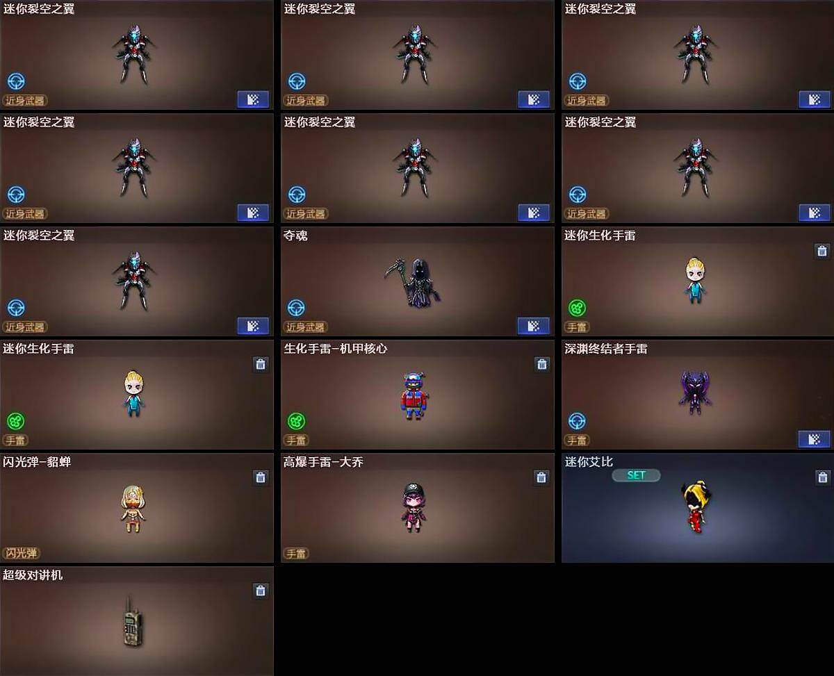 【人偶武器】:雷神-小红,天龙-曼陀罗,斯泰尔-蝴蝶,巴雷特-零-水下丽影,AWM-灵狐-15周年嘉年华,迷你深渊冰龙,迷你裂空之翼*7,夺魂,迷你生化手雷*2,生化手雷-机甲核心,深渊终结者手雷,闪光弹-貂蝉,高爆手雷-大乔,迷你艾比