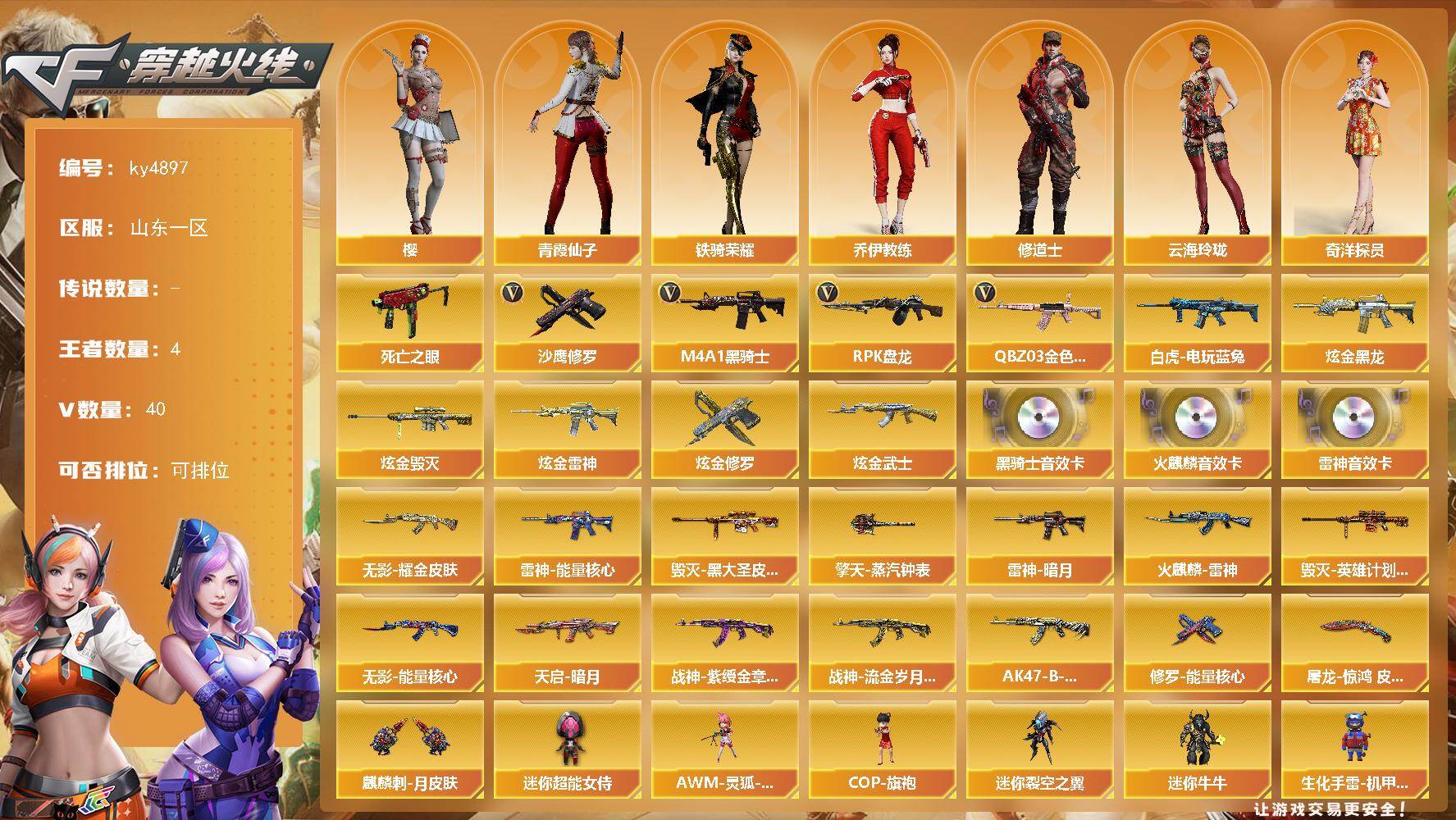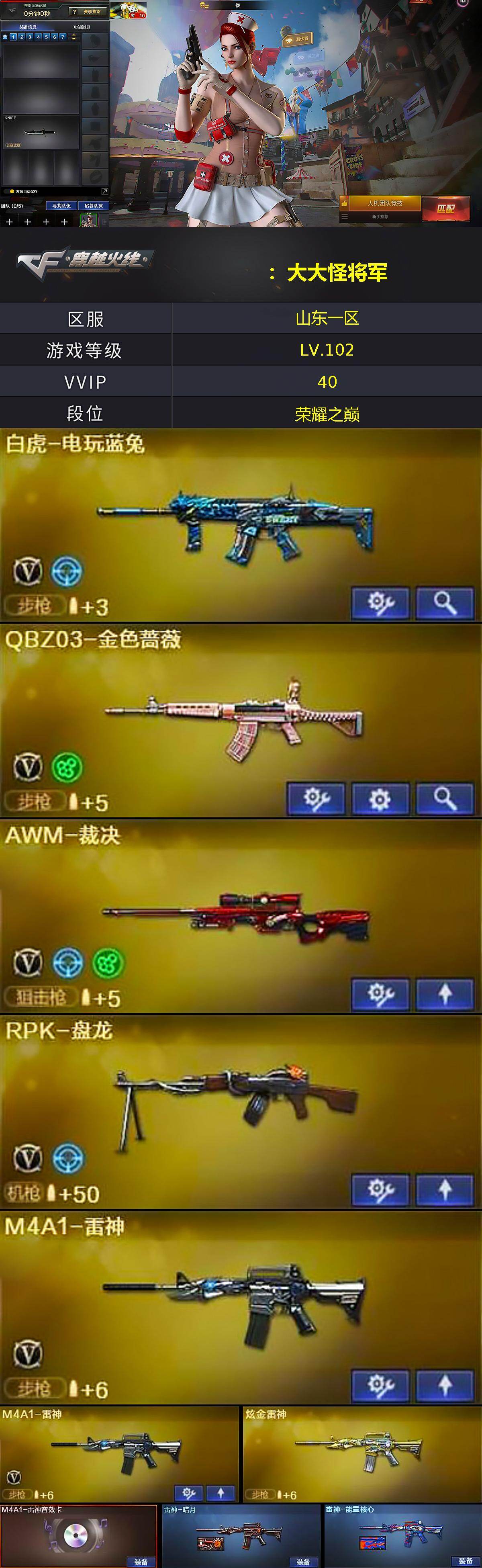 [15607230]山东一区-40V-4王者-6炫金 【热门武器】:QBZ03-金色蔷薇,死亡之眼*2,白虎-电玩蓝兔,M4A1-黑骑士,RPK-盘龙,沙鹰-修罗*6 【王者炫金武器】:炫金黑龙,炫金雷神,炫金武士,炫金毁灭,炫金修罗*2 【音效卡】:AK47-火麒麟音效卡,M4A1-雷神音效卡,M4A1-黑骑士音效卡 【皮肤】:雷神-暗月,雷神-能量核心,火麒麟-雷神,毁灭-黑大圣皮肤,毁灭-英雄计划 皮肤,无影-能量核心,无影耀金皮肤,天启-暗月,战神-紫绶金章皮肤,战神-流金岁月皮肤*2,AK47-B-常胜将军-刘备,修罗-能量核心,屠龙-惊鸿 皮肤,擎天-蒸汽钟表 皮肤,麒麟刺-月皮肤 【角色】:樱,奇洋探员,乔伊教练,修道士,云海玲珑,芳心审判者,风暴女,虎妞,猎狐者-追月,潘多拉-甜心教官,青霞仙子,斯沃特-X,铁骑荣耀,五号兵器-赛博朋克,雪莉杨-摸金校尉,夜玫瑰-宠粉,樱-战斗天使,影武者-X 【人偶武器】:AWM-灵狐-15周年嘉年华,COP-旗袍,迷你裂空之翼,迷你牛牛*2,生化手雷-机甲核心*3,迷你超能女侍 【暴走生化】:死亡之眼*2,超级对讲机 【挑战大师】:AK47-冰龙粉碎者,激光毁灭者III-白马银枪,KAC-圣炎切割者III 【英雄级武器】:AK47-火麒麟,M4A1-黑龙,M4A1-雷神*2,M4A1-黑骑士,AK47-无影,M4A1-死神*2,AK47-黑武士,M4A1-龙血,黑武士-锦绣游龙,M4A1-玫瑰精灵,QBZ03-金色蔷薇,王者之影-觉醒版,AK-47-猩红传说,黑骑士-海王*2,AK47-B-常胜将军*2,白虎-电玩蓝兔,AWM-天龙*2,Barrett-毁灭,Barrett-极光,AWM-裁决,RPK-盘龙,炼狱-悦蓝-觉醒版,沙鹰-修罗*6,屠龙*2,龙啸,擎天,麒麟刺,闪光弹-雷霆王者-觉醒版,M4A1-赤狱骑士 【道具】:BS战队炫彩背包,CFS限定背包,云山科技背包,亚洲杯纪念炫彩背包,战舰背包,炫彩背包,超级背包,女皇终结者-魔龙之吻,救世主-黑桃战神,黄金生化钩,绿色巨人,灵魂忍者*2,变异宝贝,迷雾幽灵,生化弹匣,夺命之镰,防化服*3,金色流光-枪王排位*2,星辰流光-枪王排位,流光-再燃火线,枪王排位28赛季金色流光,电玩兔兔表情*2,动感闪耀表情,EP战队名片,EP战队喷图,EP战队击杀图标,防弹头盔*3,防弹衣
