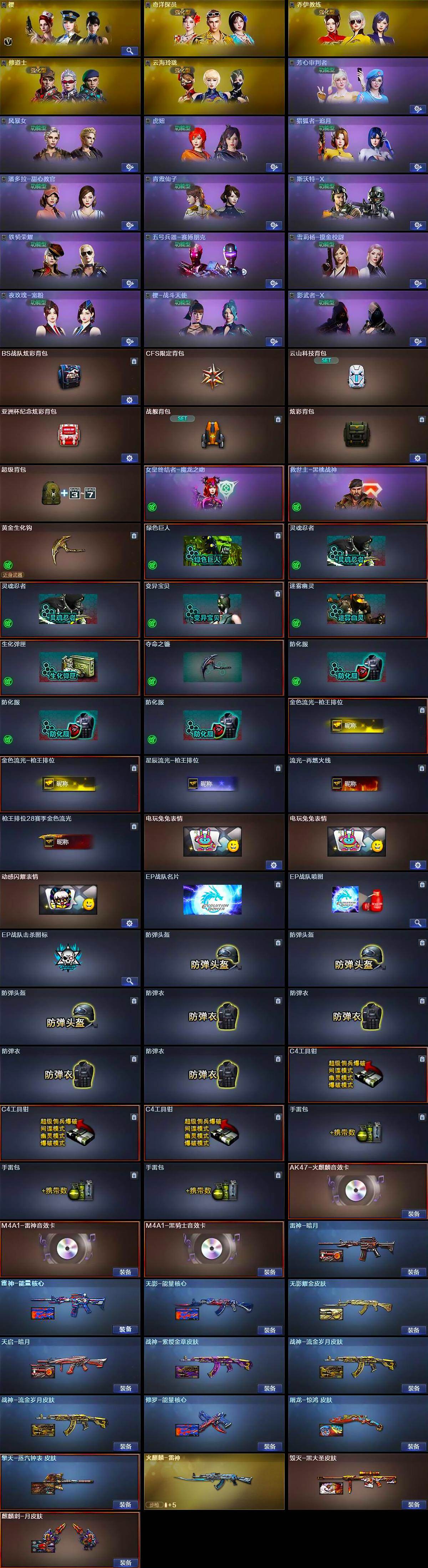 【道具】:BS战队炫彩背包,CFS限定背包,云山科技背包,亚洲杯纪念炫彩背包,战舰背包,炫彩背包,超级背包,女皇终结者-魔龙之吻,救世主-黑桃战神,黄金生化钩,绿色巨人,灵魂忍者*2,变异宝贝,迷雾幽灵,生化弹匣,夺命之镰,防化服*3,金色流光-枪王排位*2,星辰流光-枪王排位,流光-再燃火线,枪王排位28赛季金色流光,电玩兔兔表情*2,动感闪耀表情,EP战队名片,EP战队喷图,EP战队击杀图标,防弹头盔*3,防弹衣