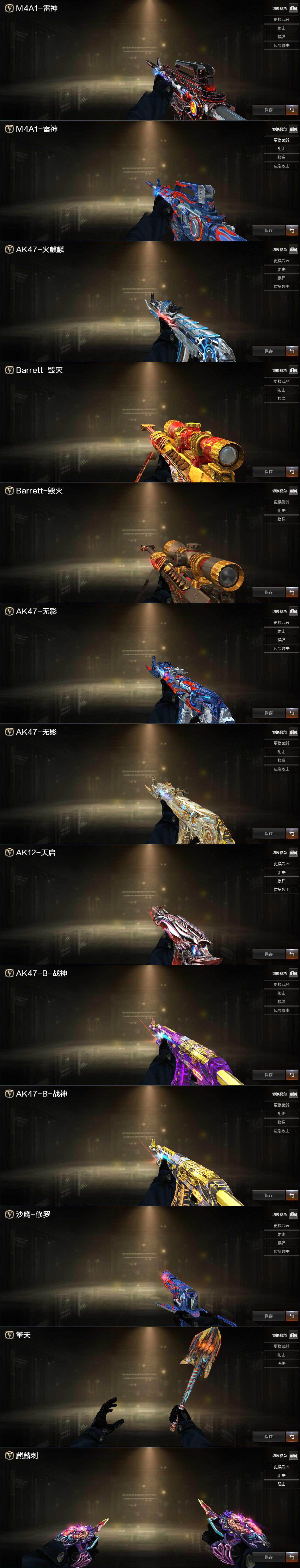 【英雄级武器】:AK47-火麒麟,M4A1-黑龙,M4A1-雷神*2,M4A1-黑骑士,AK47-无影,M4A1-死神*2,AK47-黑武士,M4A1-龙血,黑武士-锦绣游龙,M4A1-玫瑰精灵,QBZ03-金色蔷薇,王者之影-觉醒版,AK-47-猩红传说,黑骑士-海王*2,AK47-B-常胜将军*2,白虎-电玩蓝兔,AWM-天龙*2,Barrett-毁灭,Barrett-极光,AWM-裁决,RPK-盘龙,炼狱-悦蓝-觉醒版,沙鹰-修罗*6,屠龙*2,龙啸,擎天,麒麟刺,闪光弹-雷霆王者-觉醒版,M4A1-赤狱骑士