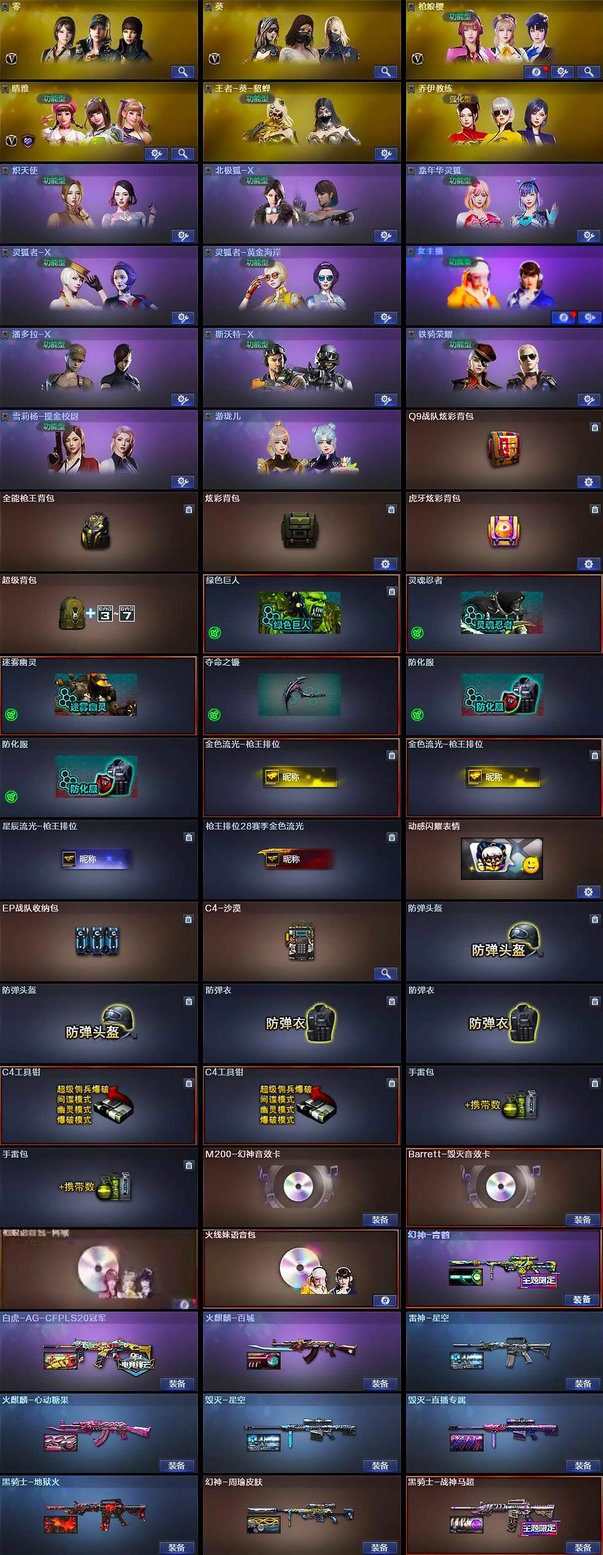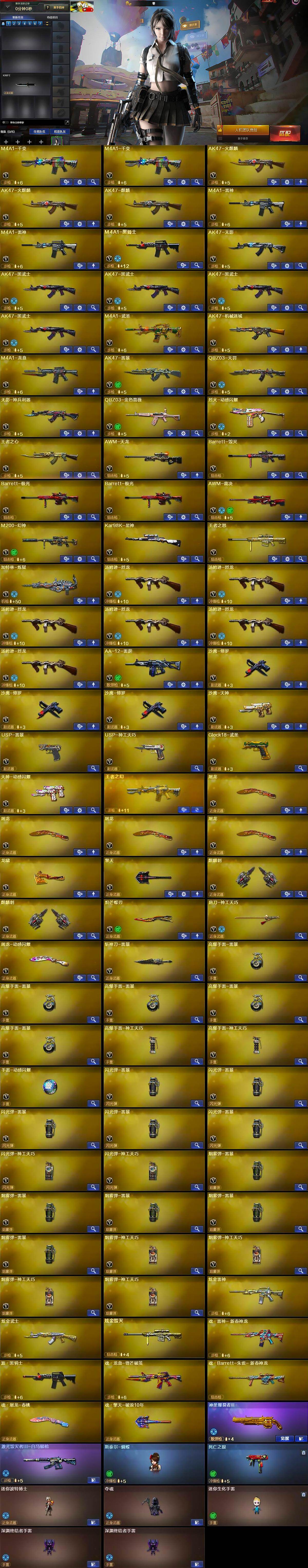 【英雄级武器】:M4A1-千变*2,AK47-火麒麟*2,AK47-麒麟,M4A1-雷神*2,M4A1-黑骑士,AK47-无影,AK47-黑武士*4,M4A1-武圣,AK47-机械迷城,M4A1-龙血,AK47-雷暴,QBZ03-天罚,无影-神兵利器,QBZ03-金色蔷薇,烈火-动感闪耀,王者之心-觉醒版,AWM-天龙,Barrett-毁灭,Barrett-极光*2,AWM-裁决,M200-幻神,Kar98K-星神,王者之怒-觉醒版,加特林-炼狱,汤姆逊-烈龙*6,AA-12-雷霆,沙鹰-修罗*3,沙鹰-天神,USP-雷暴,USP-神工天巧,Glock18-武圣,天神-动感闪耀,屠龙*4,龙啸,擎天,麒麟刺*2,炽芒蝶刃,唐刀-神工天巧,屠龙-动感闪耀,斩神刀-雷暴,高爆手雷-雷暴*5,高爆手雷-神工天巧*2,手雷-动感闪耀,闪光弹-雷暴*5,闪光弹-神工天巧*2,烟雾弹-雷暴*5,烟雾弹-神工天巧*4