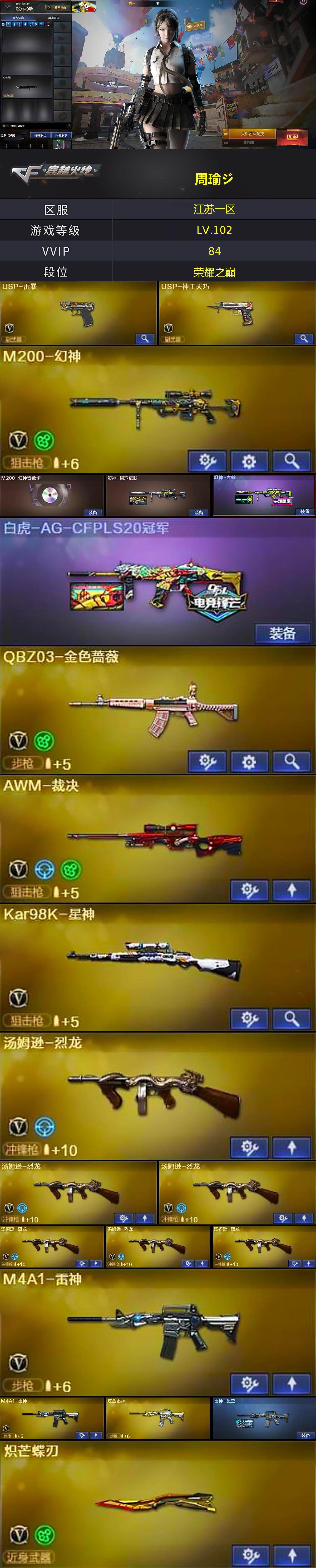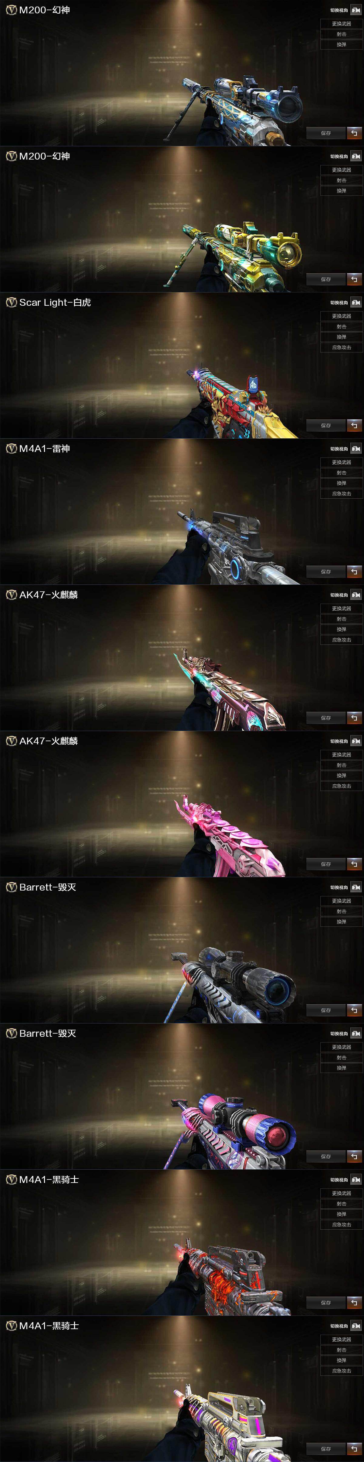 【热门武器】:QBZ03-金色蔷薇,M200-幻神,死亡之眼,Kar98K-星神,M4A1-黑骑士,汤姆逊-烈龙*6,加特林-炼狱,斯泰尔-蝴蝶,USP-雷暴,沙鹰-修罗*3,炽芒蝶刃