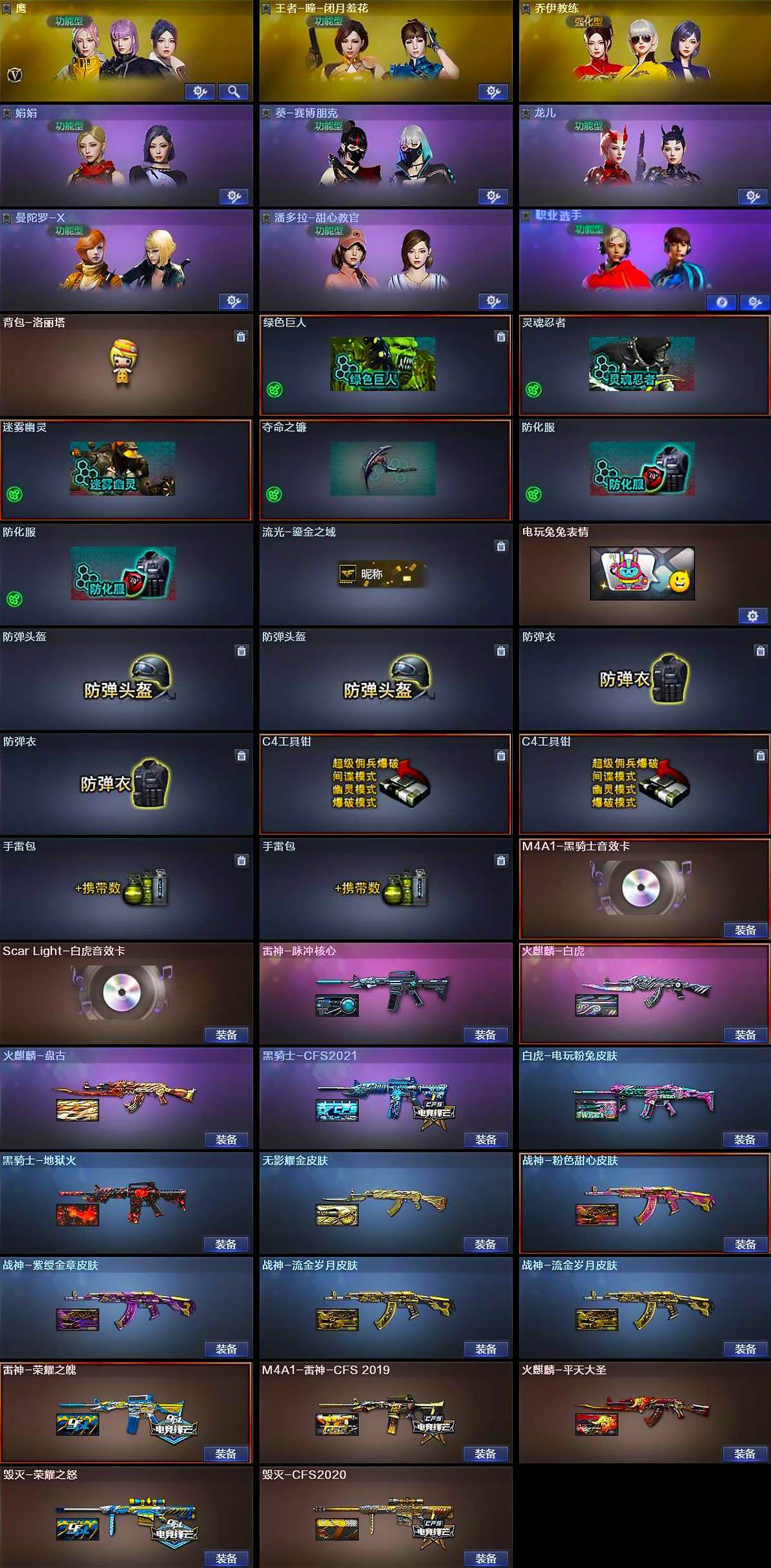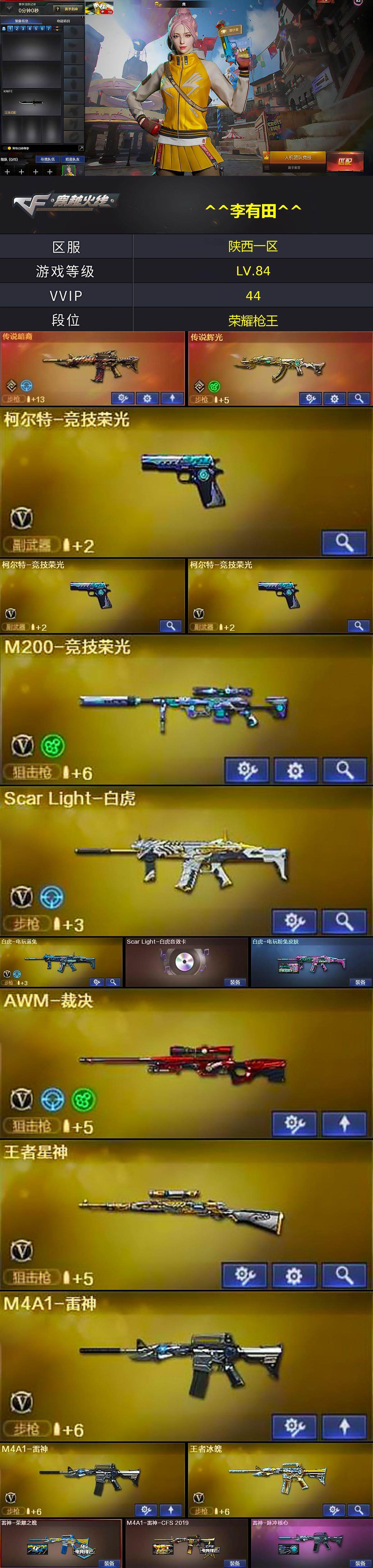 【皮肤】:白虎-电玩粉兔皮肤,雷神-荣耀之魄,M4A1-雷神-CFS 2019,雷神-脉冲核心,火麒麟-平天大圣,火麒麟-盘古,火麒麟-白虎,毁灭-荣耀之怒,毁灭-CFS2020,毁灭-英雄计划 皮肤,黑骑士-地狱火,黑骑士-CFS2021,无影耀金皮肤,战神-粉色甜心皮肤,战神-紫绶金章皮肤,战神-流金岁月皮肤*2