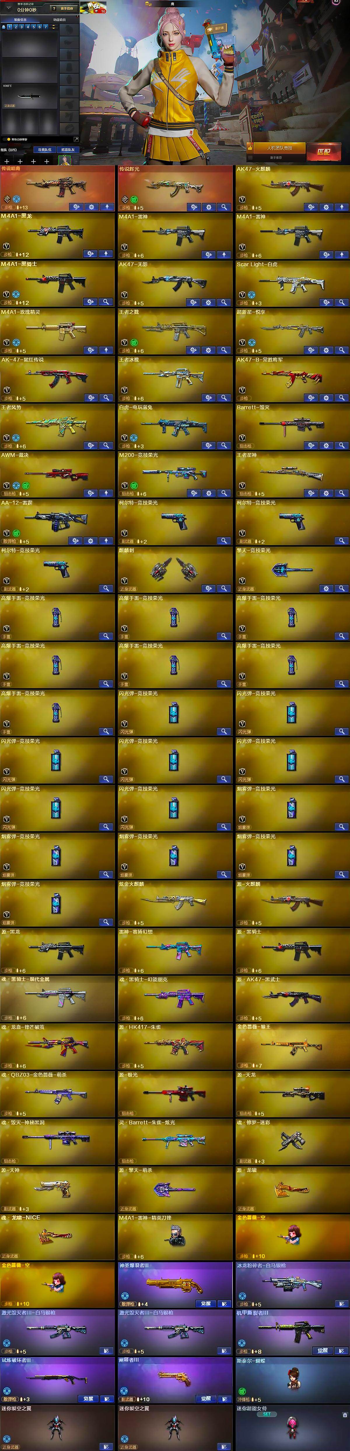 【英雄级武器】:AK47-火麒麟,M4A1-黑龙,M4A1-雷神*2,M4A1-黑骑士,AK47-无影,Scar Light-白虎,M4A1-玫瑰精灵,王者之戮-觉醒版,超新星-悦享-觉醒版,AK-47-猩红传说,王者冰魄-觉醒版,AK47-B-常胜将军,王者风势-觉醒版,白虎-电玩蓝兔,Barrett-毁灭,AWM-裁决,M200-竞技荣光,王者星神-觉醒版,AA-12-雷霆,柯尔特-竞技荣光*3,麒麟刺,擎天-竞技荣光,高爆手雷-竞技荣光*7,闪光弹-竞技荣光*7,烟雾弹-竞技荣光*5